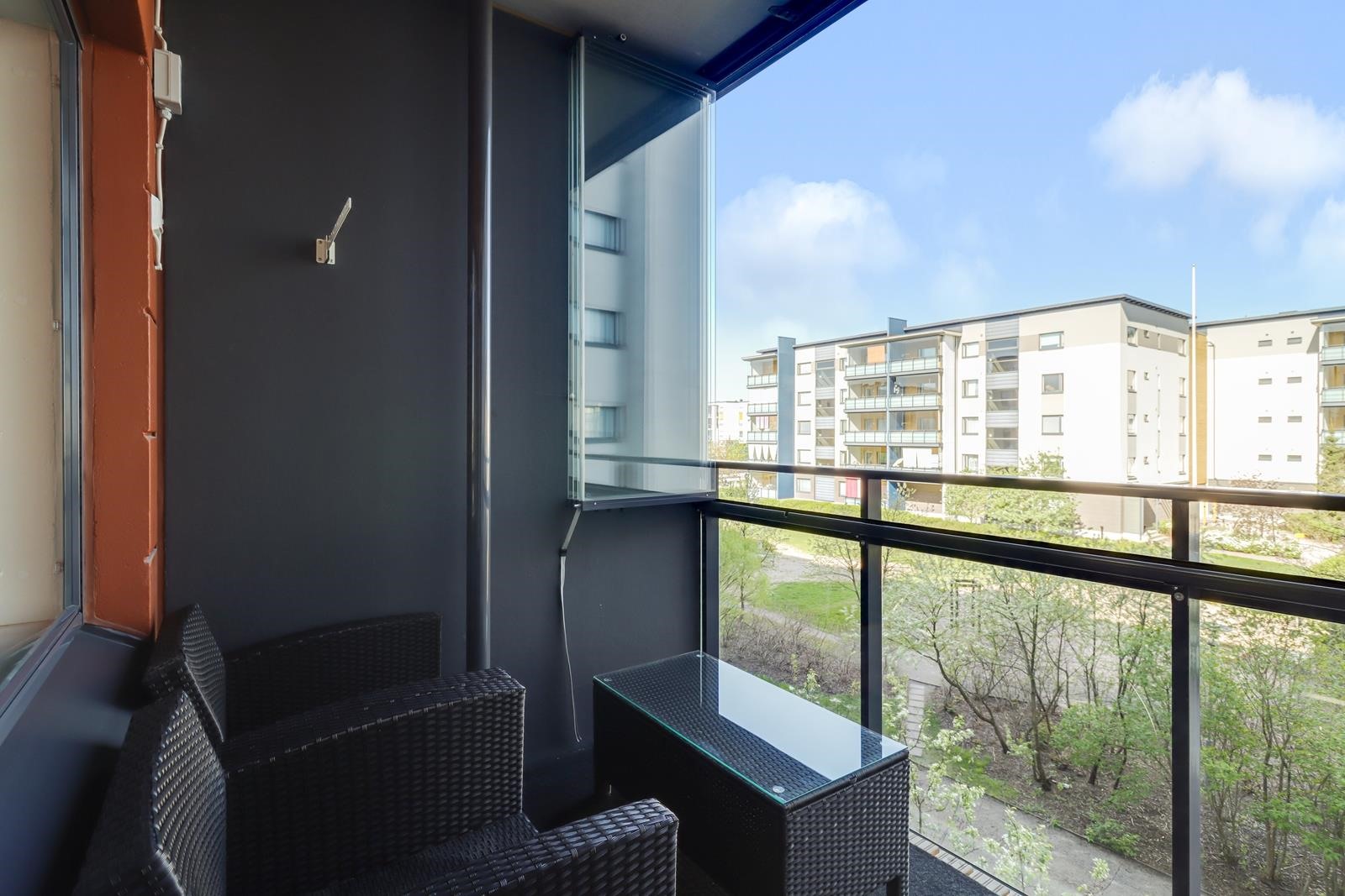 - Huoneiston ikkunat ja tilava parveke avautuvat luoteeseen, tarjoten ilta-auringon valaisemat näkymät viihtyisälle ja vehreälle piha-alueelle. Näkymät ovat rauhalliset ja suojaisat.