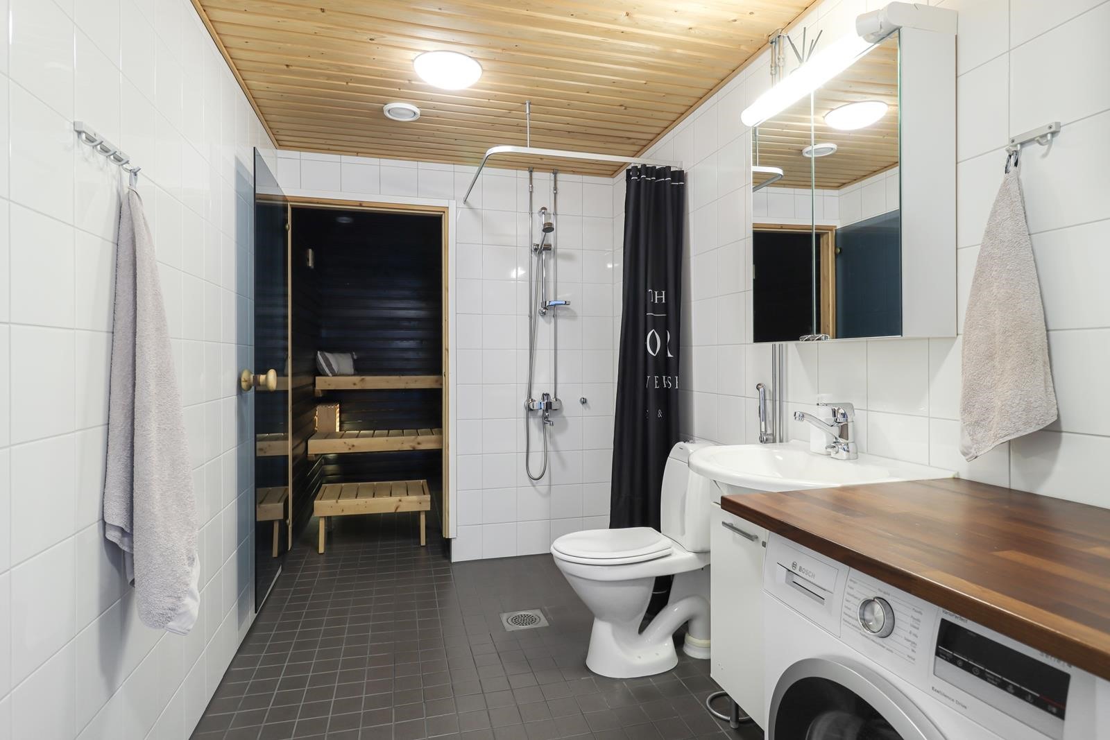 - Rentouttava sauna ja käytännöllinen kylpyhuone Asunnon oma sauna on varustettu sähkökiukaalla ja tarjoaa mukavat puitteet rentoutumiseen. Kylpyhuoneessa on suihku, peilikaappi, allaskaappi sekä lisäkaapistoja säilytystarpeisiin. Pesukoneliitäntä mahdollistaa arjen sujuvuuden, ja sähköinen lattialämmitys tuo lisämukavuutta. Kiinteät valaisimet huolehtivat hyvästä yleisvalaistuksesta.