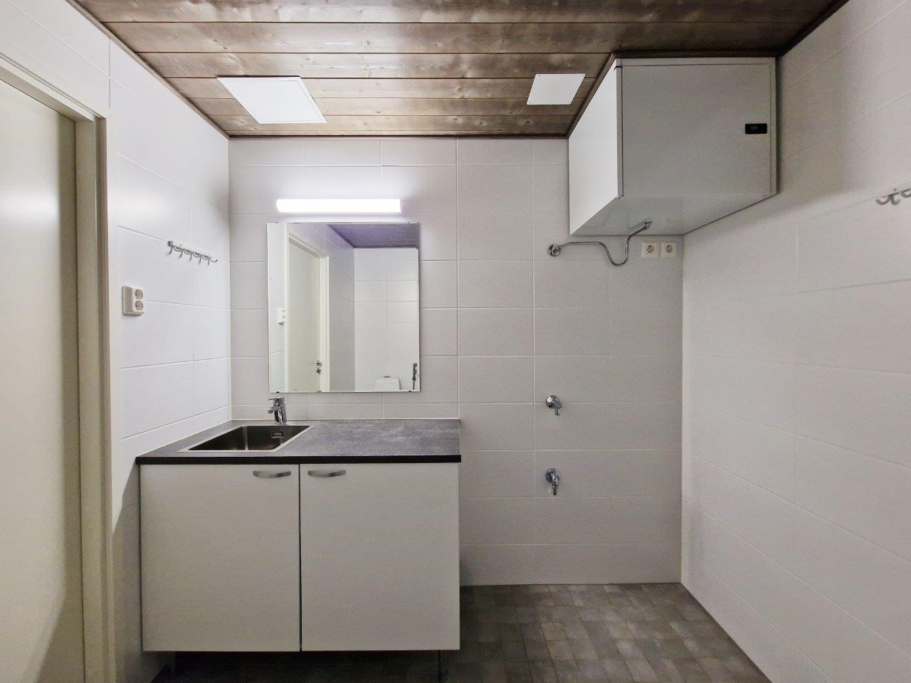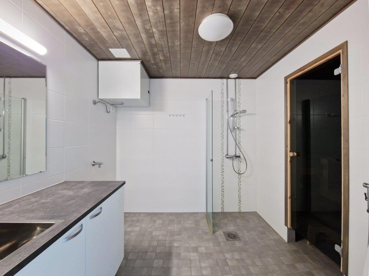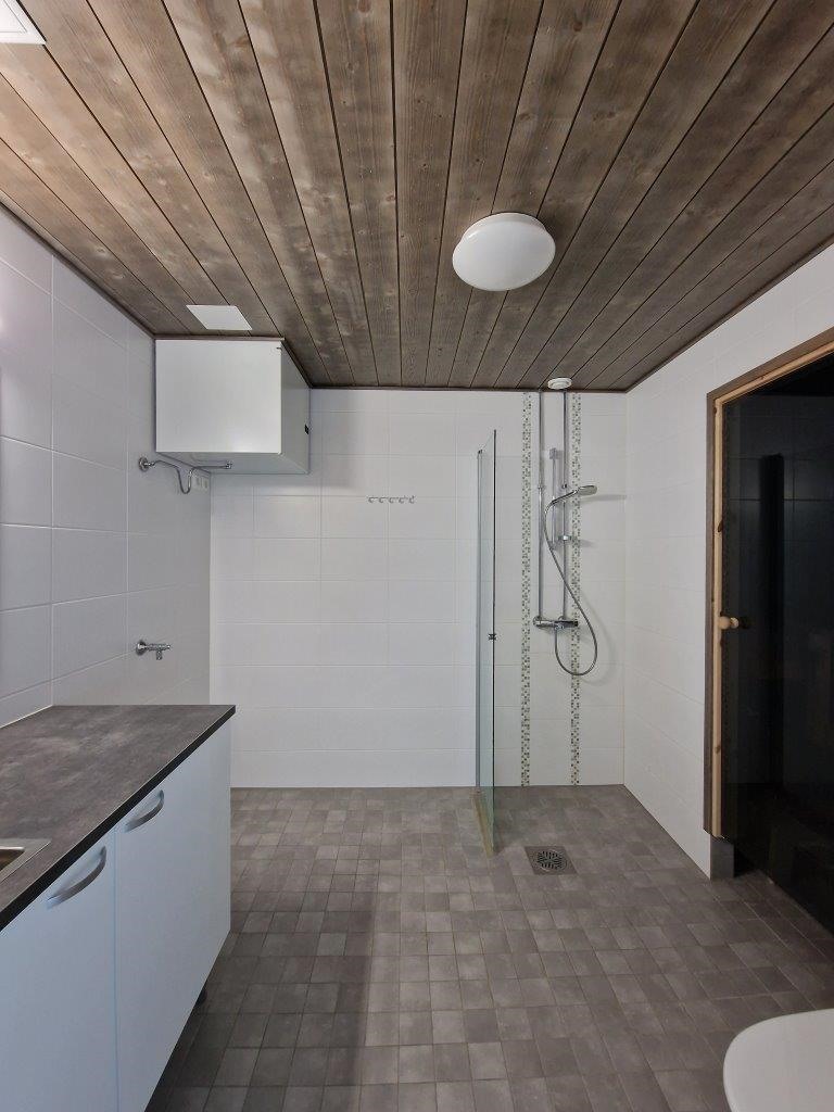 - Sauna, sähkökiuas, kylpyhuone, suihku, suihkuseinä, peilit, kaapit, pesukoneliitäntä, lattialämmitys, kiinteät valaisimet.