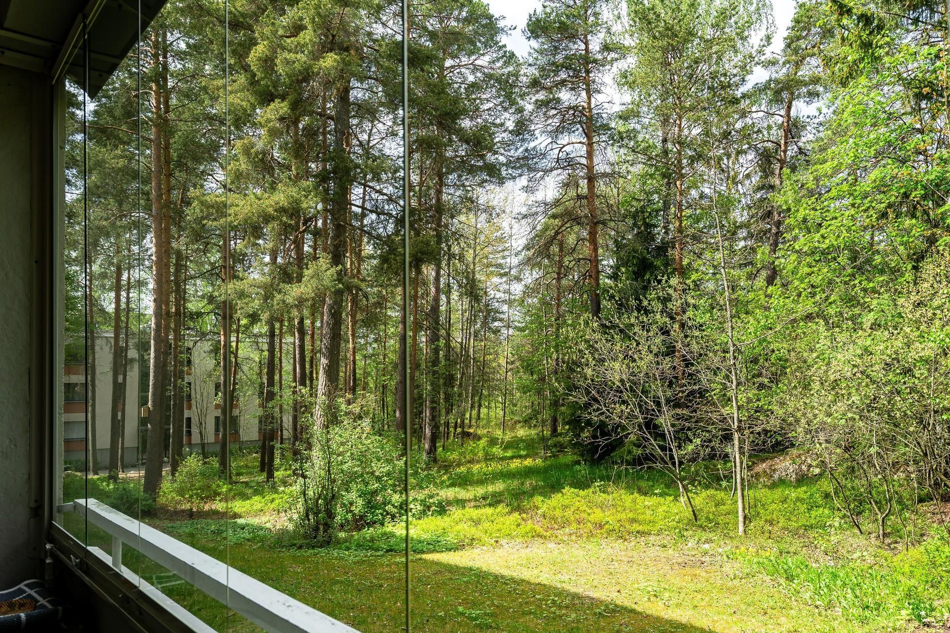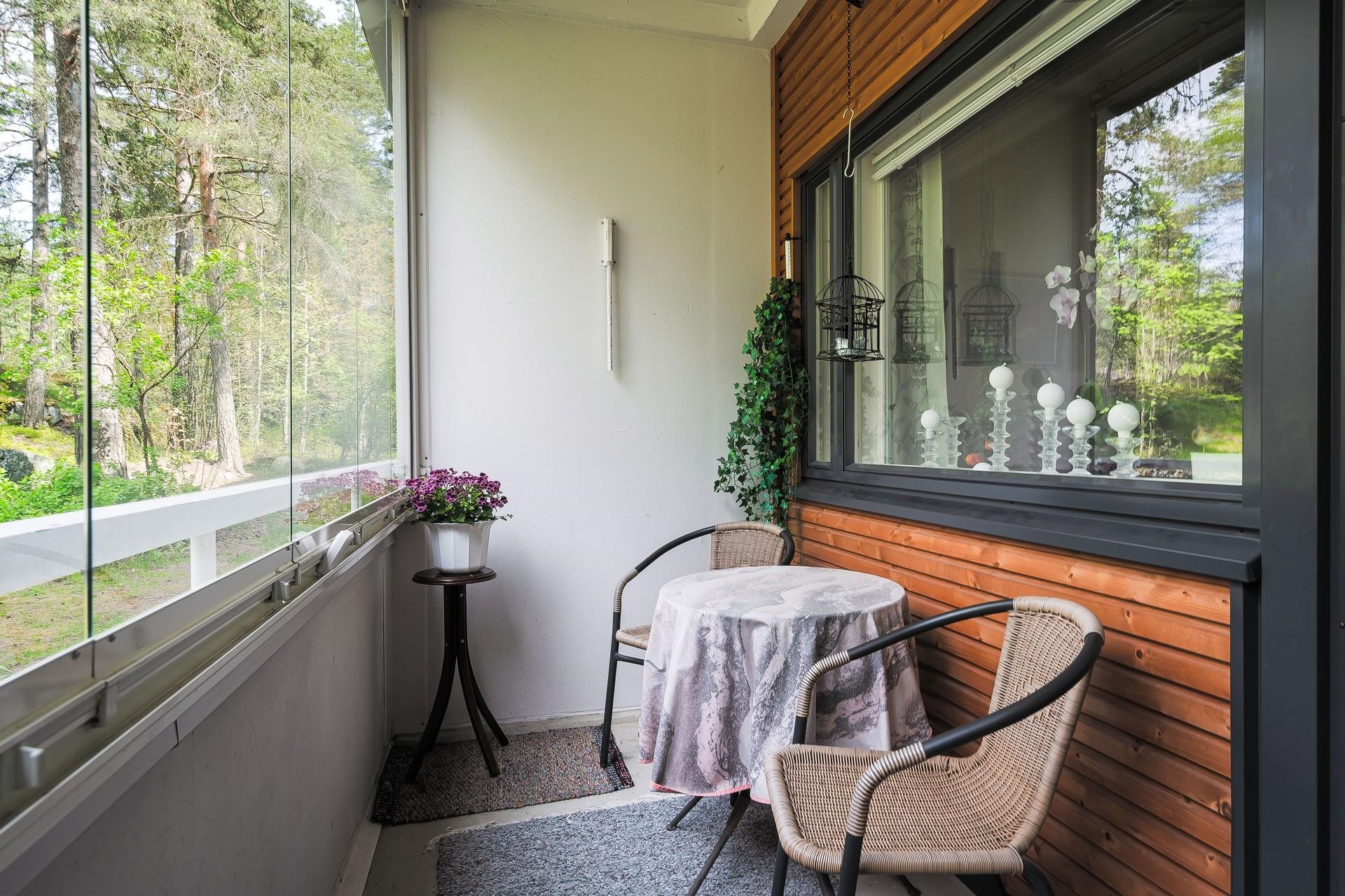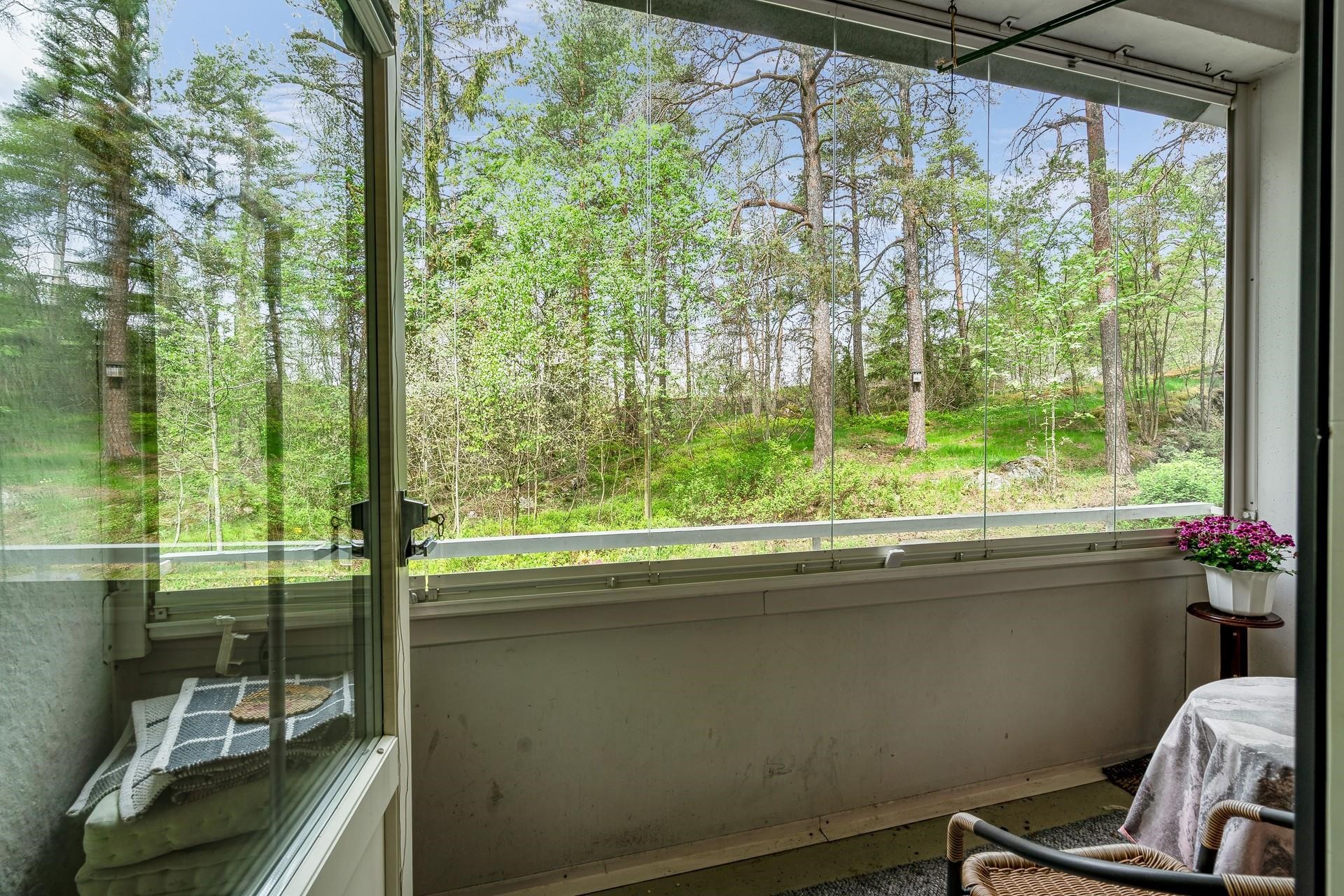Olohuoneen yhteydessä olevalla lasitetulta parvekkeelta aukeaa rauhallinen ja vehreä näkymä. Erilliseen keittiöön mahtuu ruokailuryhmä, sekä siellä on reilusti kaappi- ja laskutilaa.
