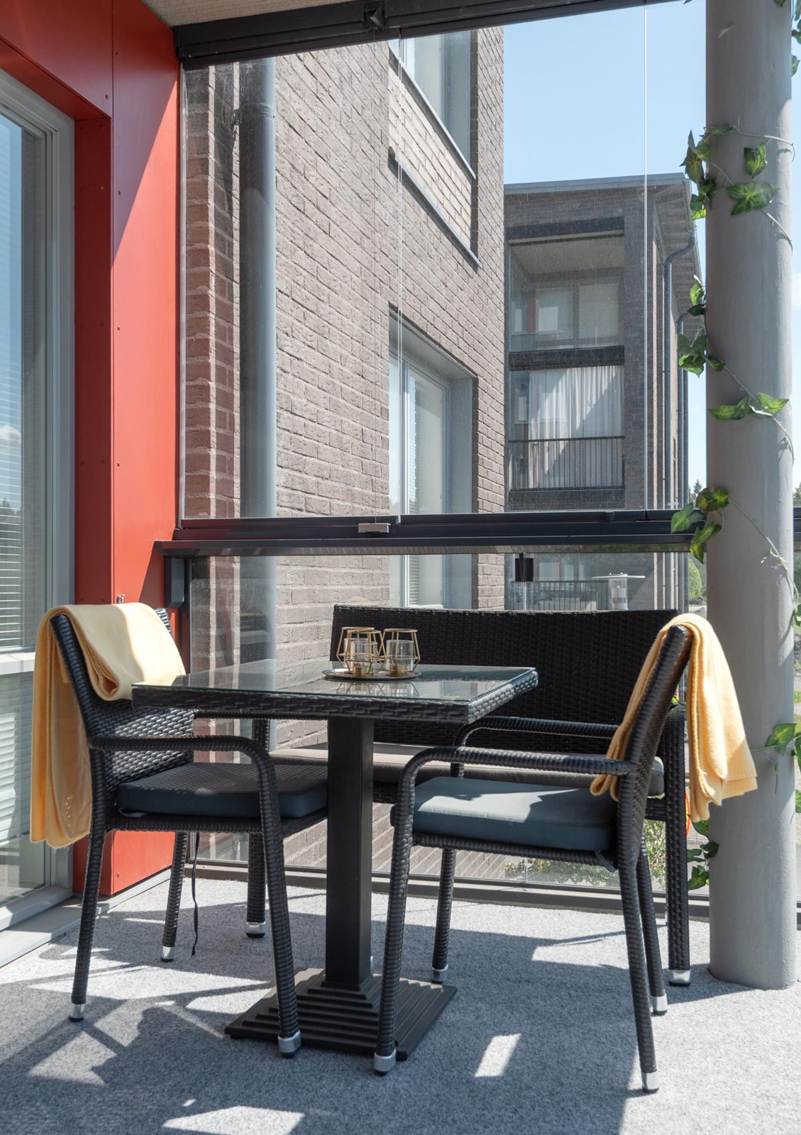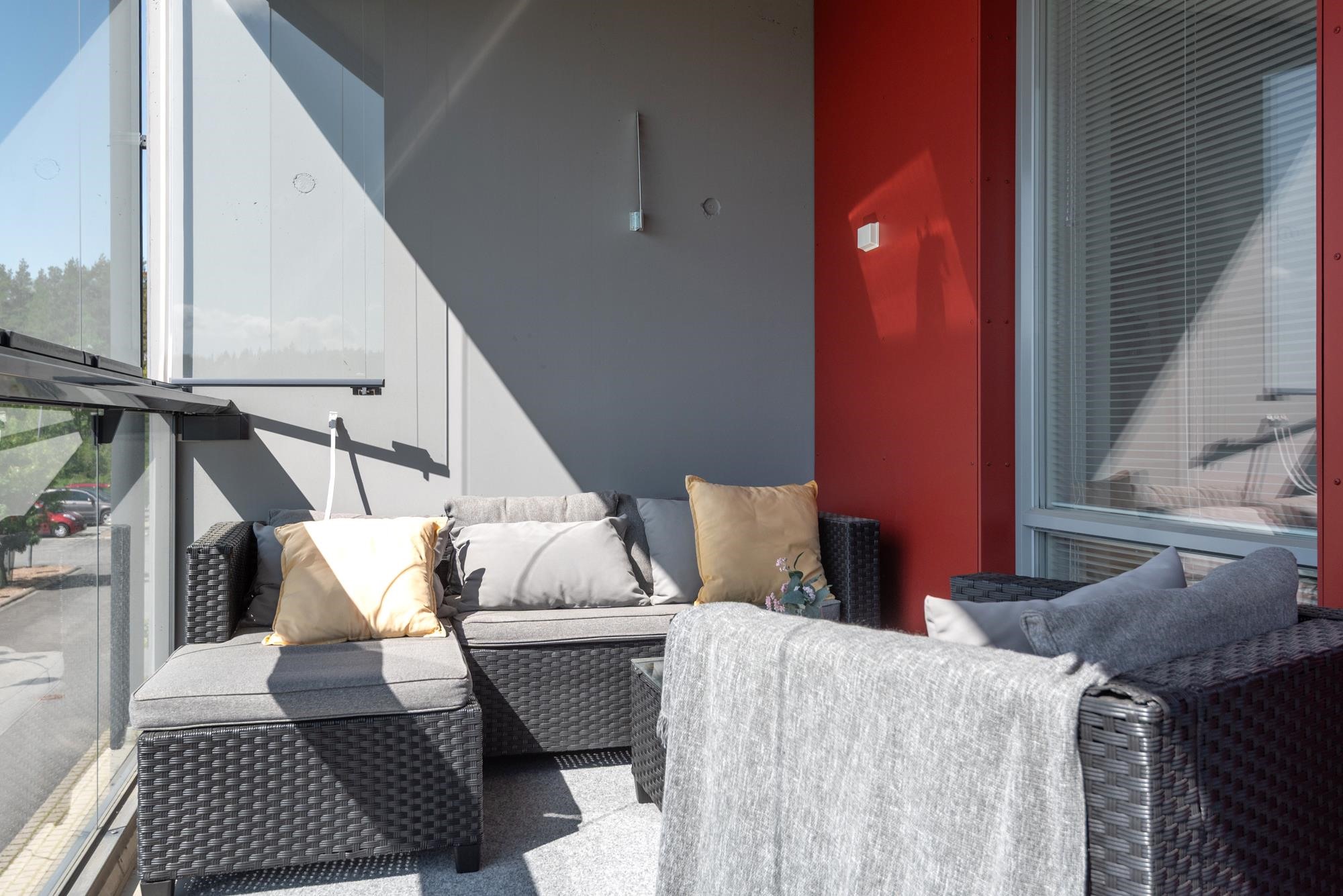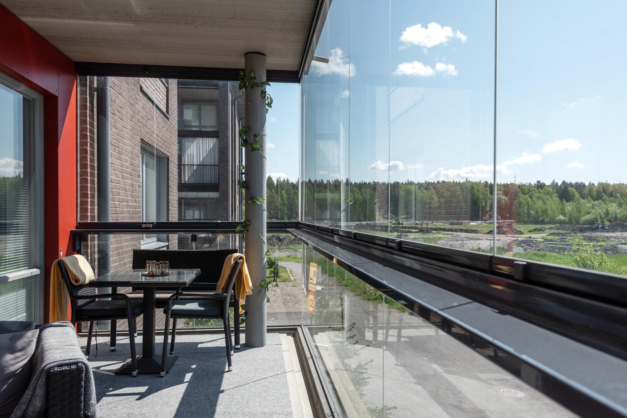 Erityistä asumismukavuutta tuo suuri lasitettu parveke, jonne aurinko paistaa koko päivän, täydellinen paikka nauttia aamukahvista tai kesäillasta.