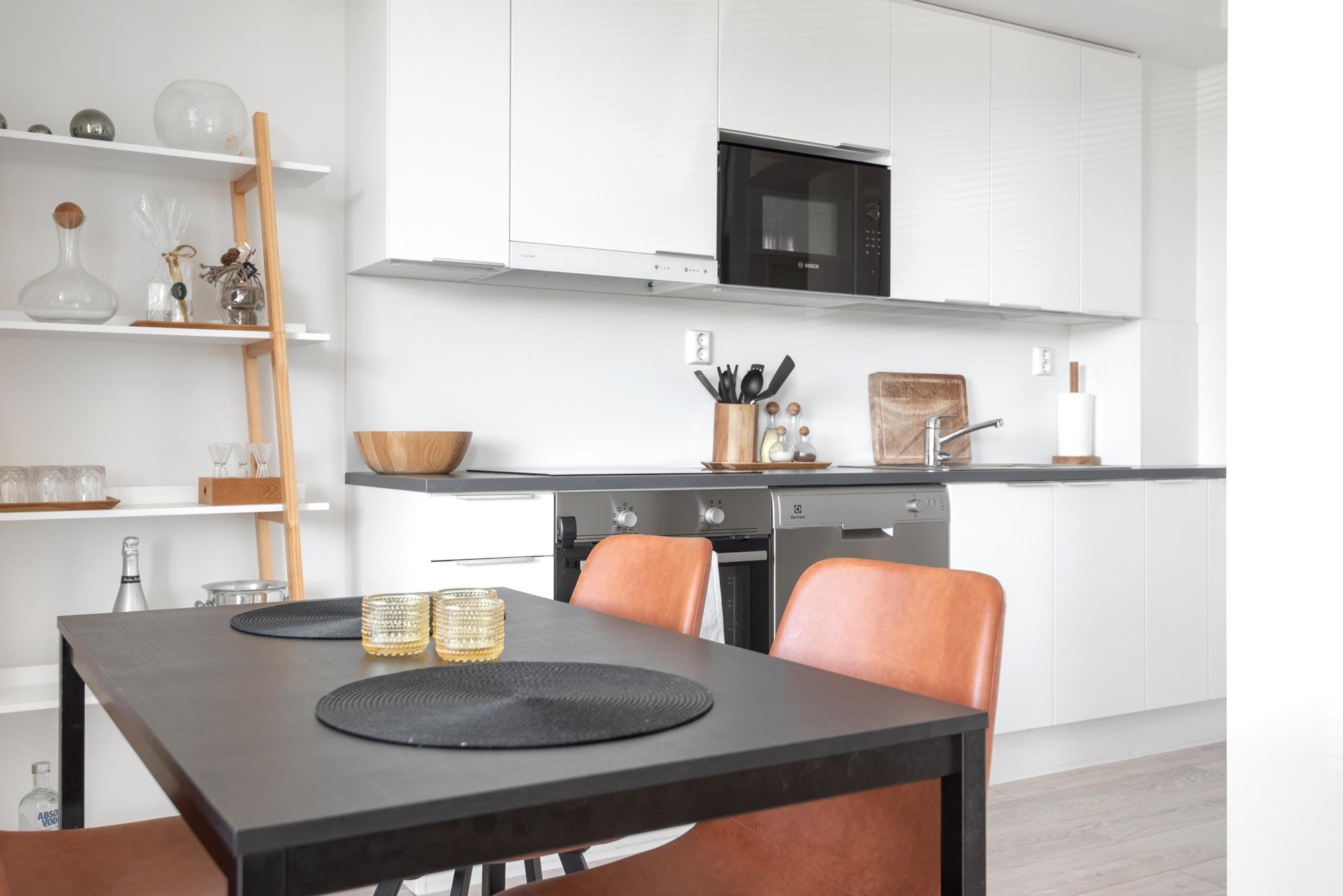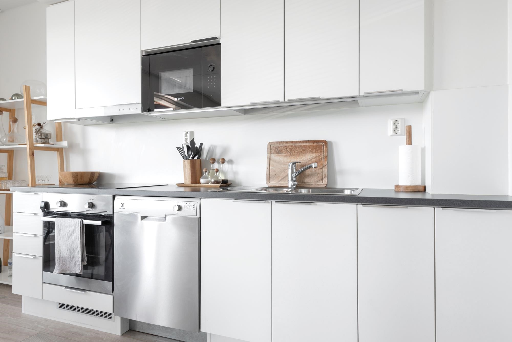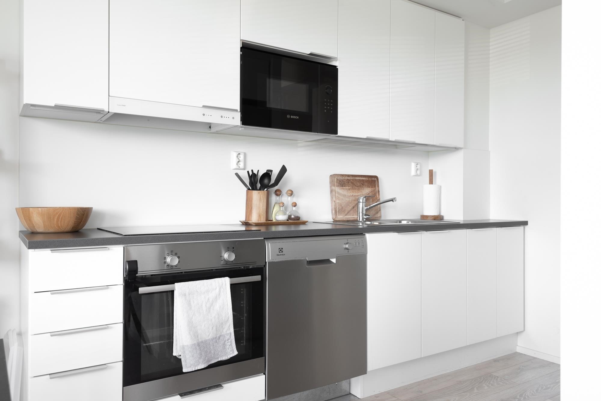 - Jääkaappipakastin, erillisuuni, induktioliesi, astianpesukone, kaapistot, kiinteät valaisimet.