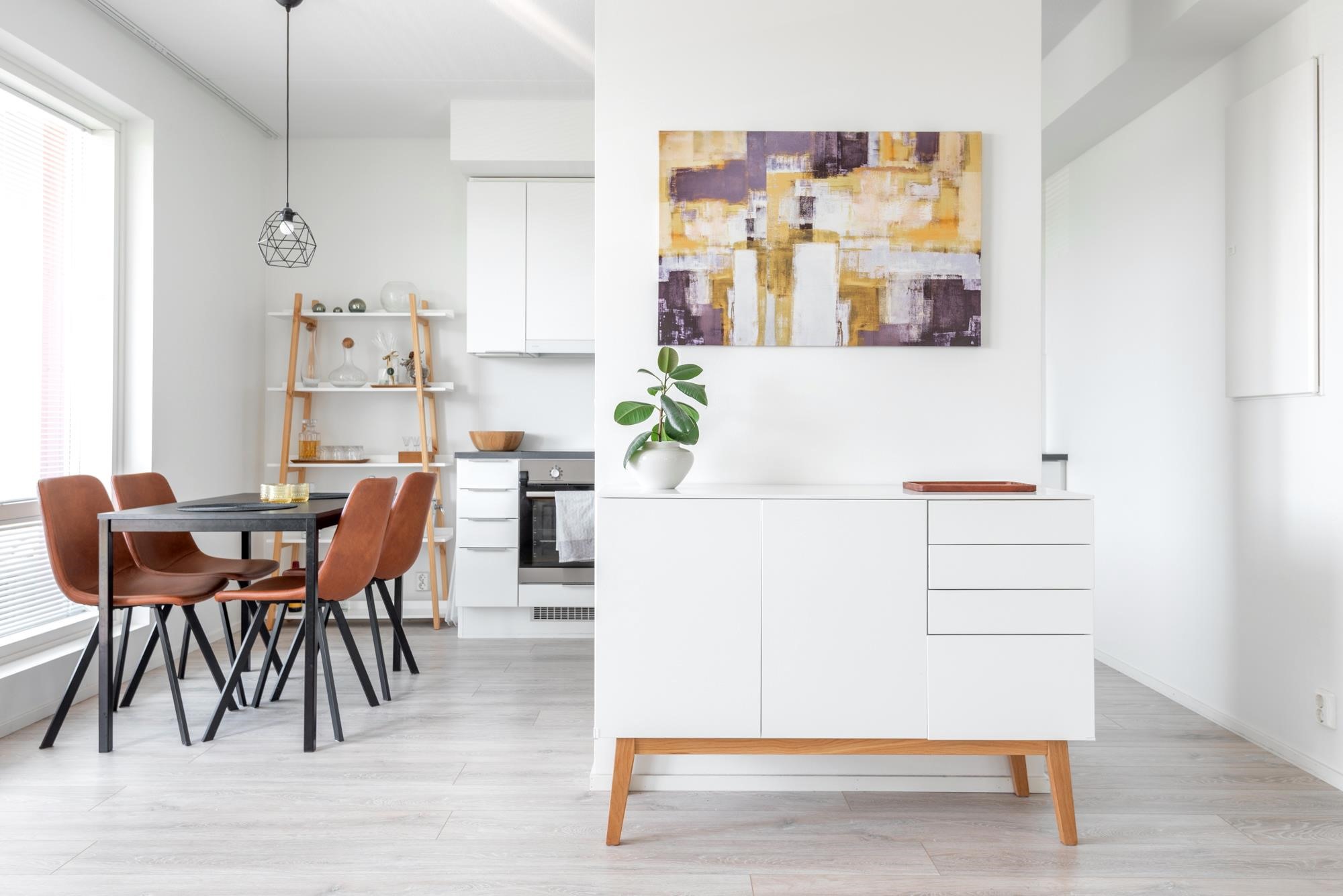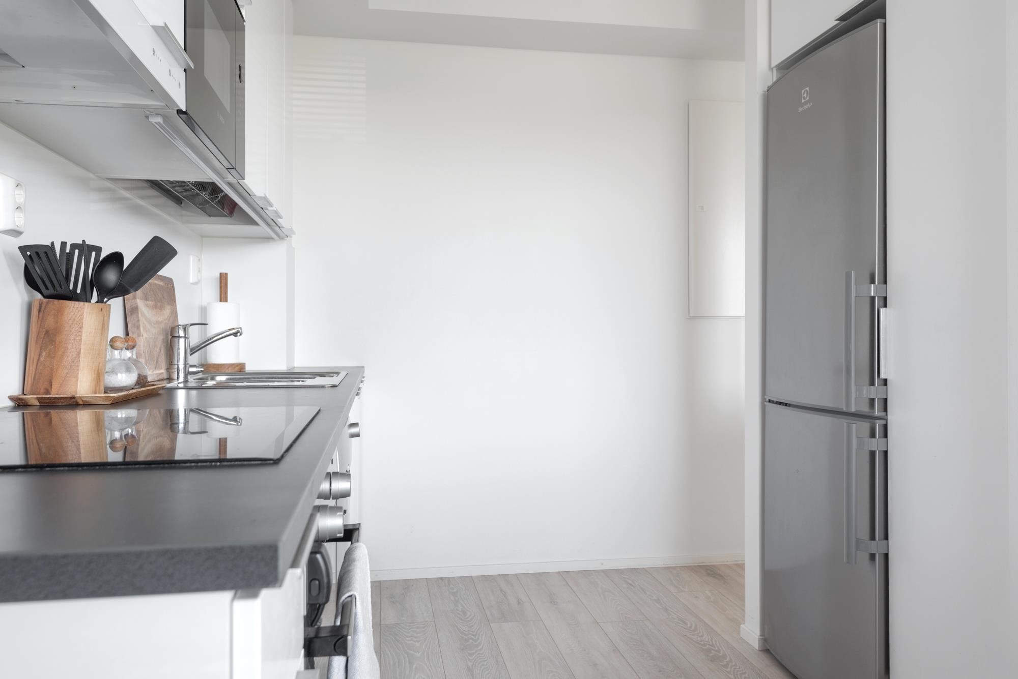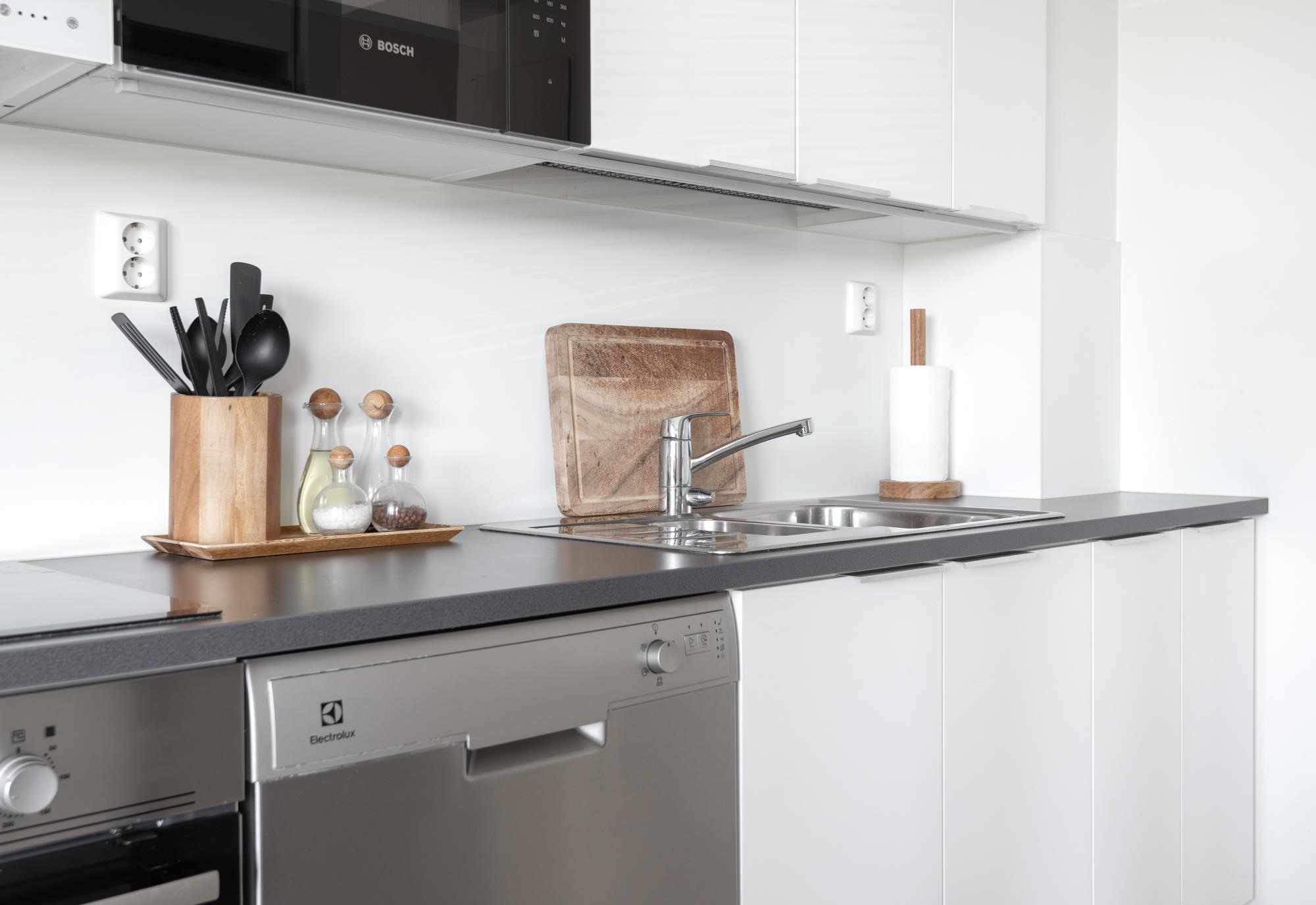 - Jääkaappipakastin, erillisuuni, induktioliesi, astianpesukone, kaapistot, kiinteät valaisimet.