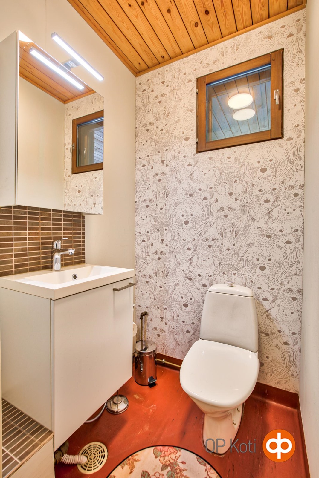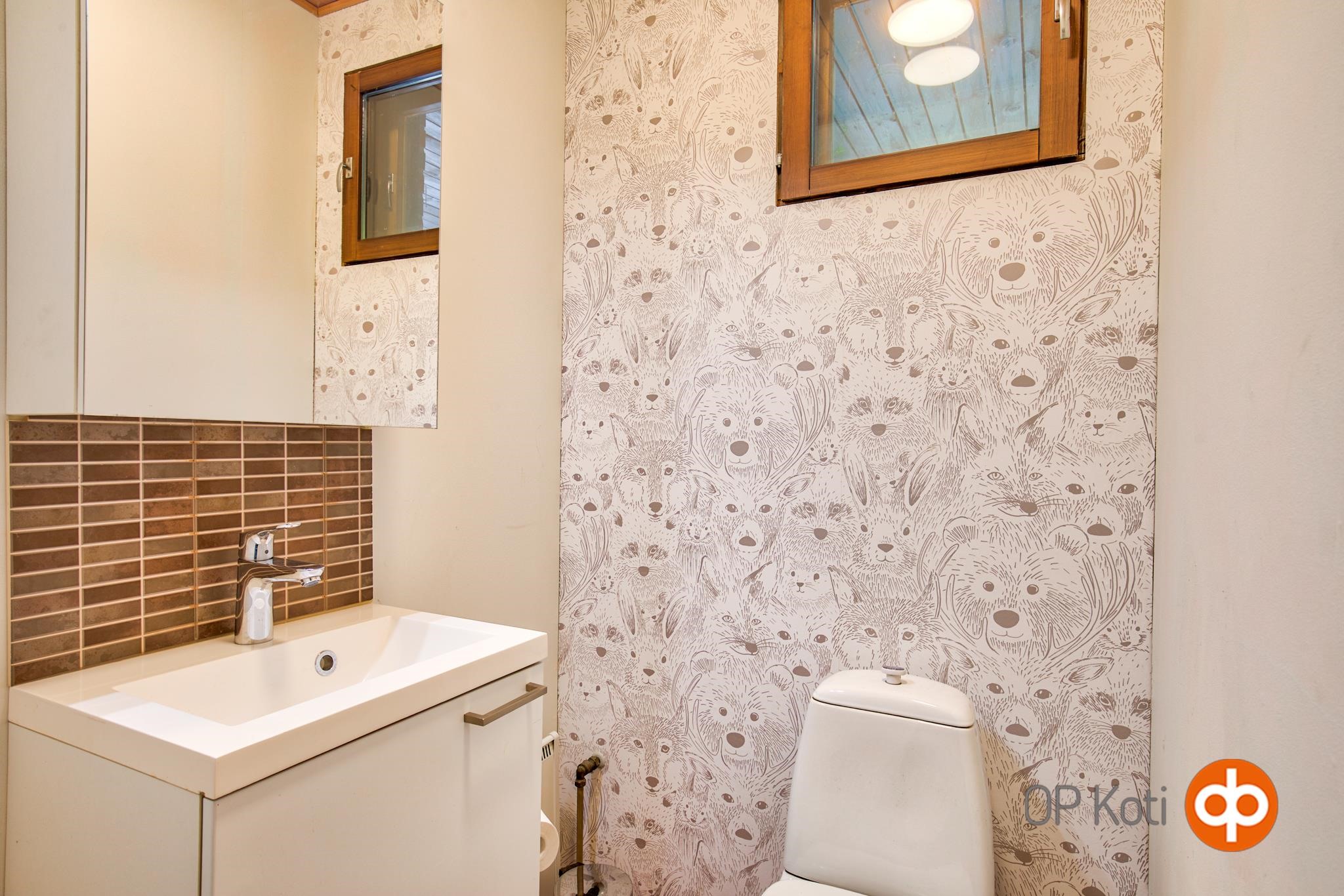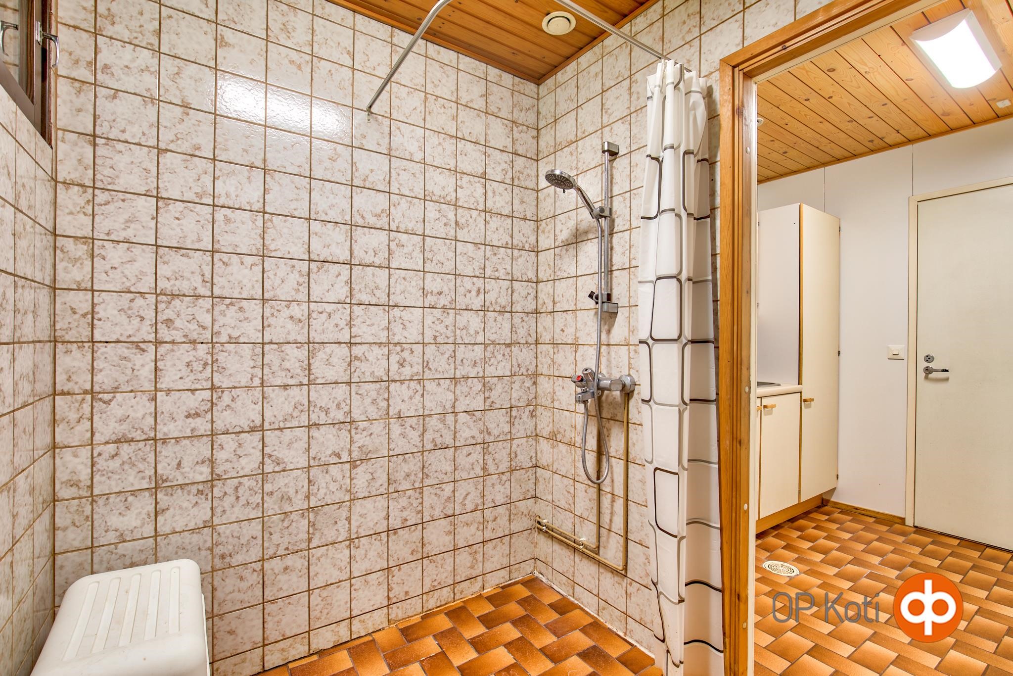 - Sauna, puukiuas, kylpyhuone, erillinen wc, suihku, peilikaappi, kaapit, allaskaappi, pesukoneliitäntä khh, lattialämmitys märkätilojen lattialämmityksen toimivuudesta ei tietoa, kiinteät valaisimet.