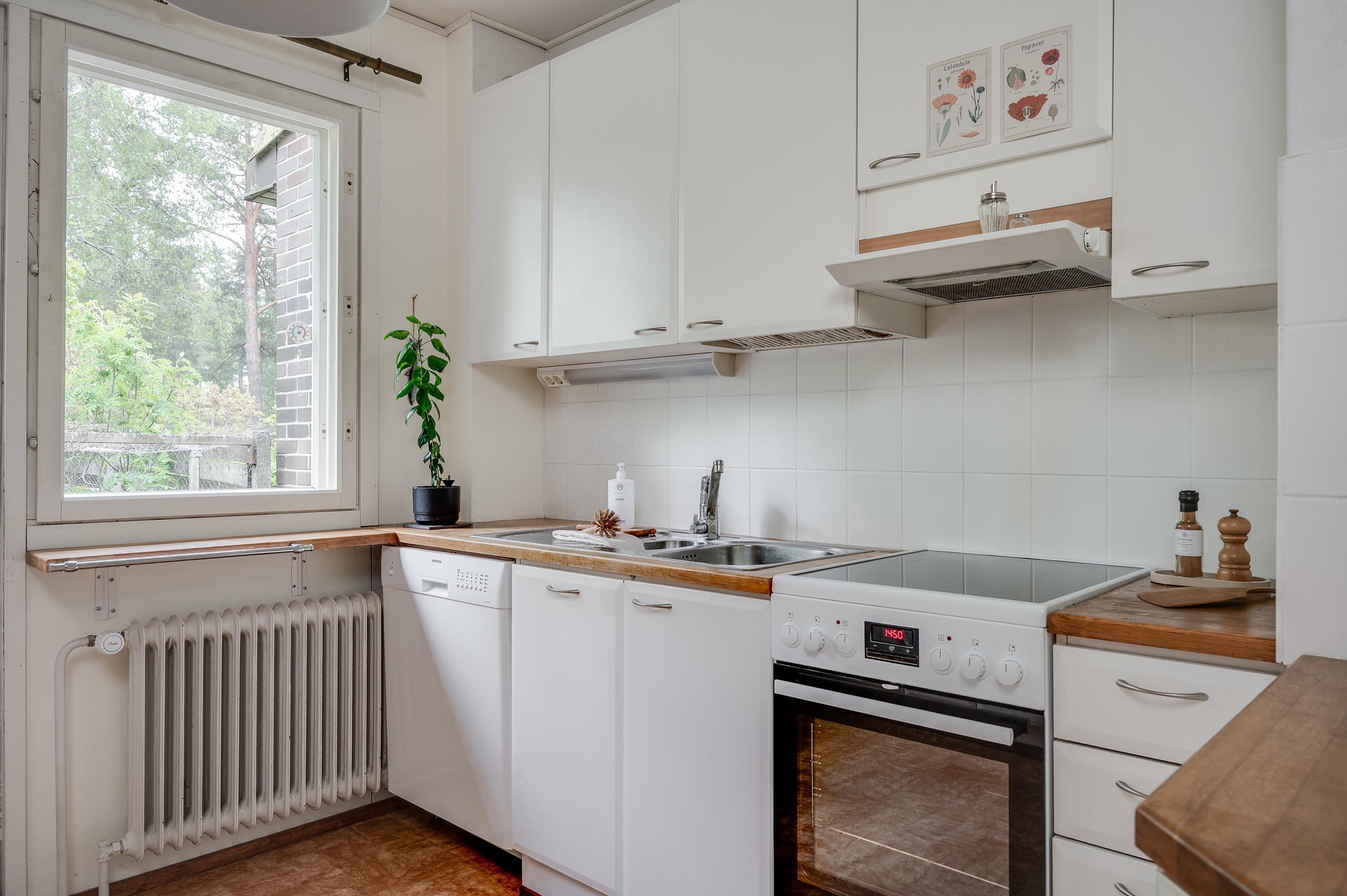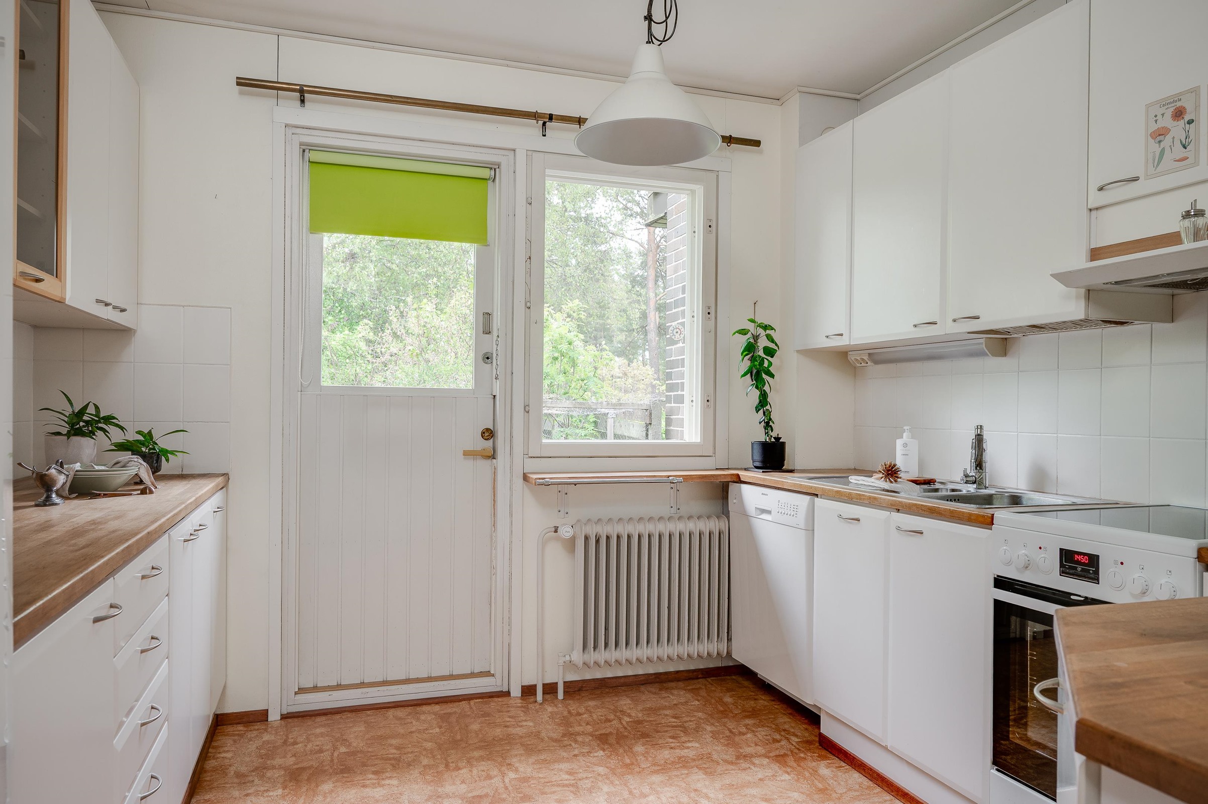 - Jääkaappi, keraaminen liesi, liesituuletin, astianpesukone, kaapistot, kiinteät valaisimet.