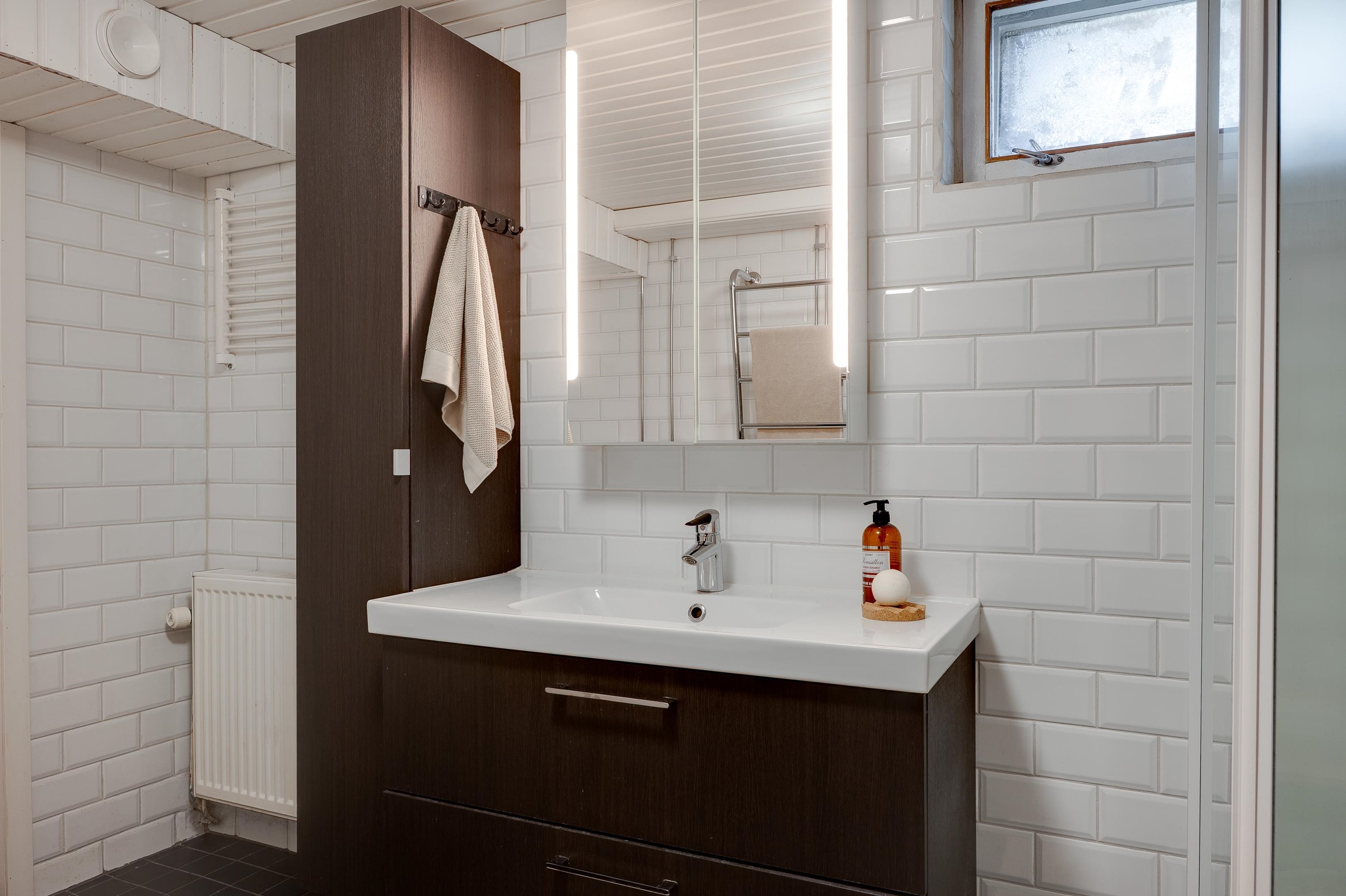 - Sauna, sähkökiuas, erillinen wc, suihku, suihkukaappi, amme, peilikaappi, kaapit, allaskaappi, pesukoneliitäntä, kiinteät valaisimet. Saunassa hormi ja valmius puulämmitteiselle kiukaalle. Alakerran kylpyhuoneessa lattialämmitys.
