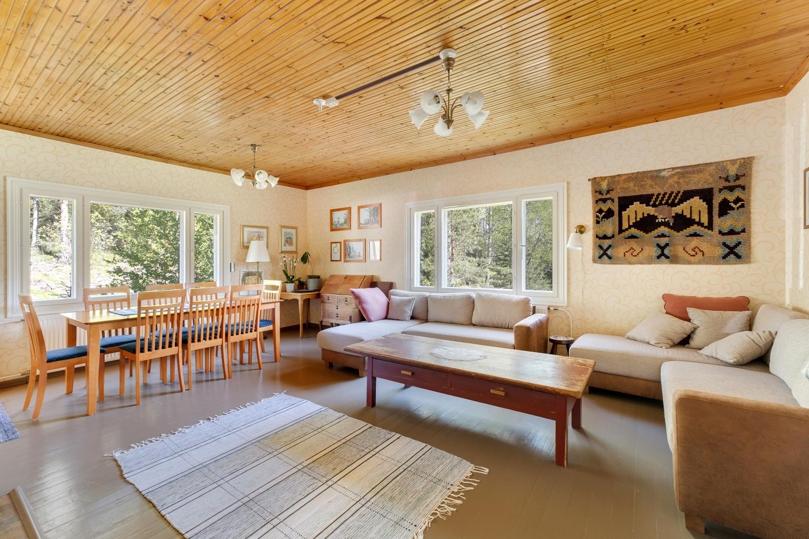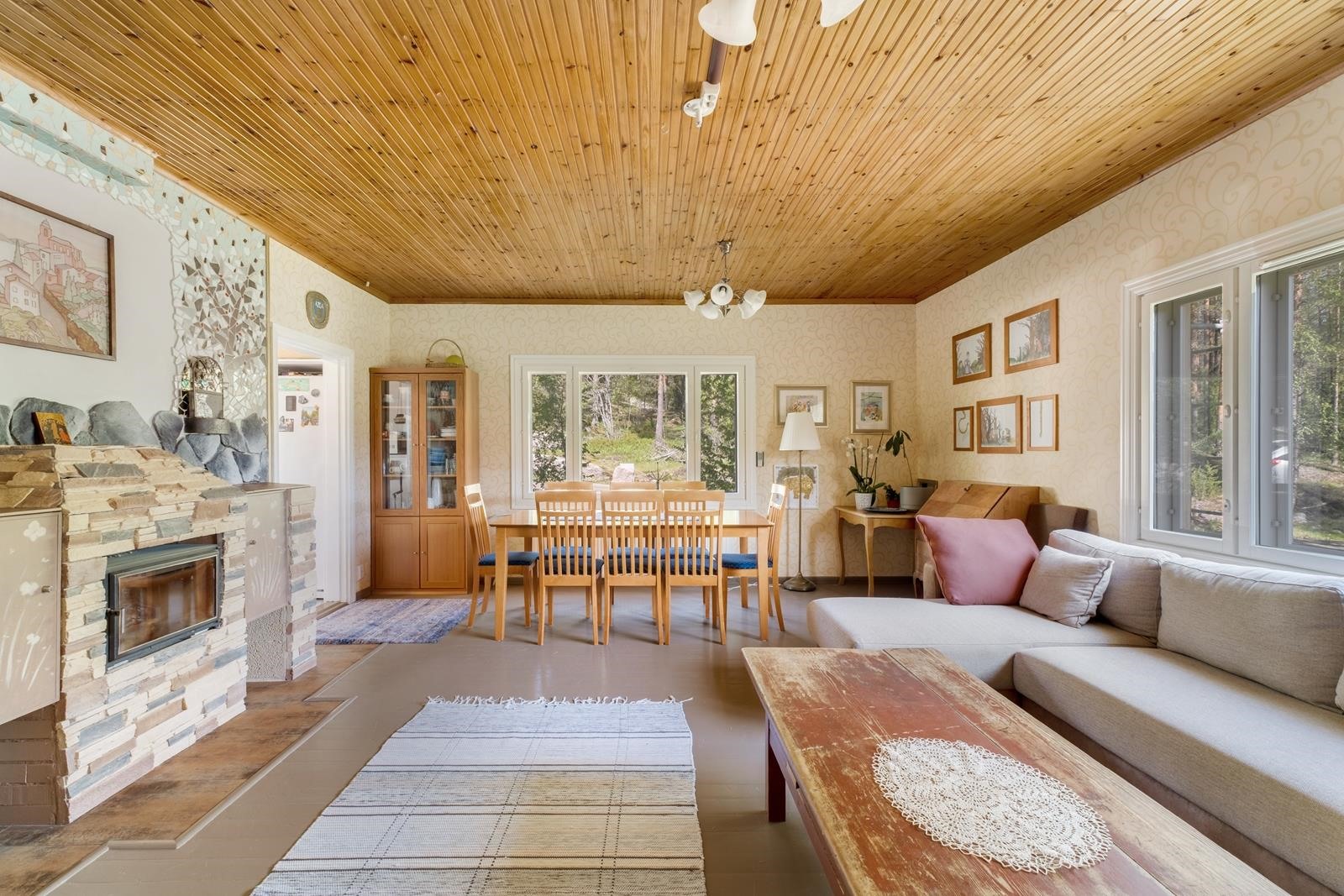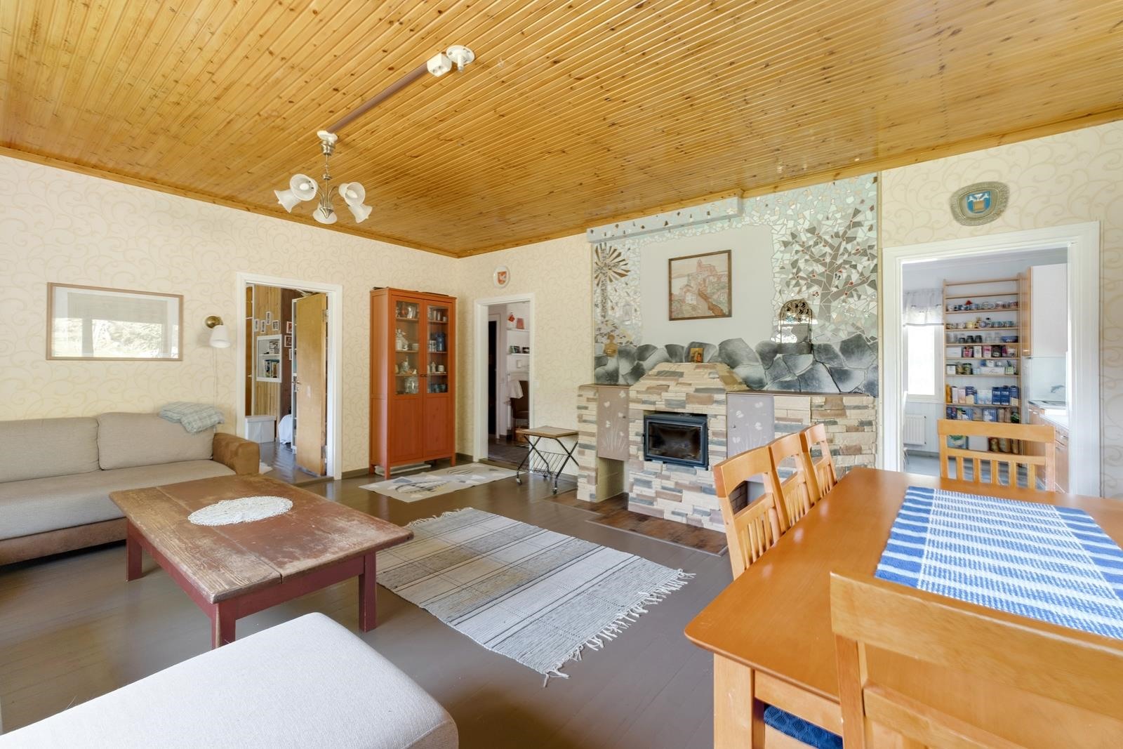Keittiö: Lattia: puulauta/laatta, seinät: puolipaneeli/maali/laatta/panssarilasi, katto: puupaneeli. Olohuone: Lattia: puulauta/laatta, seinät: tapetti/maali/mosaiikkilaatta, katto: puupaneeli. Makuuhuone 1: Lattia: puulauta, seinät: tapetti, katto: puupaneeli. Makuuhuone 2: Lattia: puulauta, seinät: tapetti, katto: Halltex. Makuuhuone 3: Lattia: puulauta/laminaatti, seinät: puulauta/tapetti/puupaneeli, katto: puupaneeli/maali. Kodinhoitohuone: Lattia: käsitelty betoni, seinät: maali/maalattu lasikuitutapetti, katto: maali. Sauna: Lattia: laatta, seinät: puupaneeli/kaakeli/graniitti, katto: puupaneeli. Kylpyhuone: Lattia: laatta, seinät: kaakeli, katto: maali. Eteinen: Lattia: puulauta, seinät: maalattu pinkopahvi/maalattu lasikuitutapetti, katto: puupaneeli. Wc: Lattia: muovimatto, seinät: puupaneeli/maalattu lasikuitutapetti, katto: puupaneeli. Makuuhuone 4: Lattia: laminaatti, seinät: tapetti/puupaneeli, katto: puupaneeli. Makuuhuone 5: Lattia: laminaatti, seinät: maali/puupaneeli, katto: puupaneeli. Makuuhuone 6: Lattia: laminaatti, seinät: maali/puupaneeli, katto: puupaneeli/maali. Yläkerran wc/kylpyhuone: Lattia: laatta, seinät: kaakeli, katto: vaneri/puupaneeli.