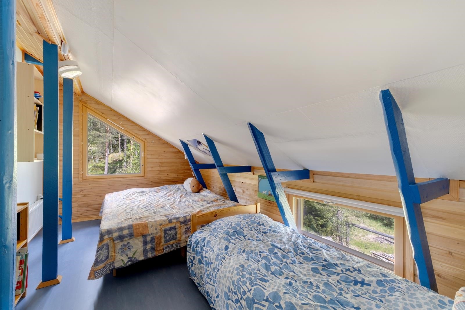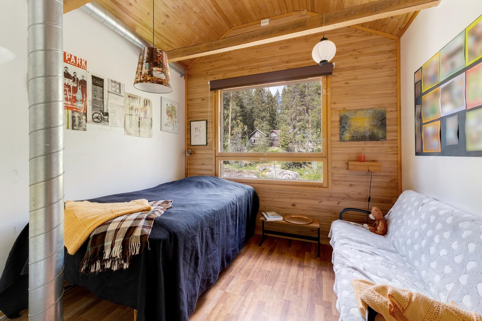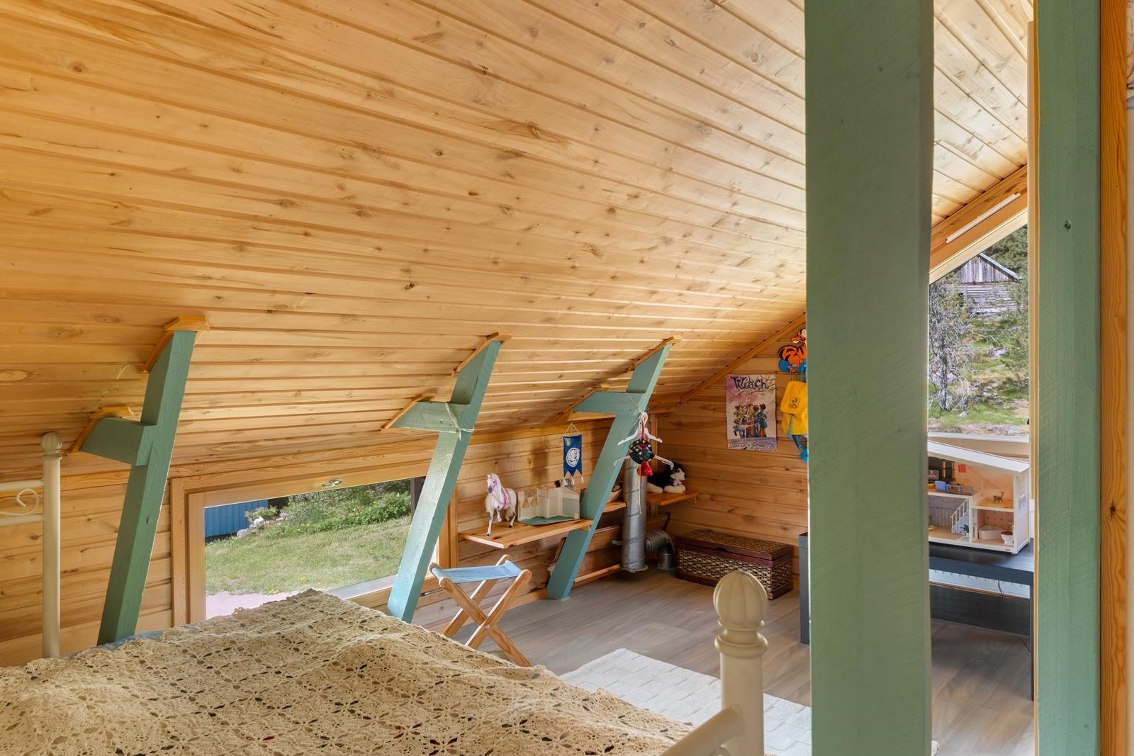 Keittiö: Lattia: puulauta/laatta, seinät: puolipaneeli/maali/laatta/panssarilasi, katto: puupaneeli. Olohuone: Lattia: puulauta/laatta, seinät: tapetti/maali/mosaiikkilaatta, katto: puupaneeli. Makuuhuone 1: Lattia: puulauta, seinät: tapetti, katto: puupaneeli. Makuuhuone 2: Lattia: puulauta, seinät: tapetti, katto: Halltex. Makuuhuone 3: Lattia: puulauta/laminaatti, seinät: puulauta/tapetti/puupaneeli, katto: puupaneeli/maali. Kodinhoitohuone: Lattia: käsitelty betoni, seinät: maali/maalattu lasikuitutapetti, katto: maali. Sauna: Lattia: laatta, seinät: puupaneeli/kaakeli/graniitti, katto: puupaneeli. Kylpyhuone: Lattia: laatta, seinät: kaakeli, katto: maali. Eteinen: Lattia: puulauta, seinät: maalattu pinkopahvi/maalattu lasikuitutapetti, katto: puupaneeli. Wc: Lattia: muovimatto, seinät: puupaneeli/maalattu lasikuitutapetti, katto: puupaneeli. Makuuhuone 4: Lattia: laminaatti, seinät: tapetti/puupaneeli, katto: puupaneeli. Makuuhuone 5: Lattia: laminaatti, seinät: maali/puupaneeli, katto: puupaneeli. Makuuhuone 6: Lattia: laminaatti, seinät: maali/puupaneeli, katto: puupaneeli/maali. Yläkerran wc/kylpyhuone: Lattia: laatta, seinät: kaakeli, katto: vaneri/puupaneeli.