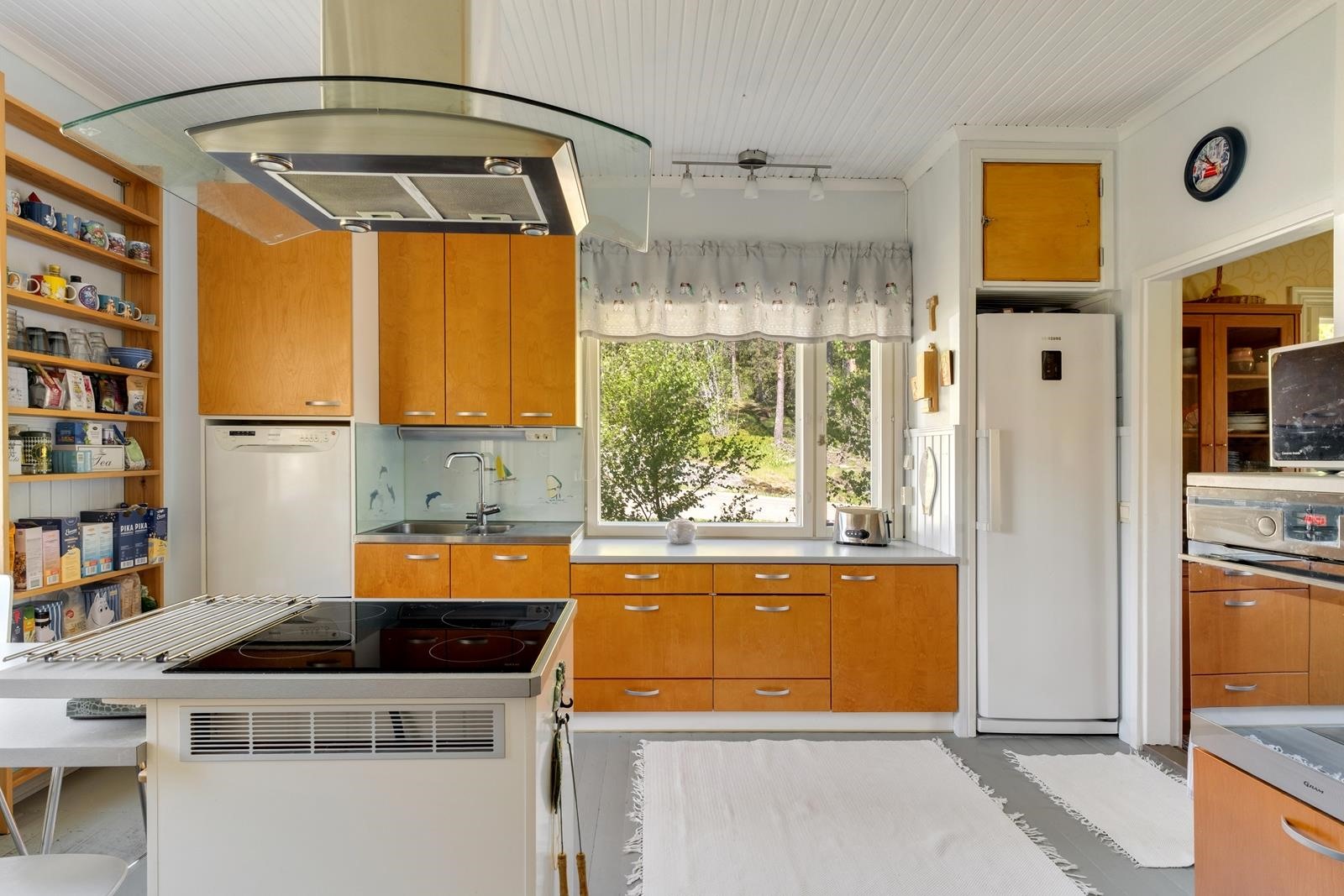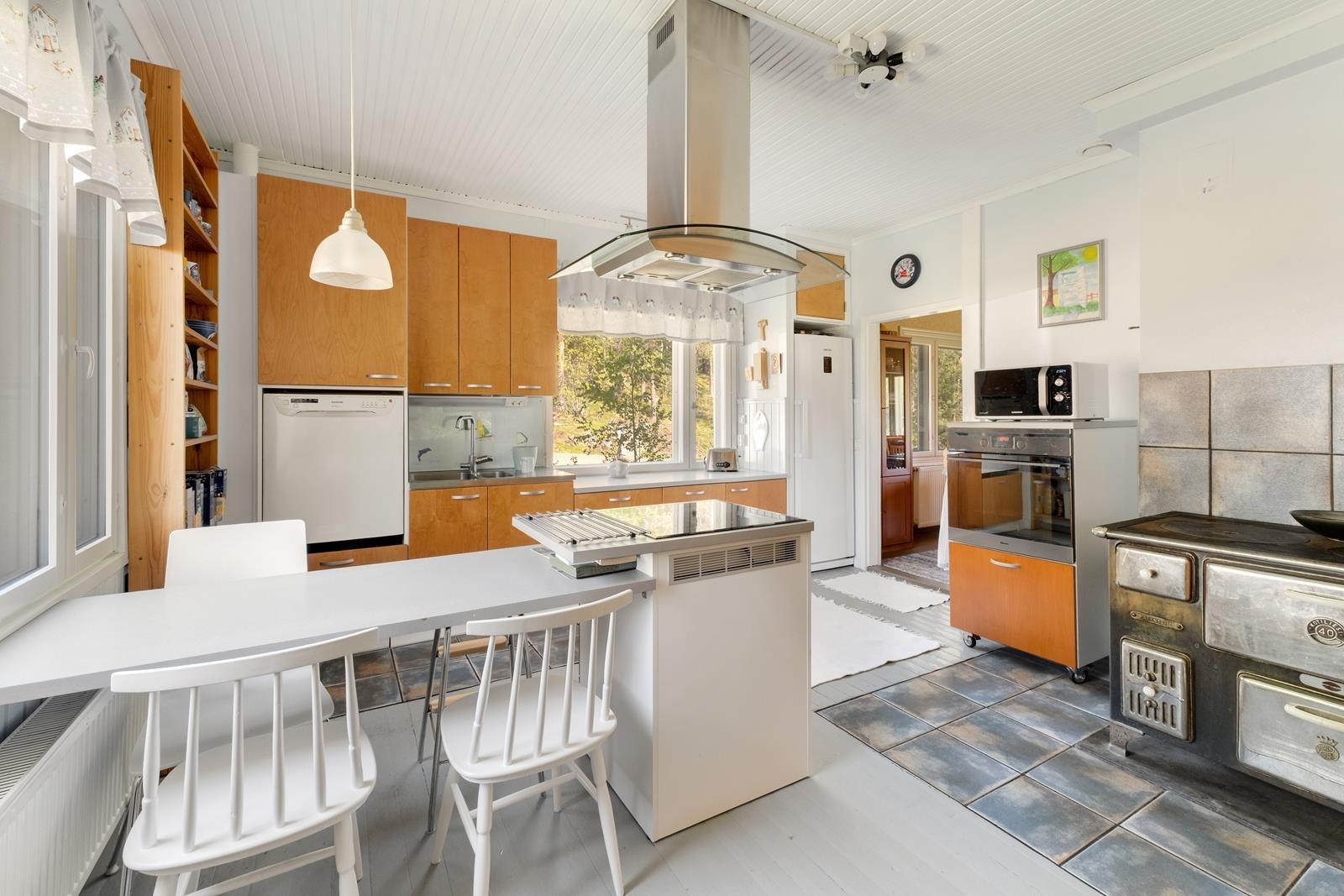 - Jääkaappi, erillisuuni, liesitaso induktio, liesituuletin, kaapistot, kiinteät valaisimet, pöytätasojen materiaali laminaatti, puuhella paistouunilla.