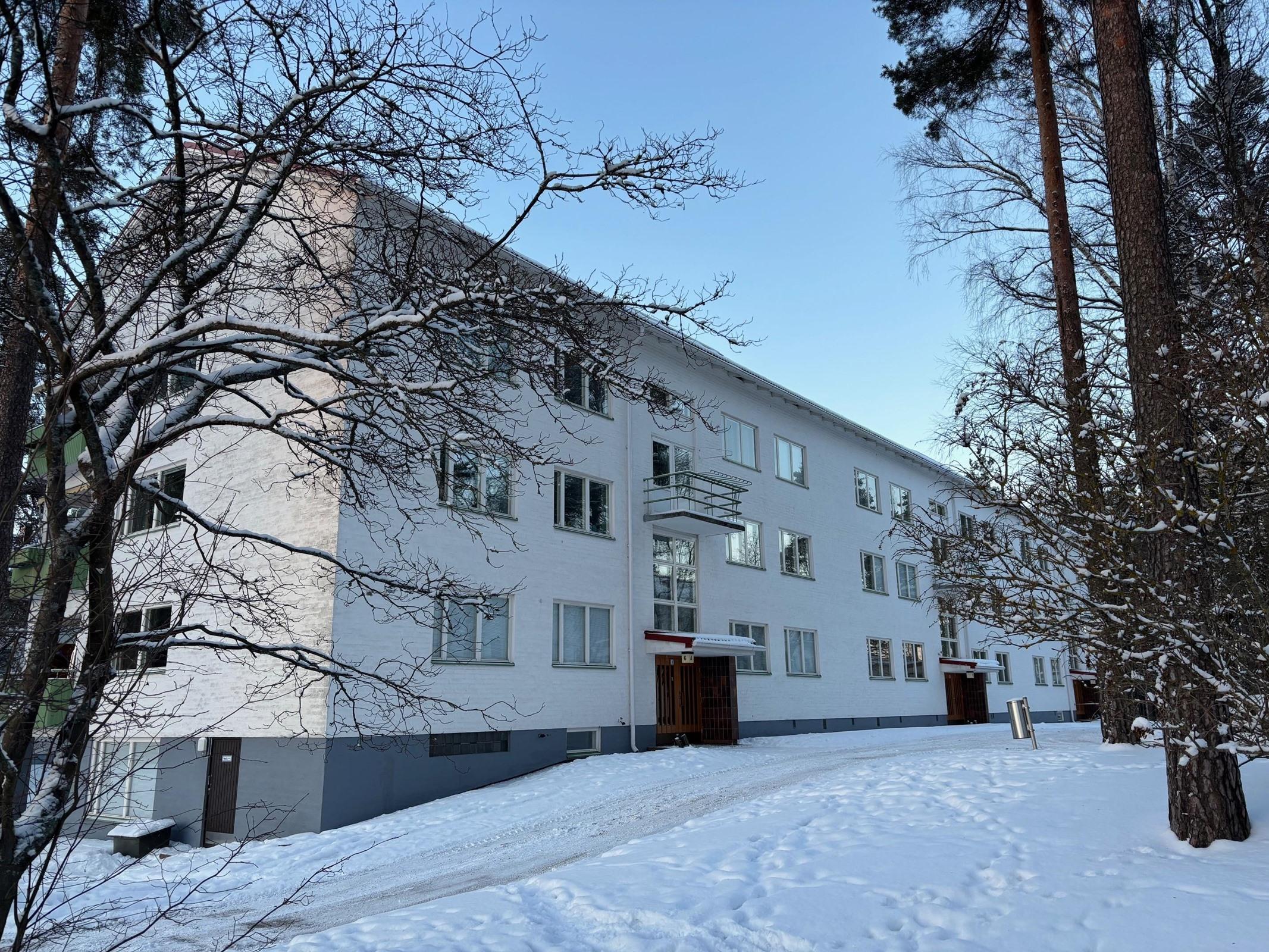 Kivalla paikalla ja paljon perusparannuksia läpikäyneessä yhtiössä ensimmmäisen kerroksen kolmio. 1950-luvun jykevä kivitalo leveine ikkunalautoineen. Putkiremontti tehty. Yhtiöllä oma tontti. Uusi Käpylän ala-aste vieressä ja kauppaan kävelymatka. Esittelyt sopimuksesta.