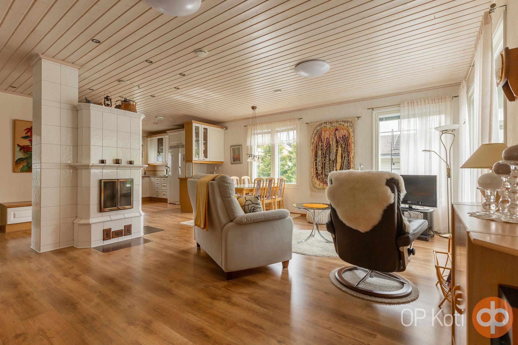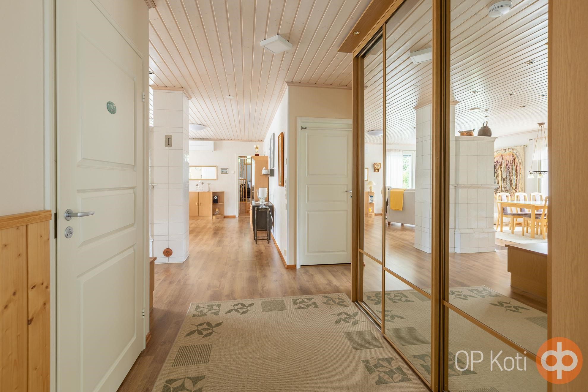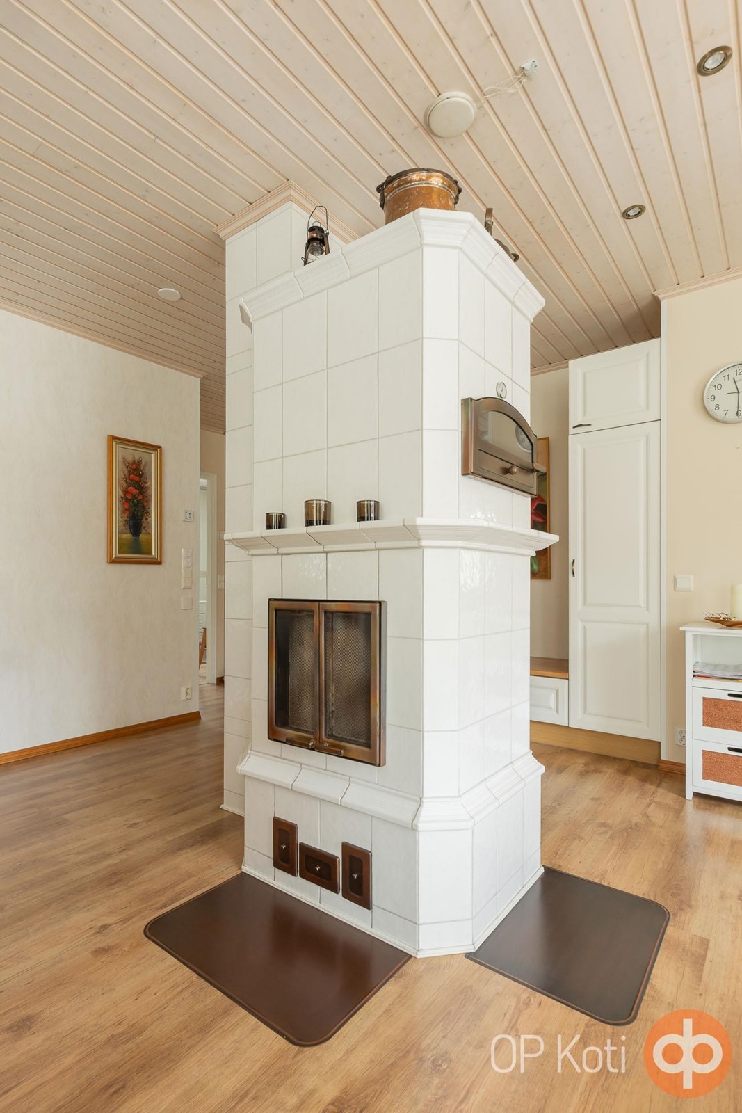 Tiloina toimii 3 makuuhuonetta, tilava olohuone, keittiö, kodinhoitohuone, kaksi erillistä wc:tä, eteinen sekä tietenkin kylpyhuone ja sauna. Kodinhoitohuoneesta on käynti takaterassille. Kodin keskiössä on varaava takka, joka luo lämpöä ja tunnelmaa tupaan. Säilytystilaa on reilusti komeroiden ja vaatehuoneen muodossa.