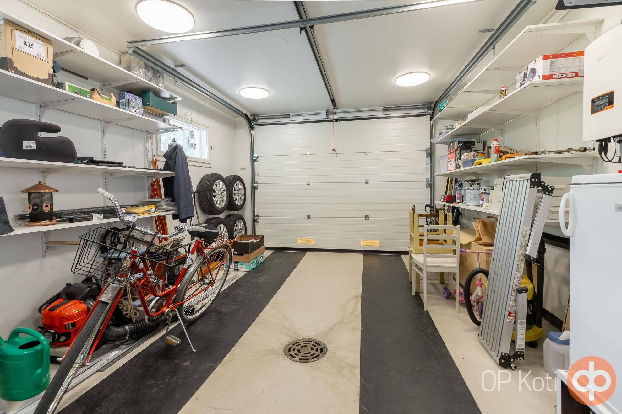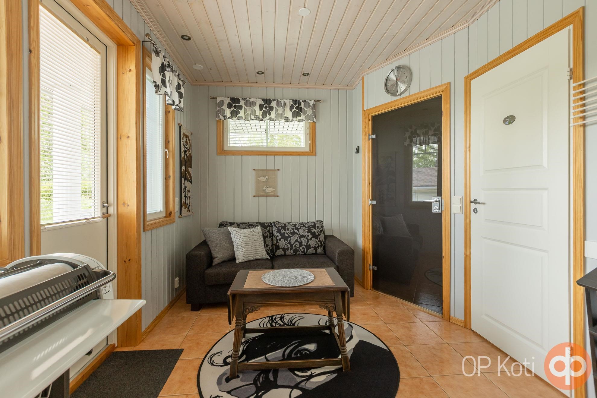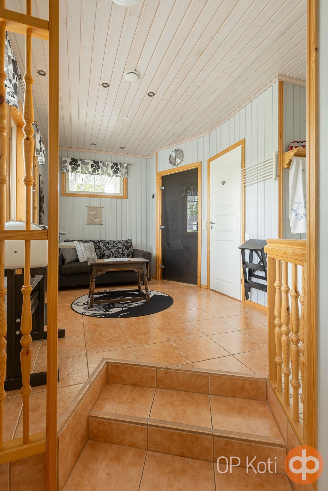 Tiloina toimii 3 makuuhuonetta, tilava olohuone, keittiö, kodinhoitohuone, kaksi erillistä wc:tä, eteinen sekä tietenkin kylpyhuone ja sauna. Kodinhoitohuoneesta on käynti takaterassille. Kodin keskiössä on varaava takka, joka luo lämpöä ja tunnelmaa tupaan. Säilytystilaa on reilusti komeroiden ja vaatehuoneen muodossa.