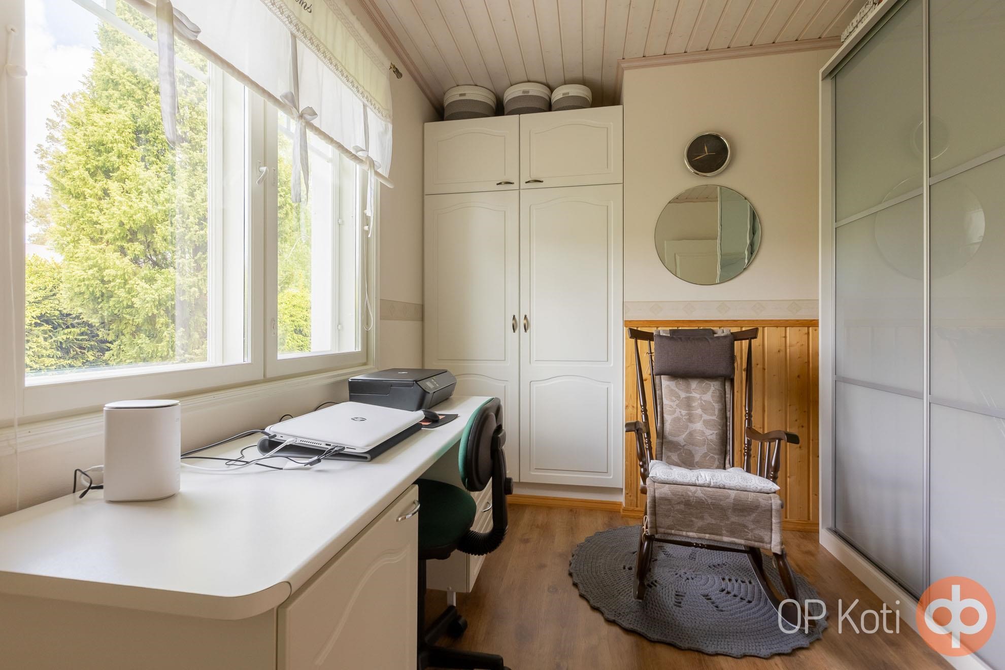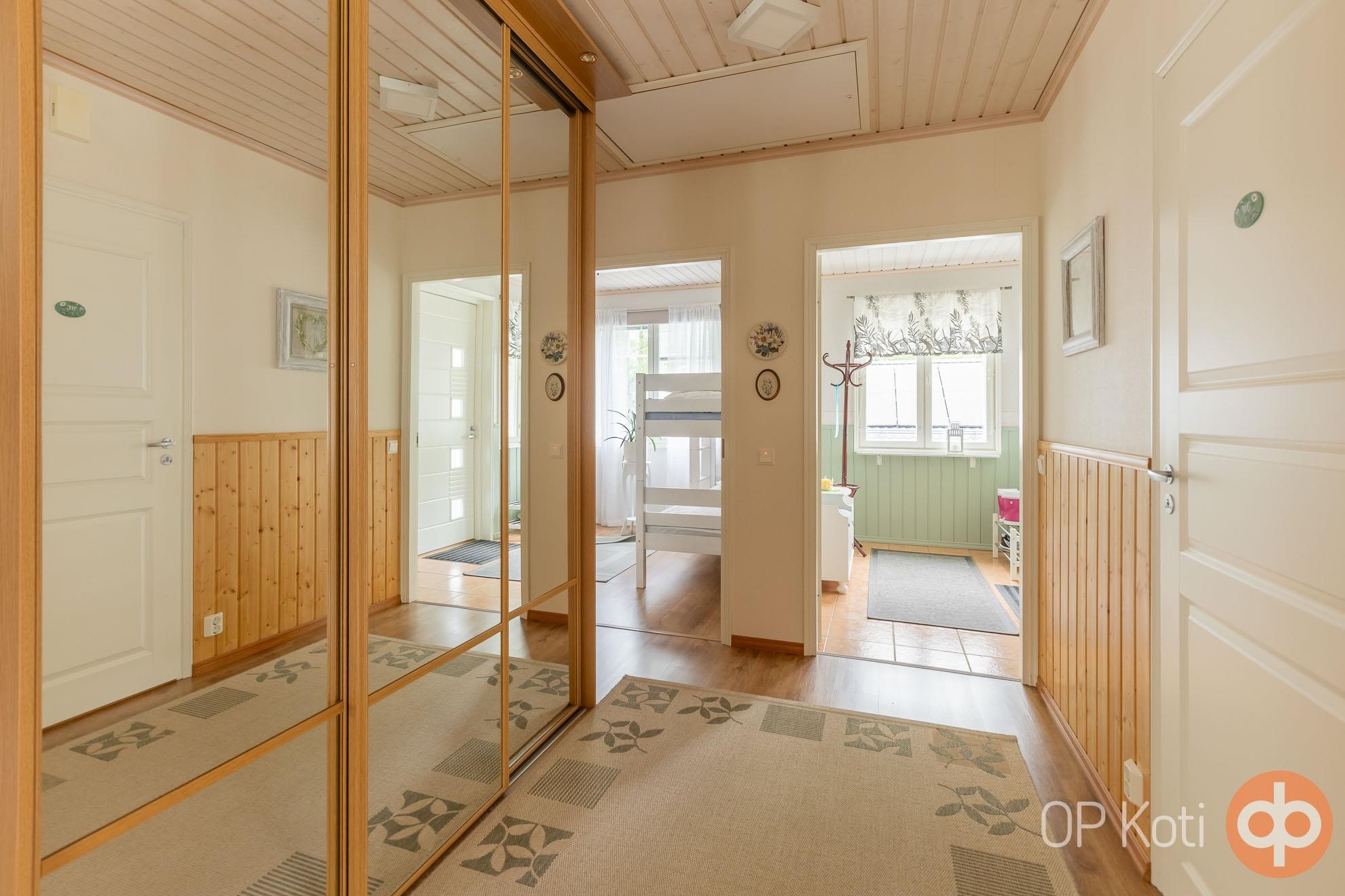 - Keittiö: Laattalattia, seinät maalattu. Olohuone: Laminaattilattia, seinät tapetoitu. Makuuhuone 1: Laminaattilattia, seinät tapetoitu/paneeli. Makuuhuone 2: Laminaattilattia, seinät tapetoitu/paneeli. Makuuhuone 3: Laminaattilattia, seinät tapetoitu/paneeli. Kodinhoitohuone: Laattalattia, seinät paneloitu. Sauna: Lattia kaakeloitu, seinät paneloitu. Kylpyhuone: Kaakeloitu. Eteinen: Laattalattia, seinät tapetoitu/paneeli. Wc: Kaakeloitu.