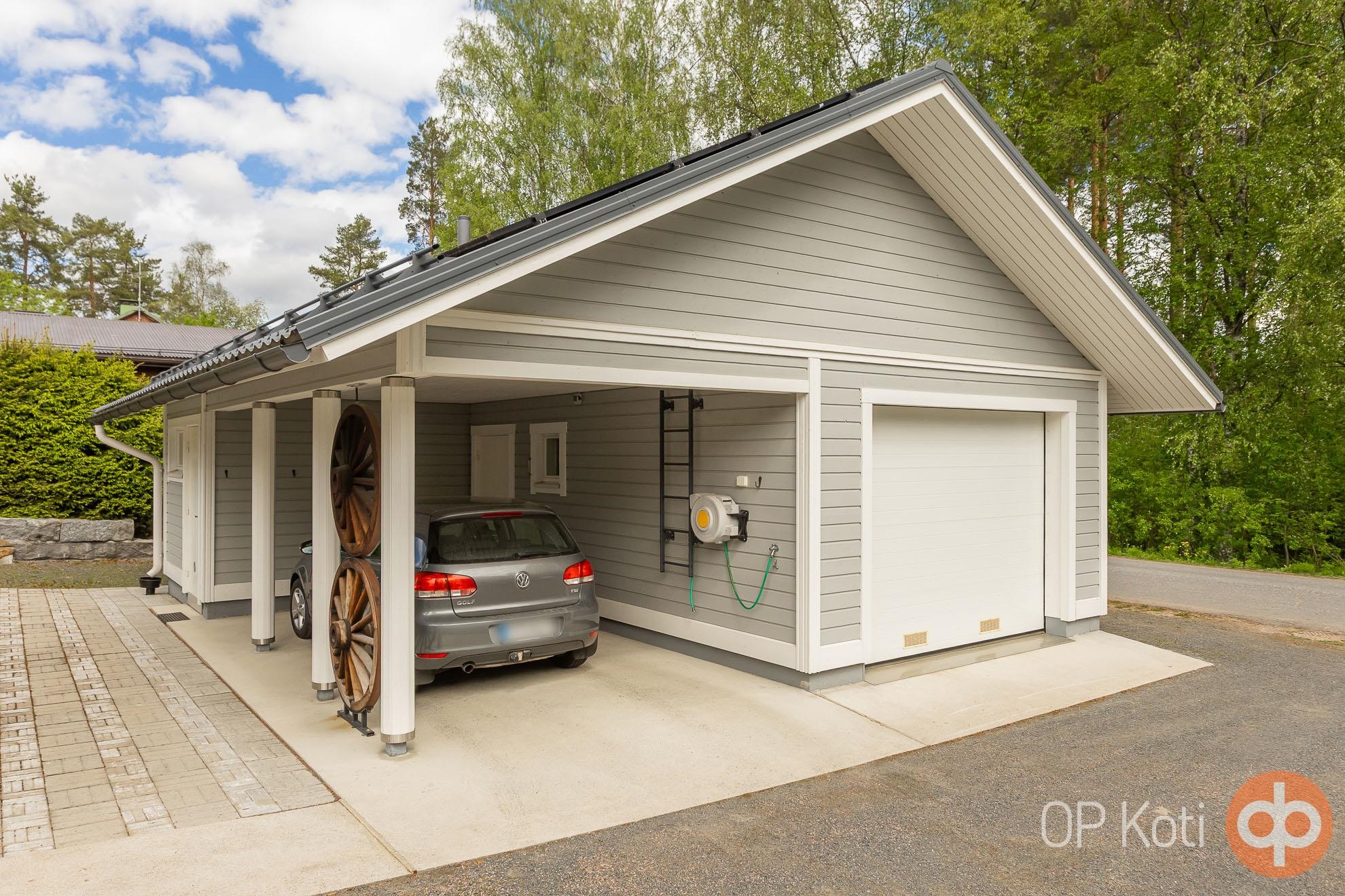 Talousrakennus palvelee paremmin kuin hyvin. On autokatos, lämmintalli, varasto sekä liiteri. Tallissa on vesipiste ja takapihalla on vielä erillinen vaja.