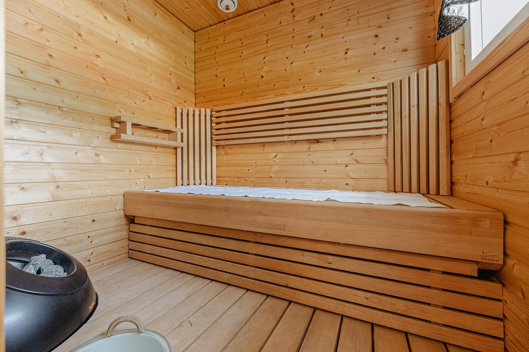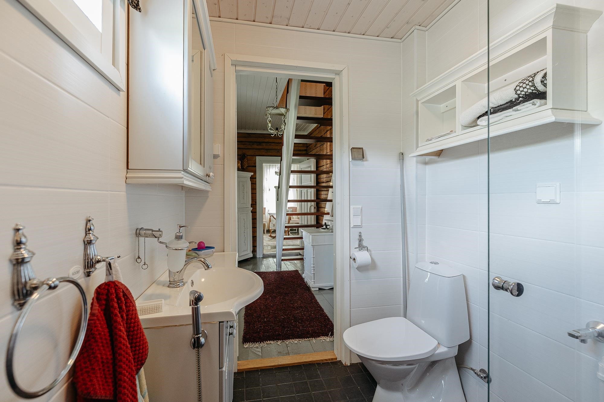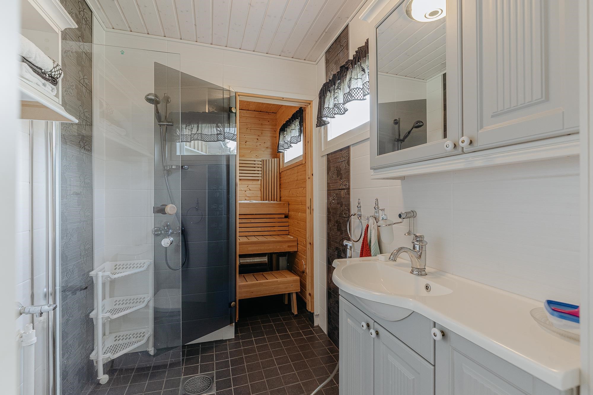 - Sauna, sähkökiuas sisäsauna, puukiuas ulkosauna, suihku, suihkuseinä, peilikaappi, allaskaappi, pesukoneliitäntä, lattialämmitys, kiinteät valaisimet.