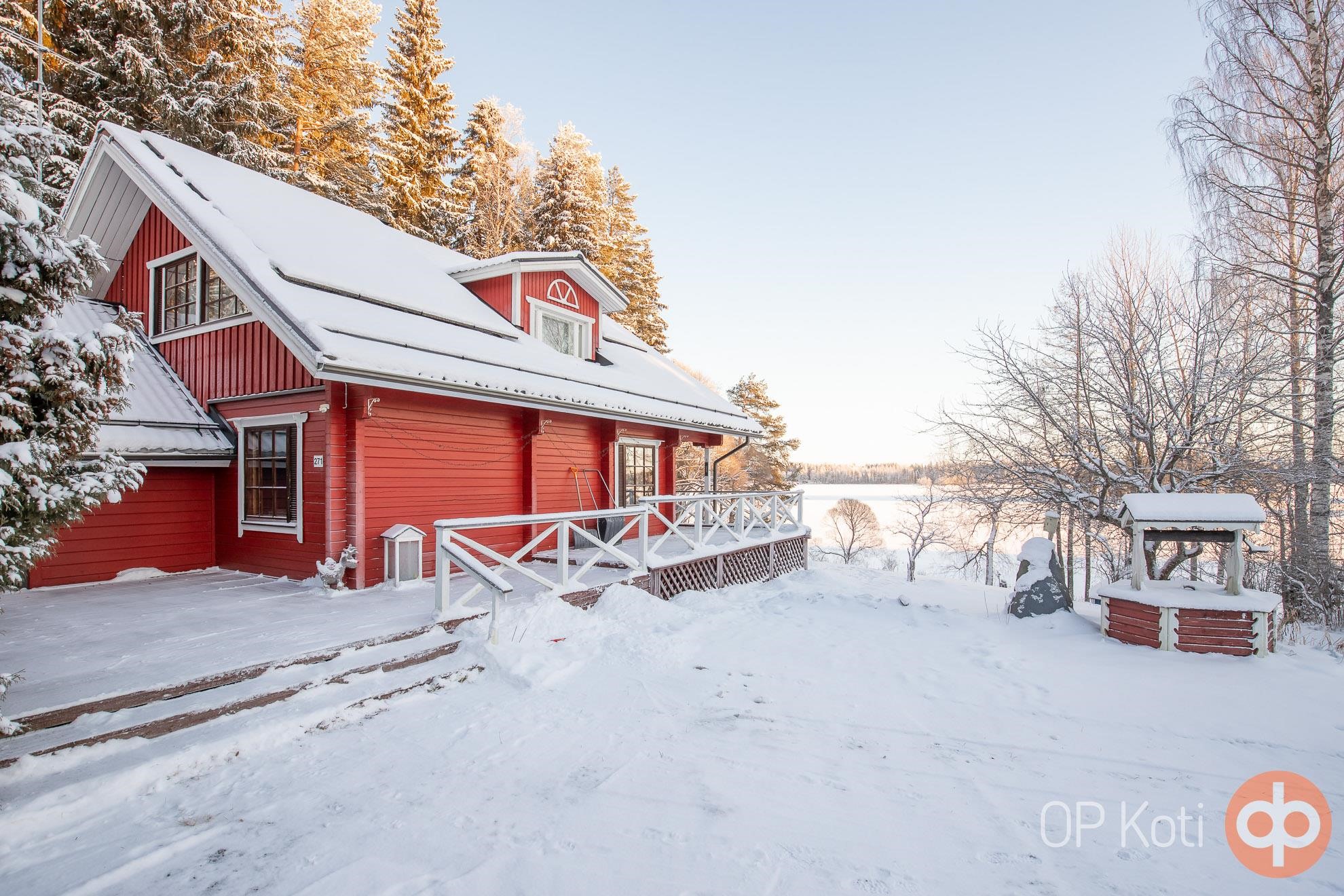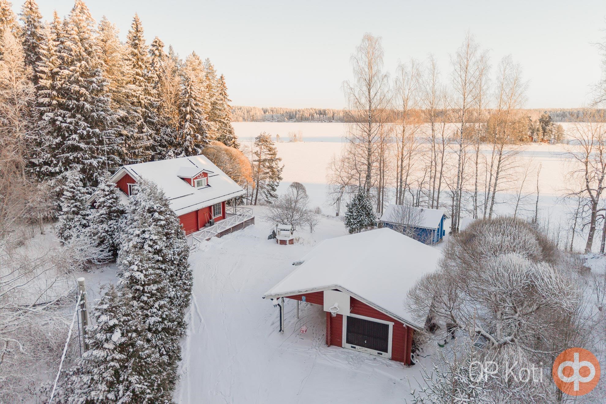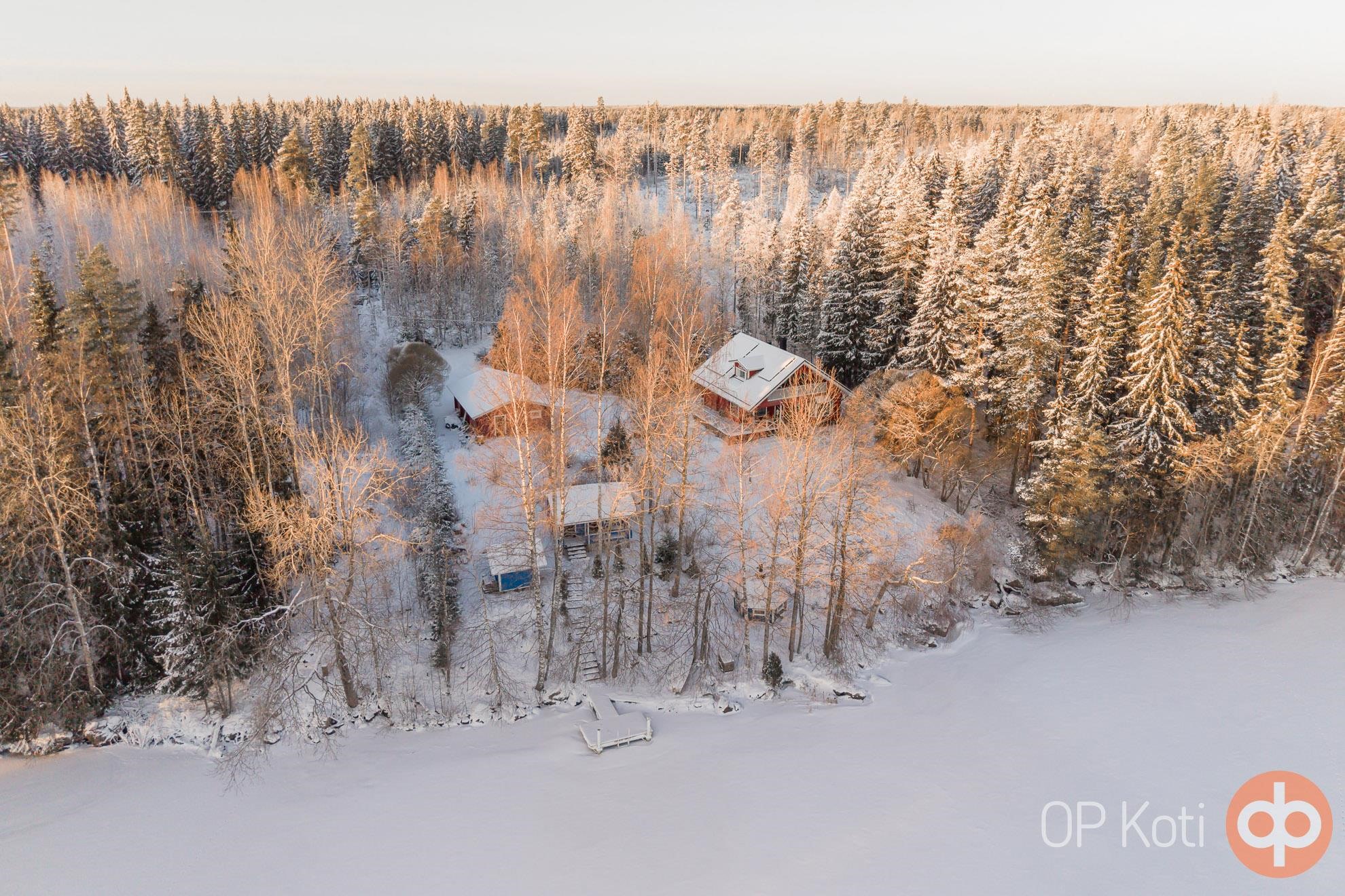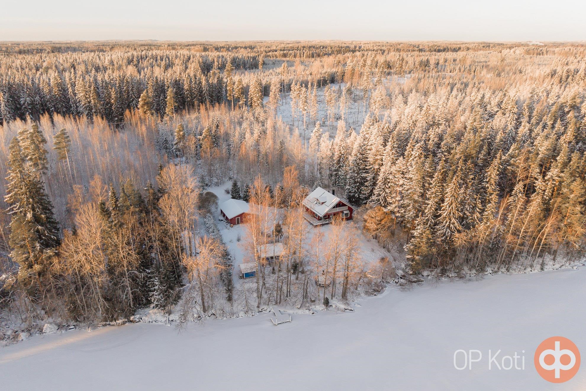 Hirsinen omakotitalo on valmistunut vuonna 1996 ja tiloina toimii 2 makuuhuonetta, keittiö, olohuone, wc, kylpyhuone, sauna ja eteinen sekä tekninen tila. Yläkerran parvekkeelta maisema aukeaa kauniisti järvelle. Lämmitysjärjestelmänä puu/sähkö ja aurinkopaneelitkin on asennettu katolle. Talousrakennuksina toimii autotalli/katos/varasto/liiteri ja rannan tuntumasta löydät grillikodan, liiteri ja rantasaunan. Rantasaunassa on tupa, pukuhuone ja itse sauna.