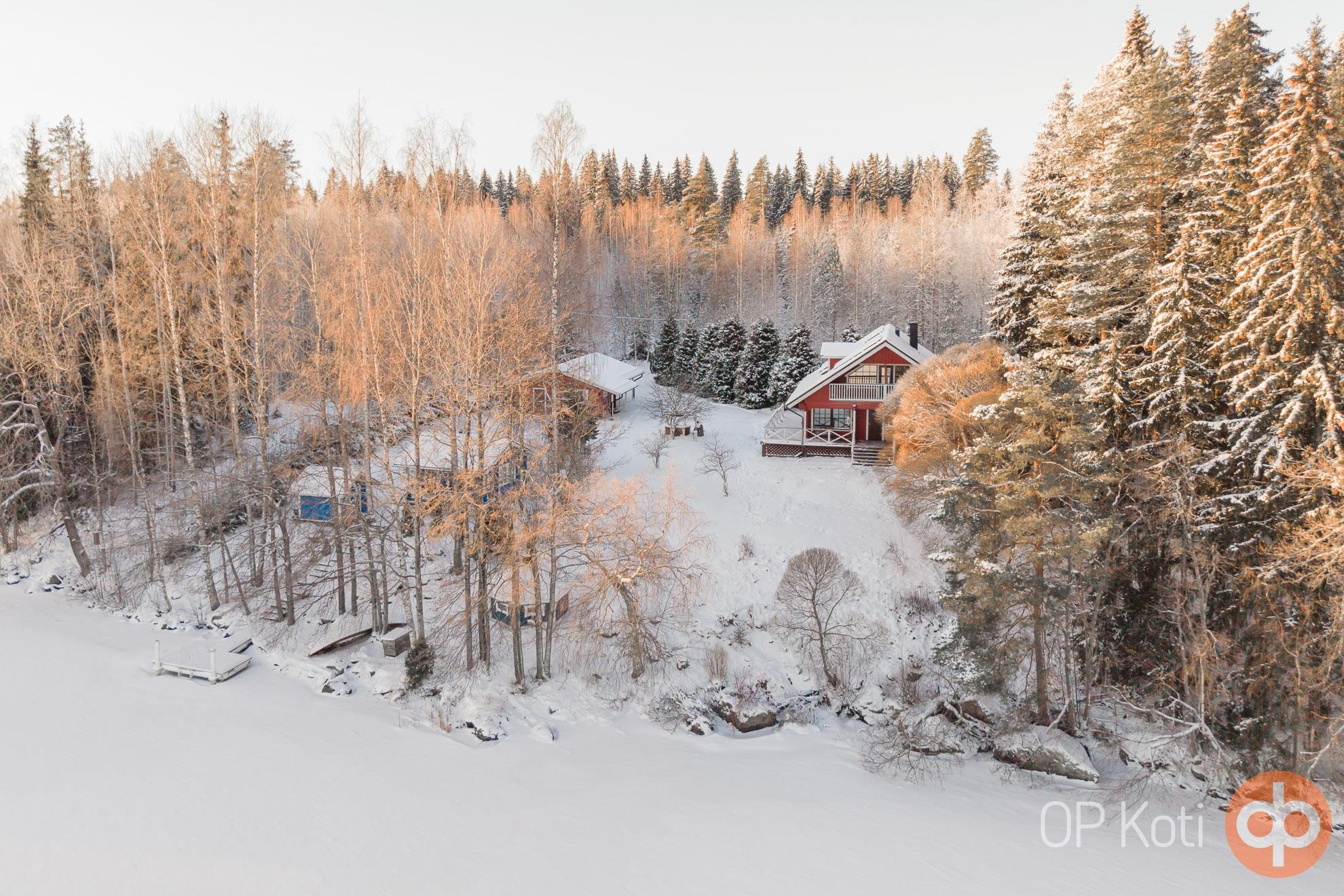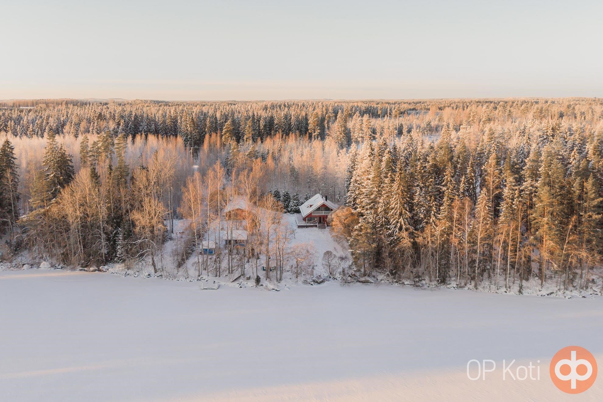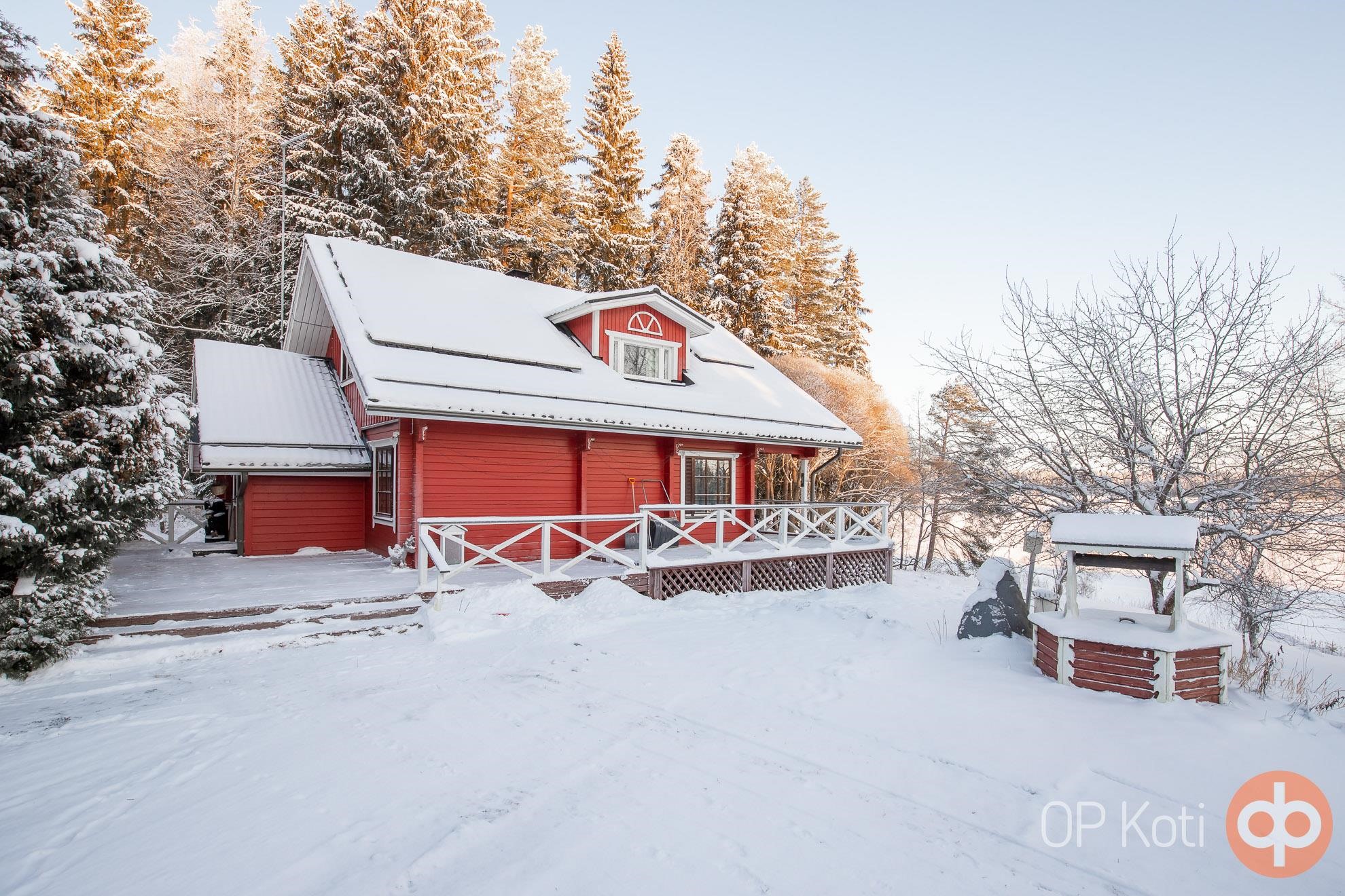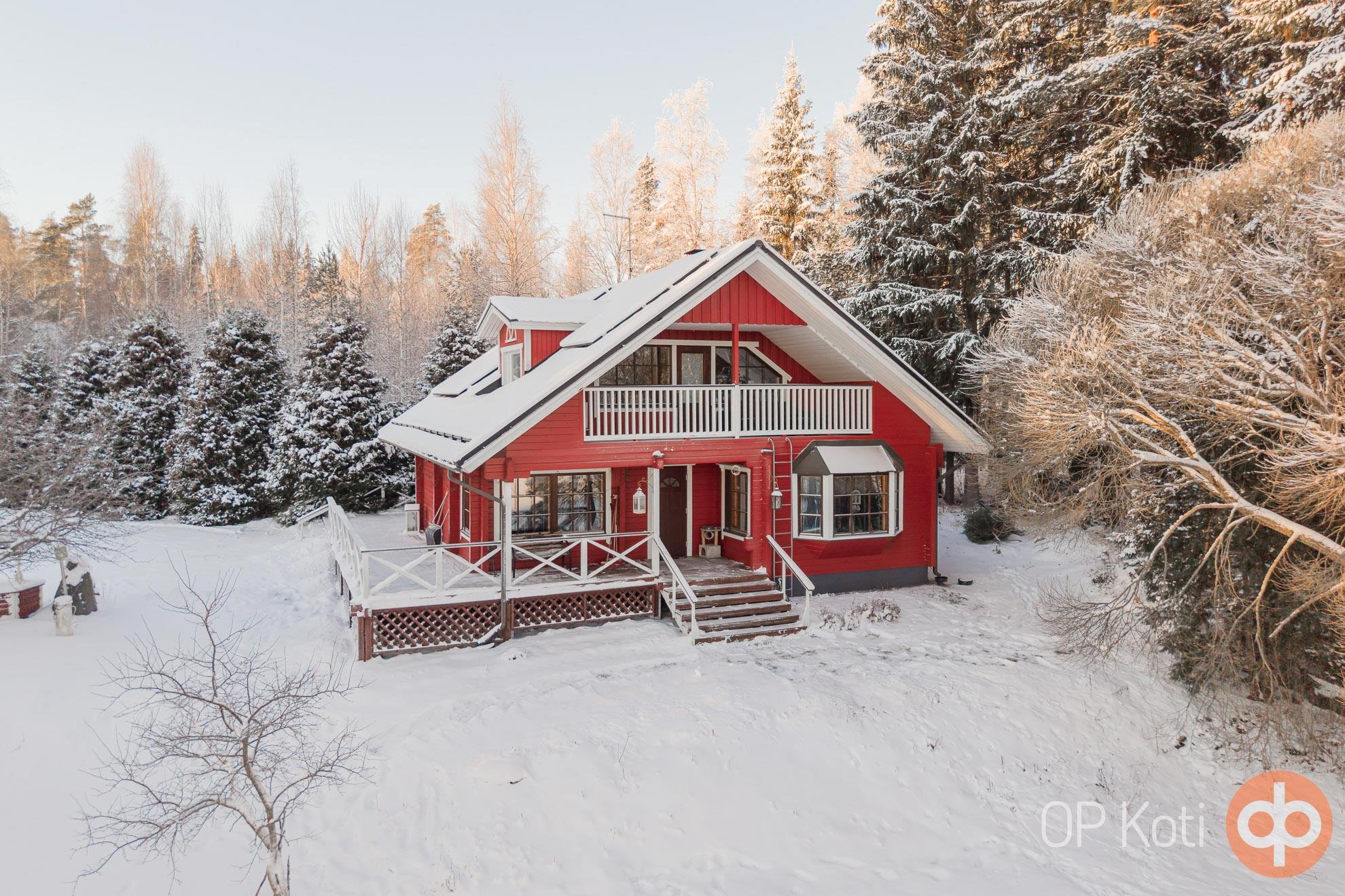 Hirsinen omakotitalo on valmistunut vuonna 1996 ja tiloina toimii 2 makuuhuonetta, keittiö, olohuone, wc, kylpyhuone, sauna ja eteinen sekä tekninen tila. Yläkerran parvekkeelta maisema aukeaa kauniisti järvelle. Lämmitysjärjestelmänä puu/sähkö ja aurinkopaneelitkin on asennettu katolle. Talousrakennuksina toimii autotalli/katos/varasto/liiteri ja rannan tuntumasta löydät grillikodan, liiteri ja rantasaunan. Rantasaunassa on tupa, pukuhuone ja itse sauna.