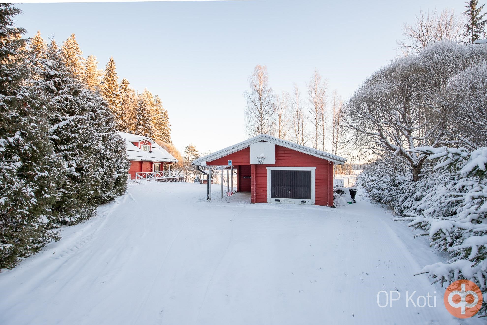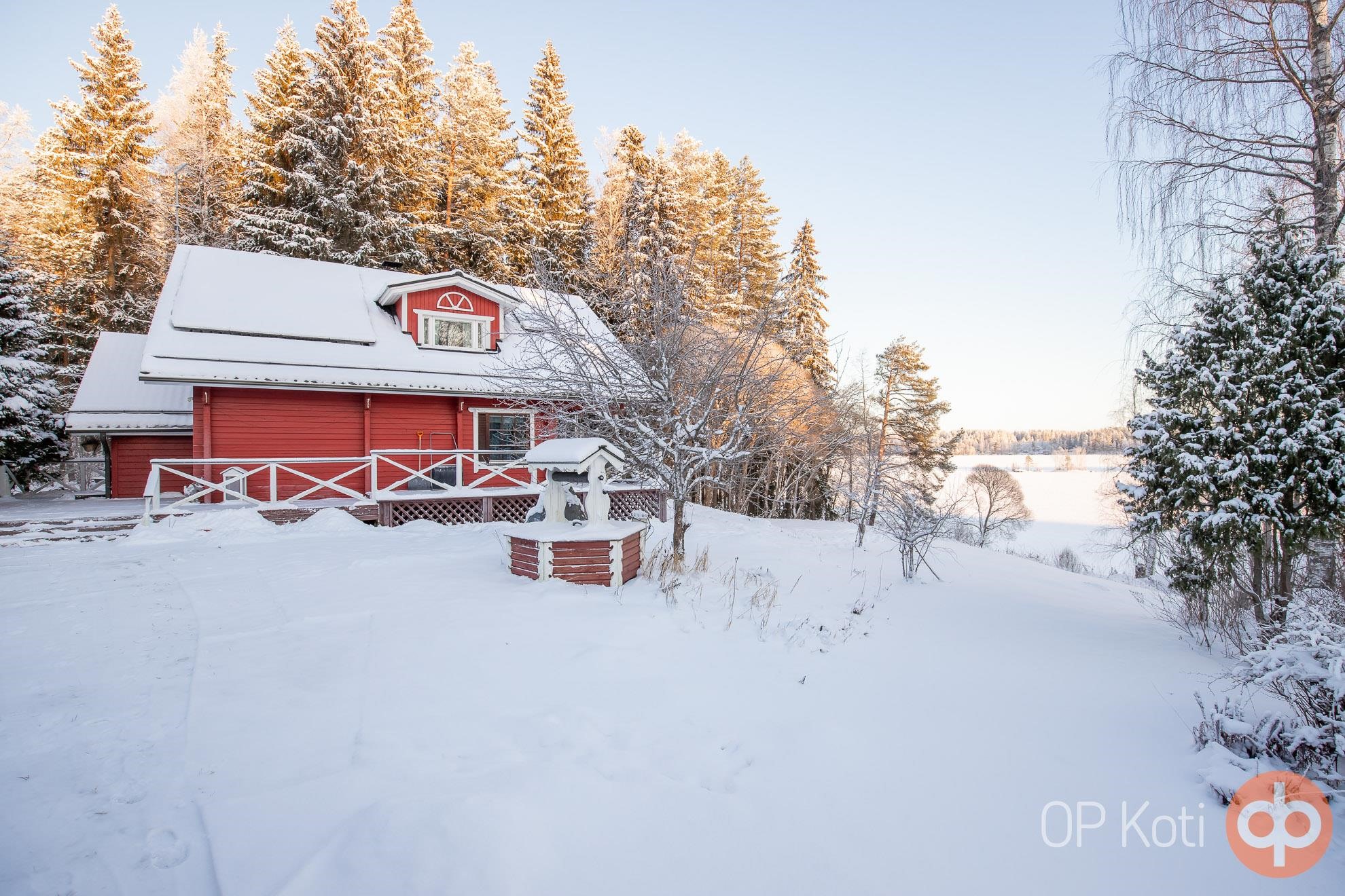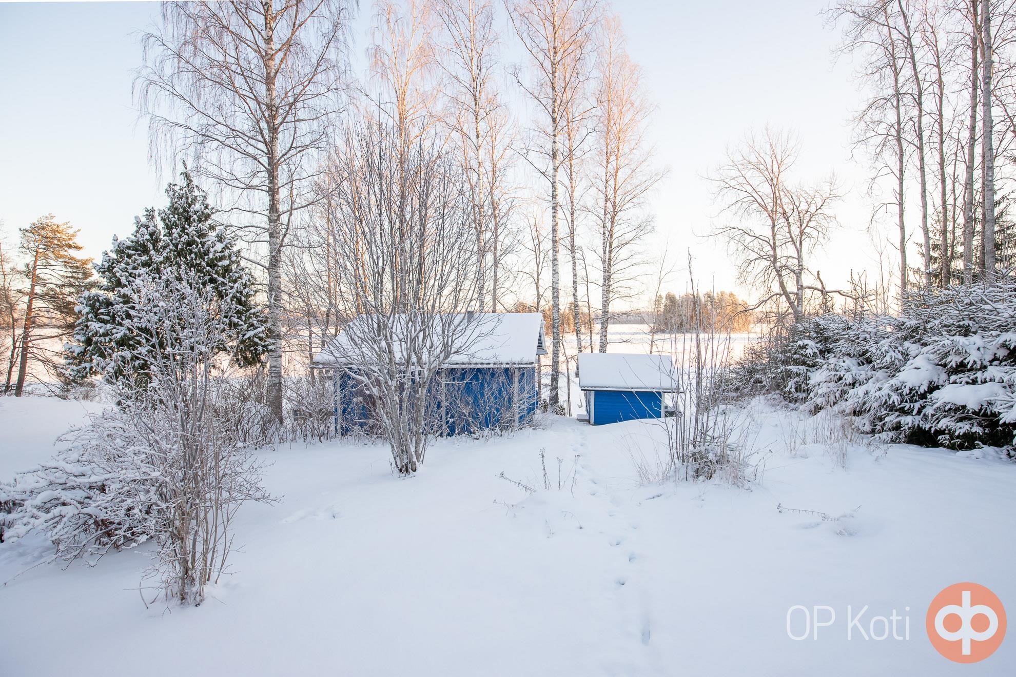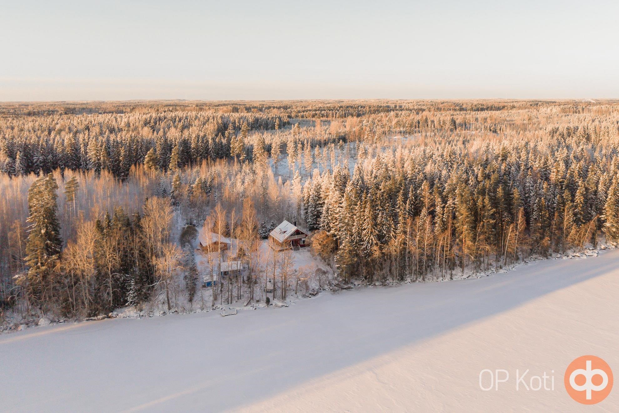 Hirsinen omakotitalo on valmistunut vuonna 1996 ja tiloina toimii 2 makuuhuonetta, keittiö, olohuone, wc, kylpyhuone, sauna ja eteinen sekä tekninen tila. Yläkerran parvekkeelta maisema aukeaa kauniisti järvelle. Lämmitysjärjestelmänä puu/sähkö ja aurinkopaneelitkin on asennettu katolle. Talousrakennuksina toimii autotalli/katos/varasto/liiteri ja rannan tuntumasta löydät grillikodan, liiteri ja rantasaunan. Rantasaunassa on tupa, pukuhuone ja itse sauna.