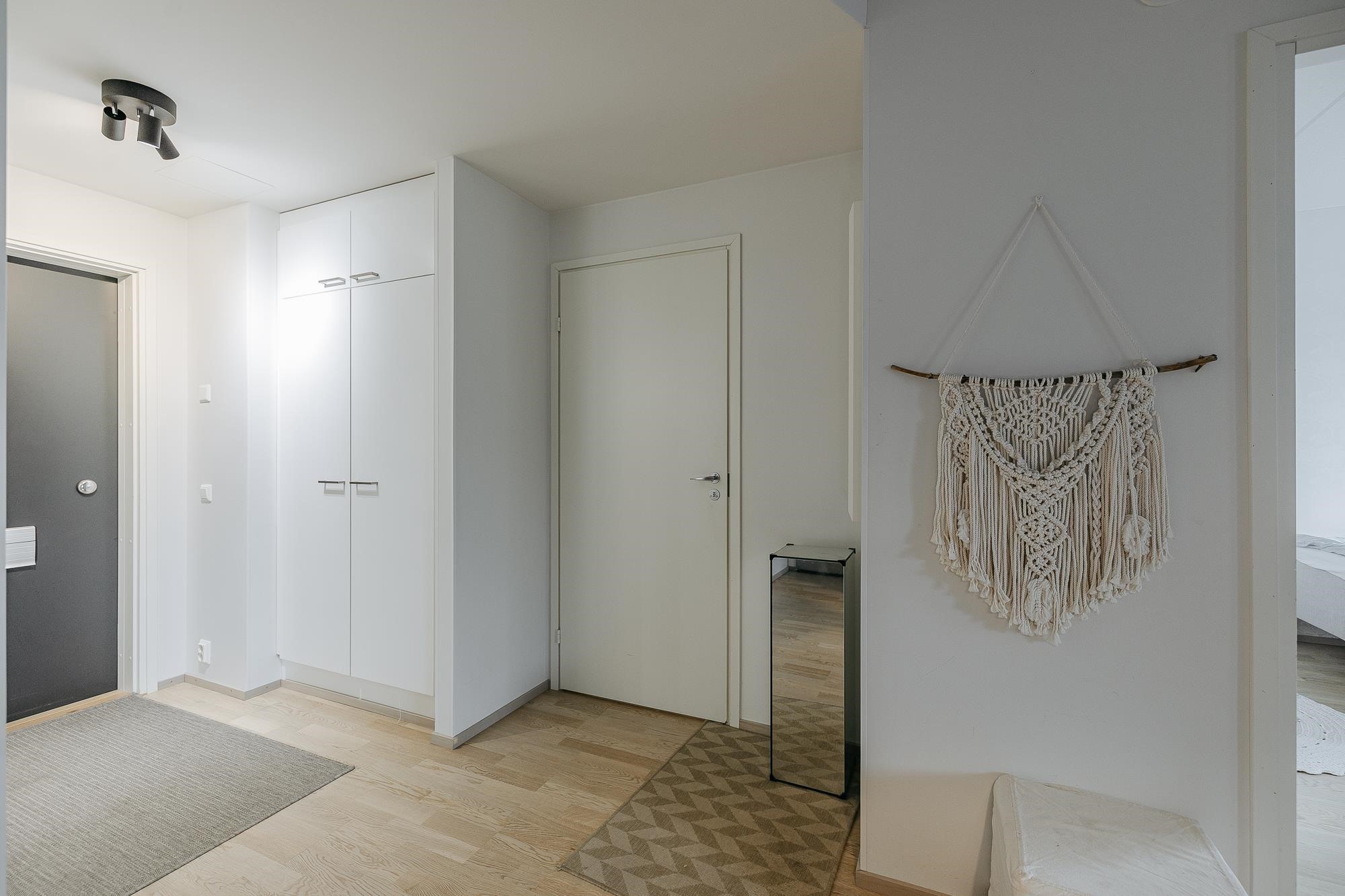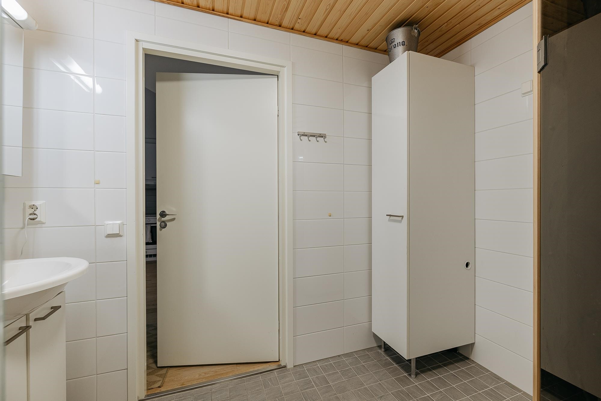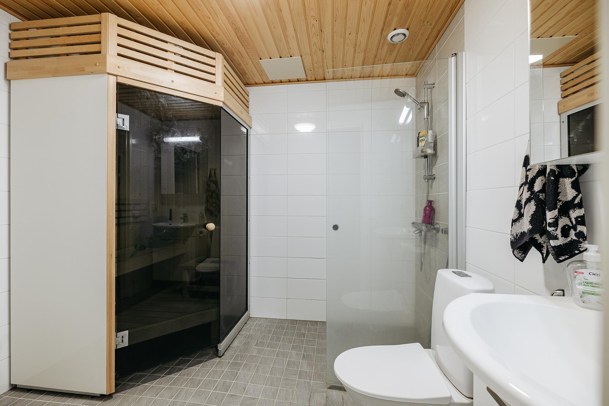 - Sauna, sähkökiuas, kylpyhuone, suihku, suihkuseinä, peilikaappi, allaskaappi, pesukoneliitäntä, lattialämmitys, kiinteät valaisimet.