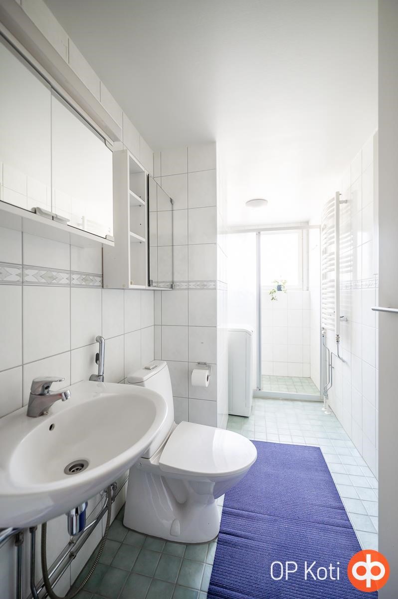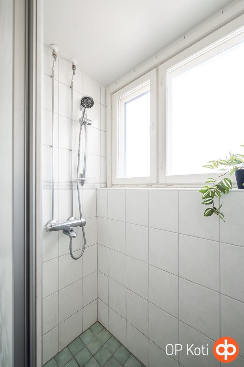- Kylpyhuone, suihku, suihkuseinä, peilikaappi, kaapit, pesukoneliitäntä, kiinteät valaisimet.