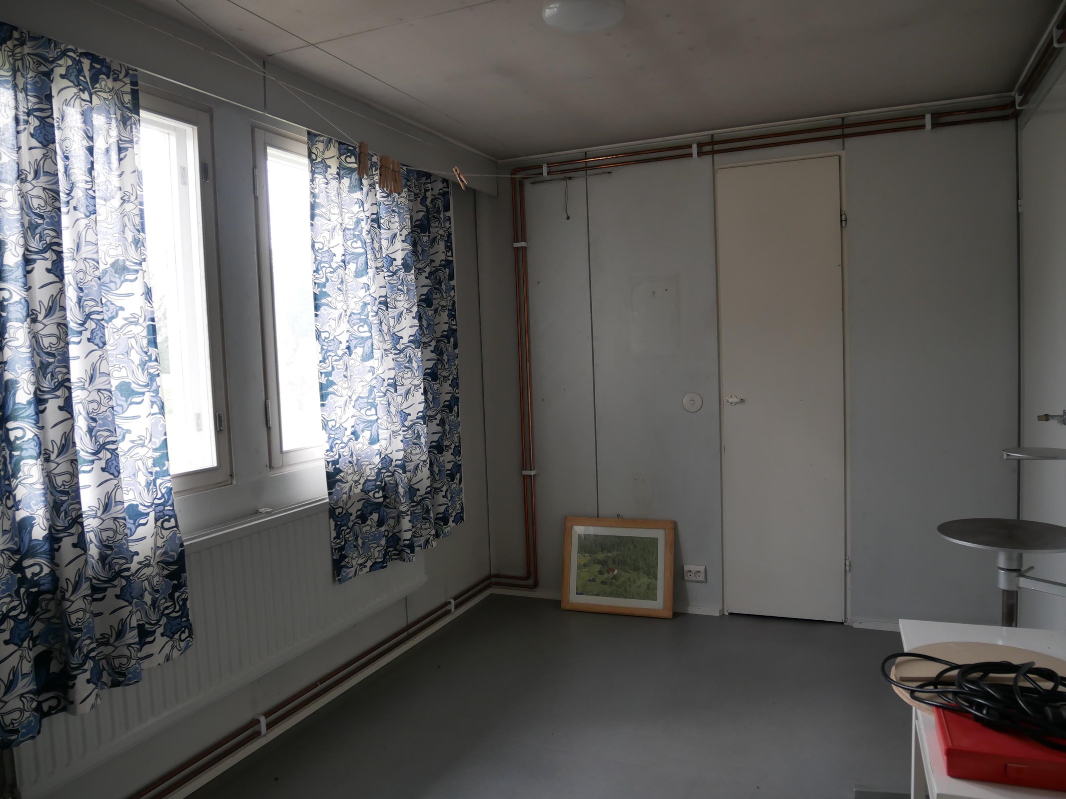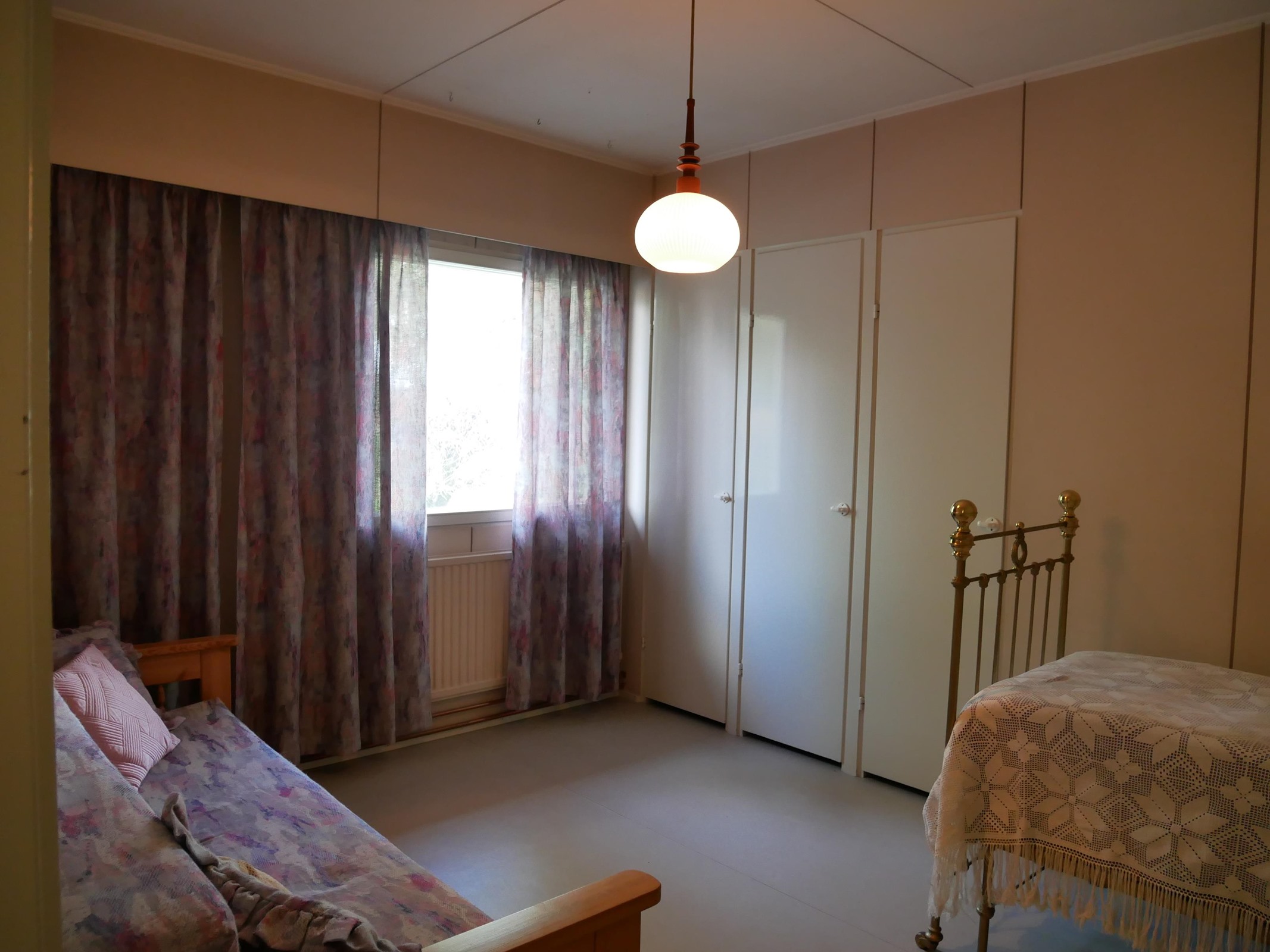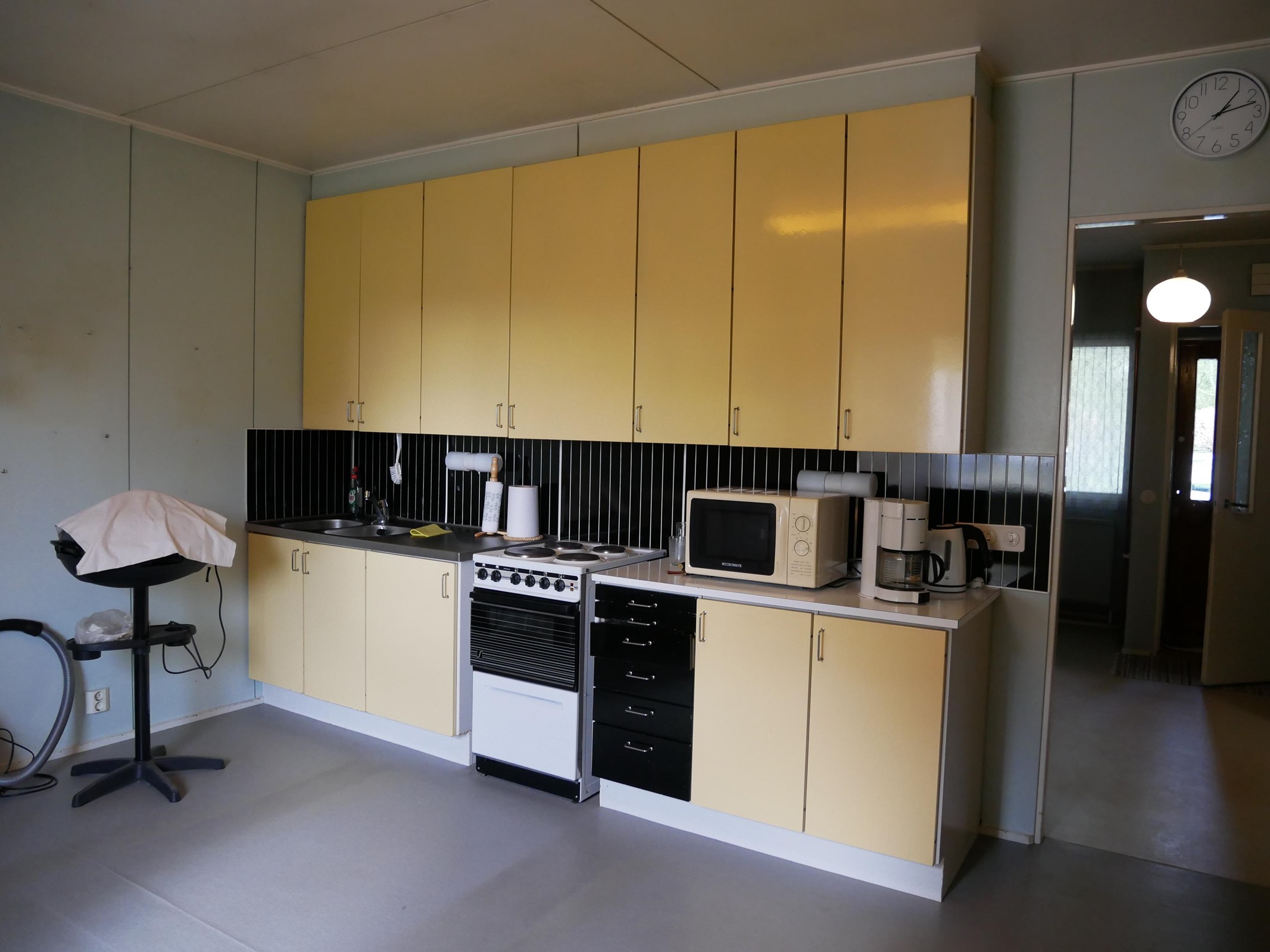 - Jääkaappipakastin, lattialiesi, sähköliesi, kaapistot, kiinteät valaisimet, pöytätasojen materiaali Levy. Ovet maalattu vuosien varrella.