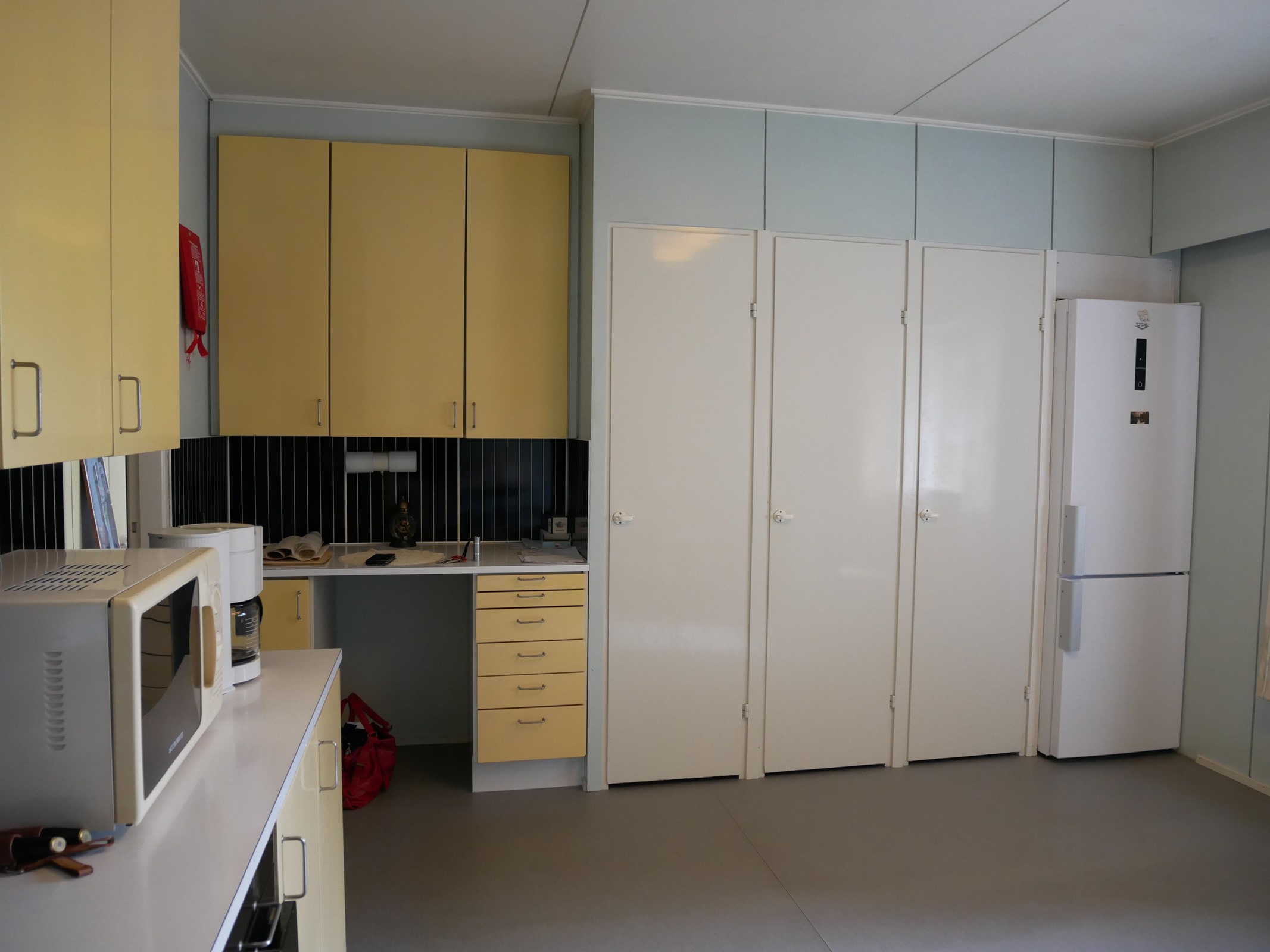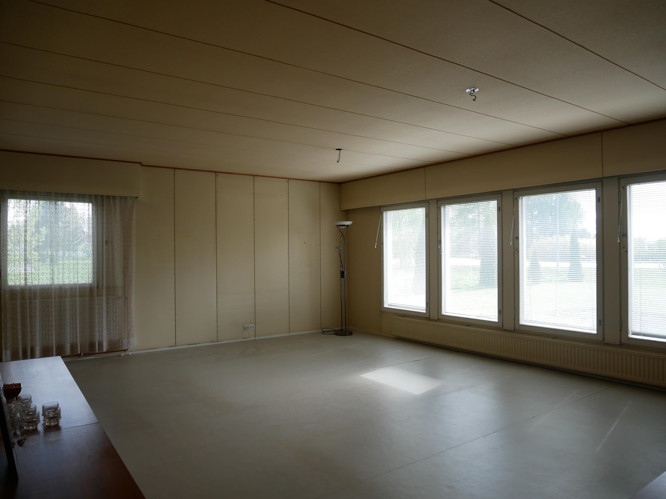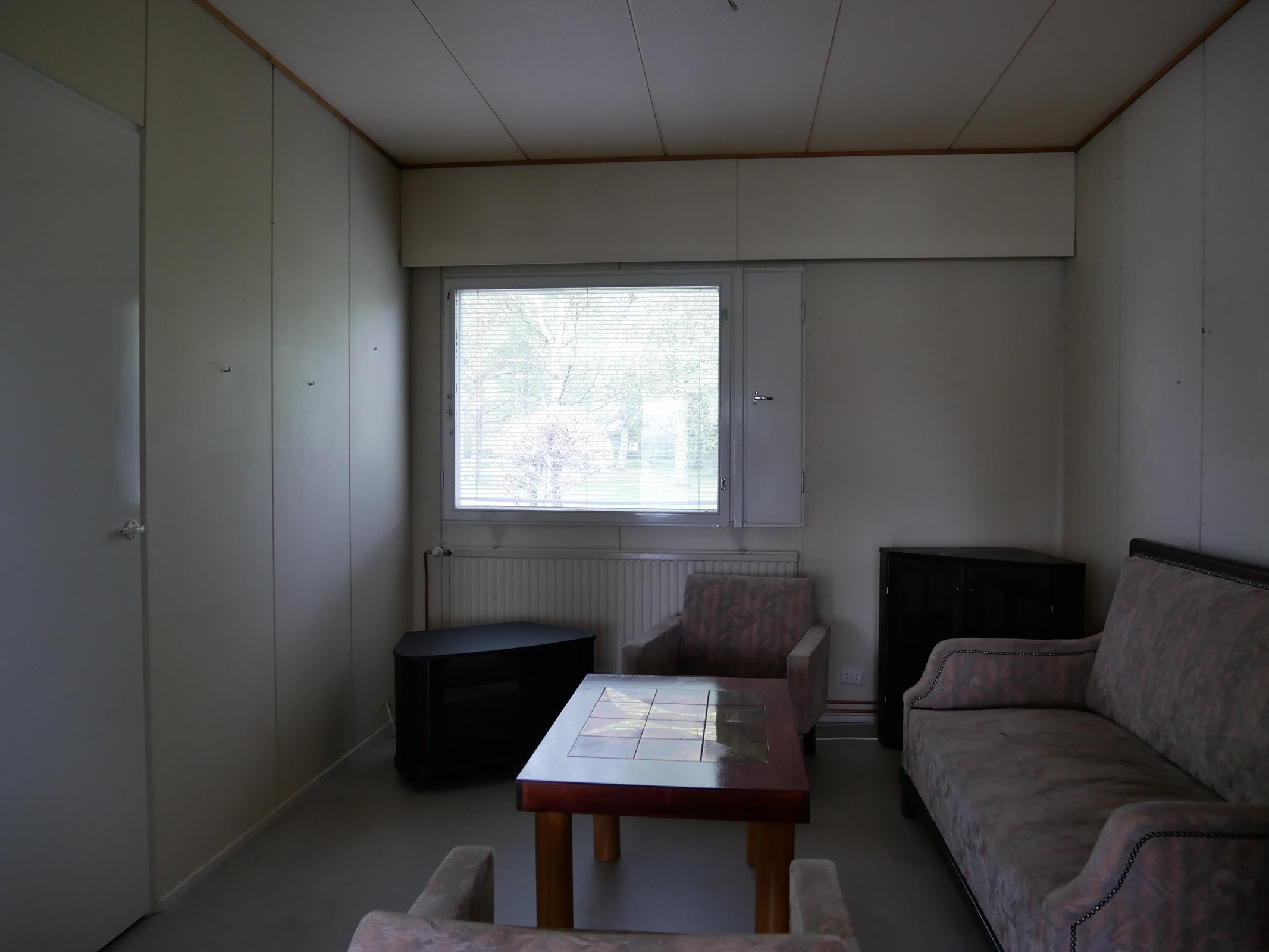 - Jääkaappipakastin, lattialiesi, sähköliesi, kaapistot, kiinteät valaisimet, pöytätasojen materiaali Levy. Ovet maalattu vuosien varrella.