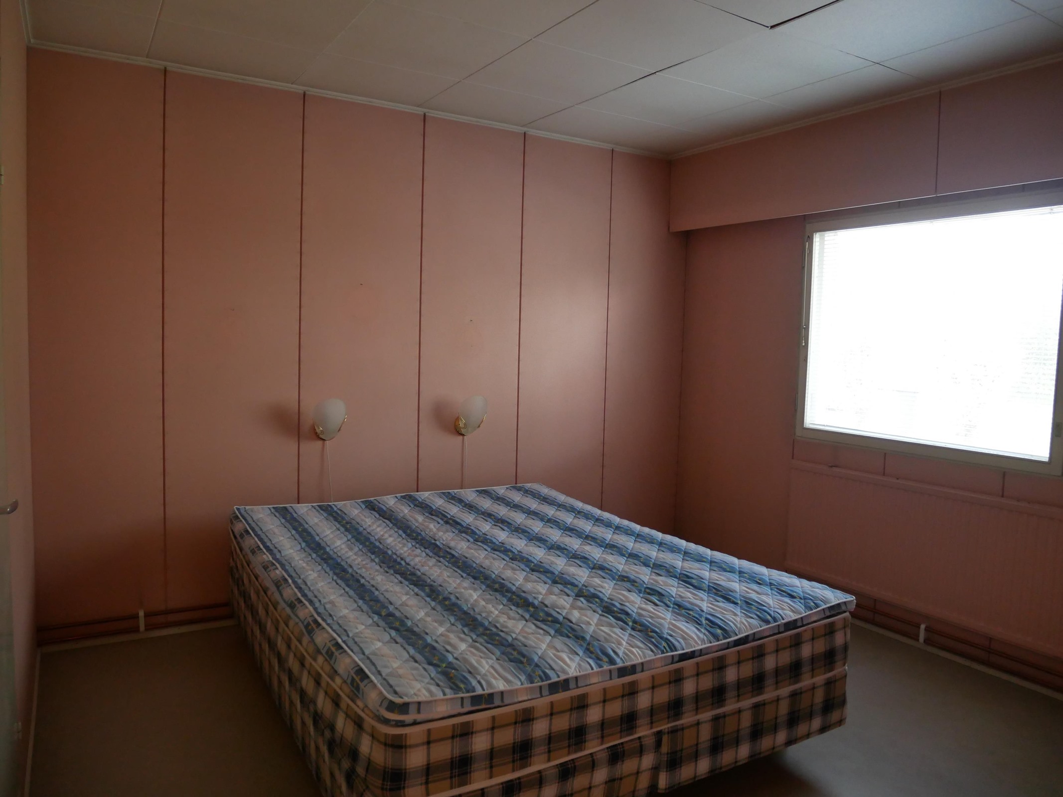 Keittiö: muovimatto, maali. Olohuone: muovimatto, maali. Makuuhuone 1: muovimatto, maali. Makuuhuone 2: muovimatto, maali. Makuuhuone 3: muovimatto, maali. Sauna: betoni, paneeli. Kylpyhuone: betoni, muovilevy. Wc: muovimatto, muovilevy/maali.