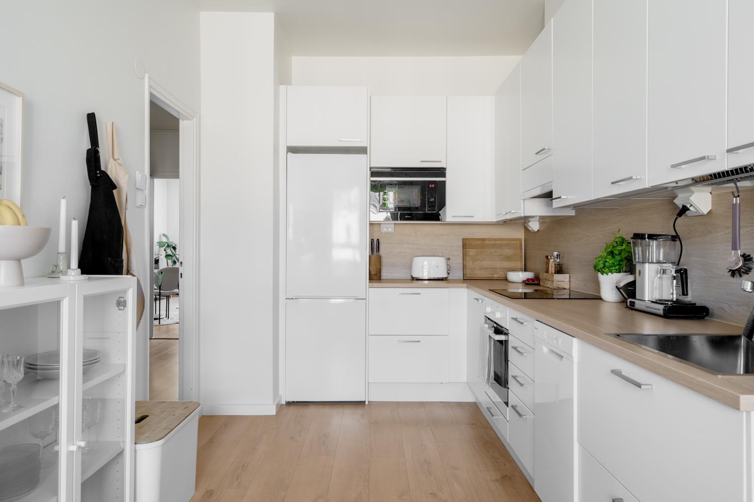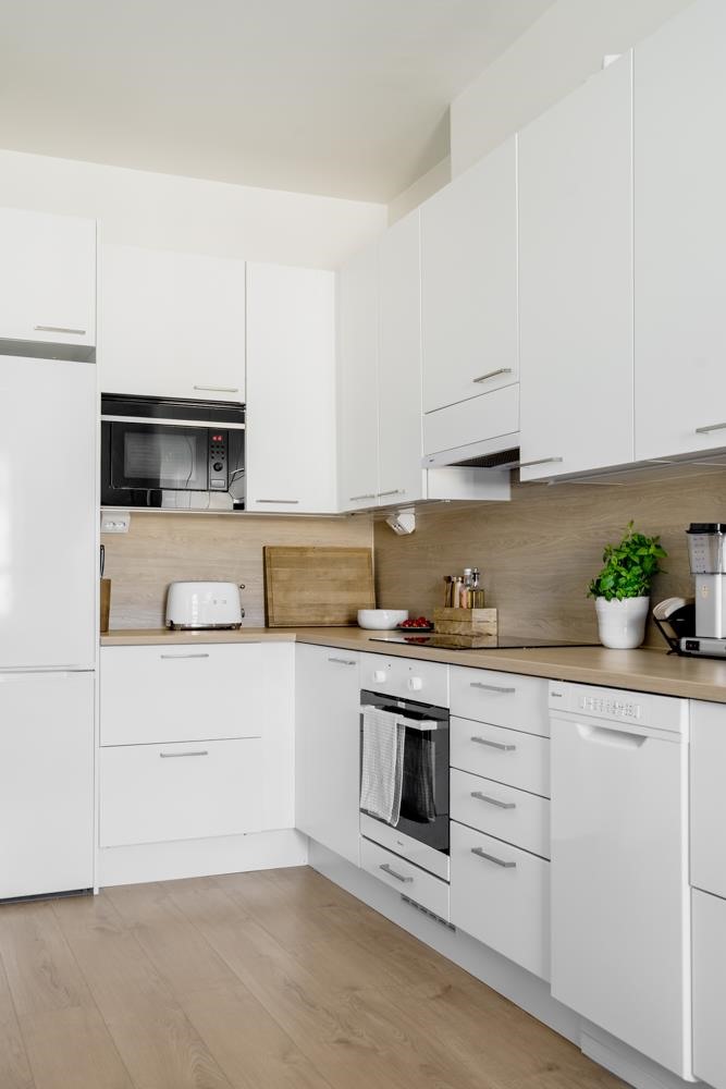 - Jääkaappipakastin, induktioliesi, liesikupu, mikroaaltouuni, astianpesukone, kaapistot, kiinteät valaisimet.