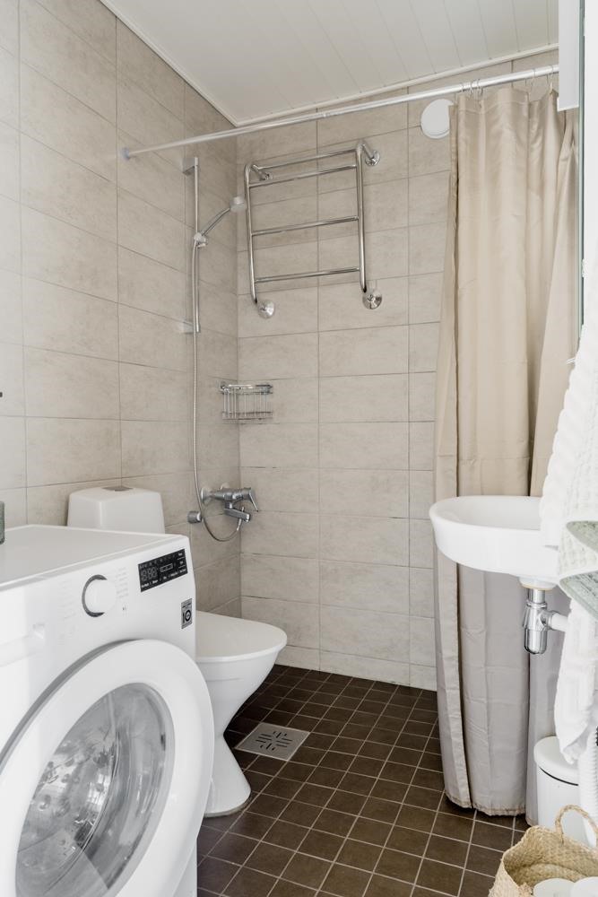 - Kylpyhuone, suihku, peilikaappi, pesukoneliitäntä, kiinteät valaisimet.