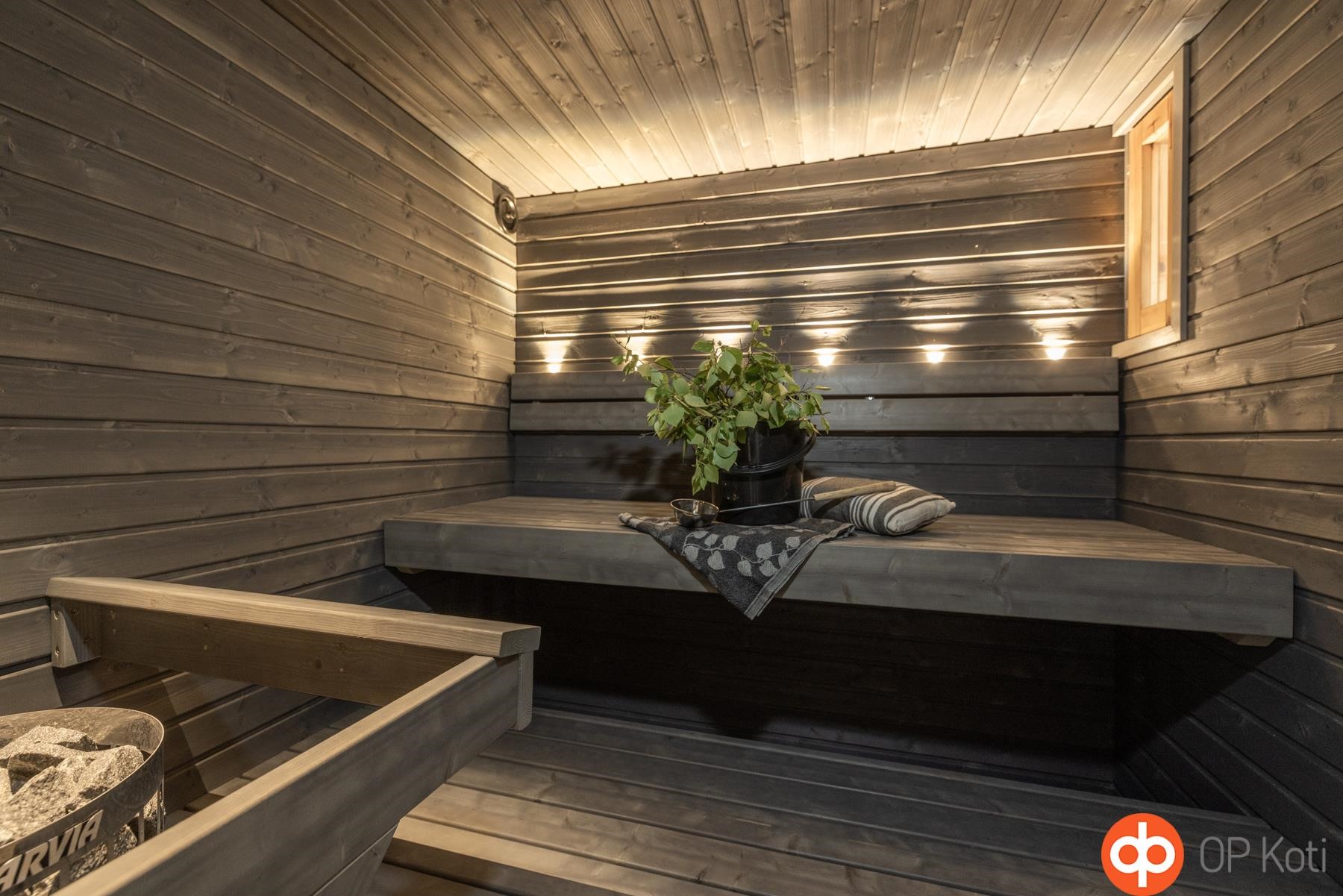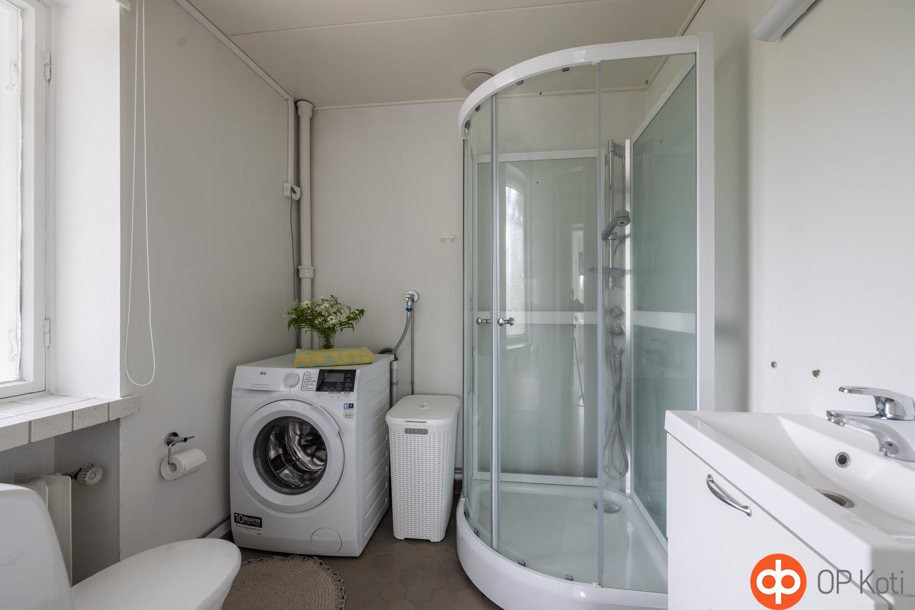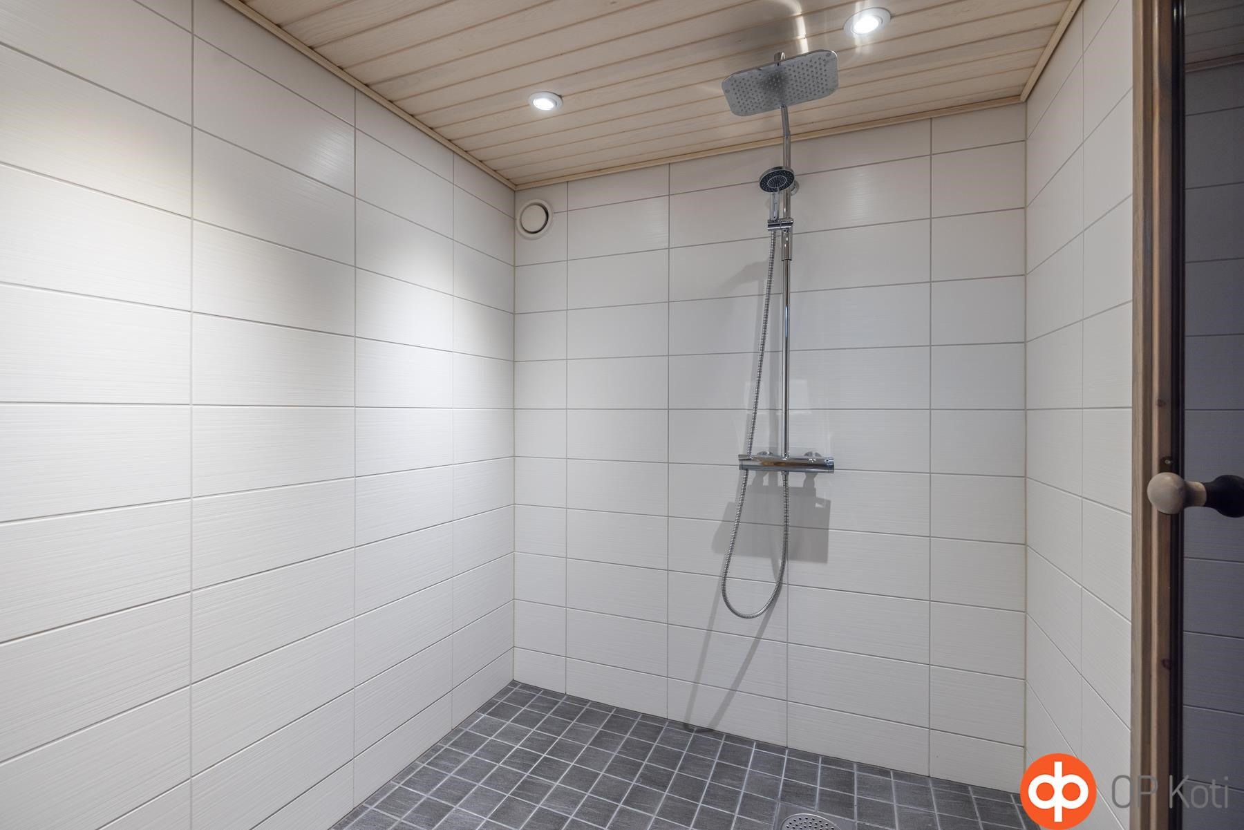 - Sauna, sähkökiuas, kylpyhuone, erillinen wc, suihku, suihkukaappi, peilit, kaapit, pesukoneliitäntä, lattialämmitys pesuhuoneessa ja menee myös osittain saunaan, kiinteät valaisimet.