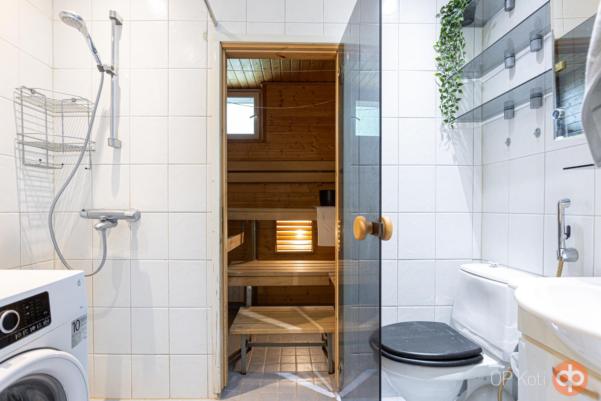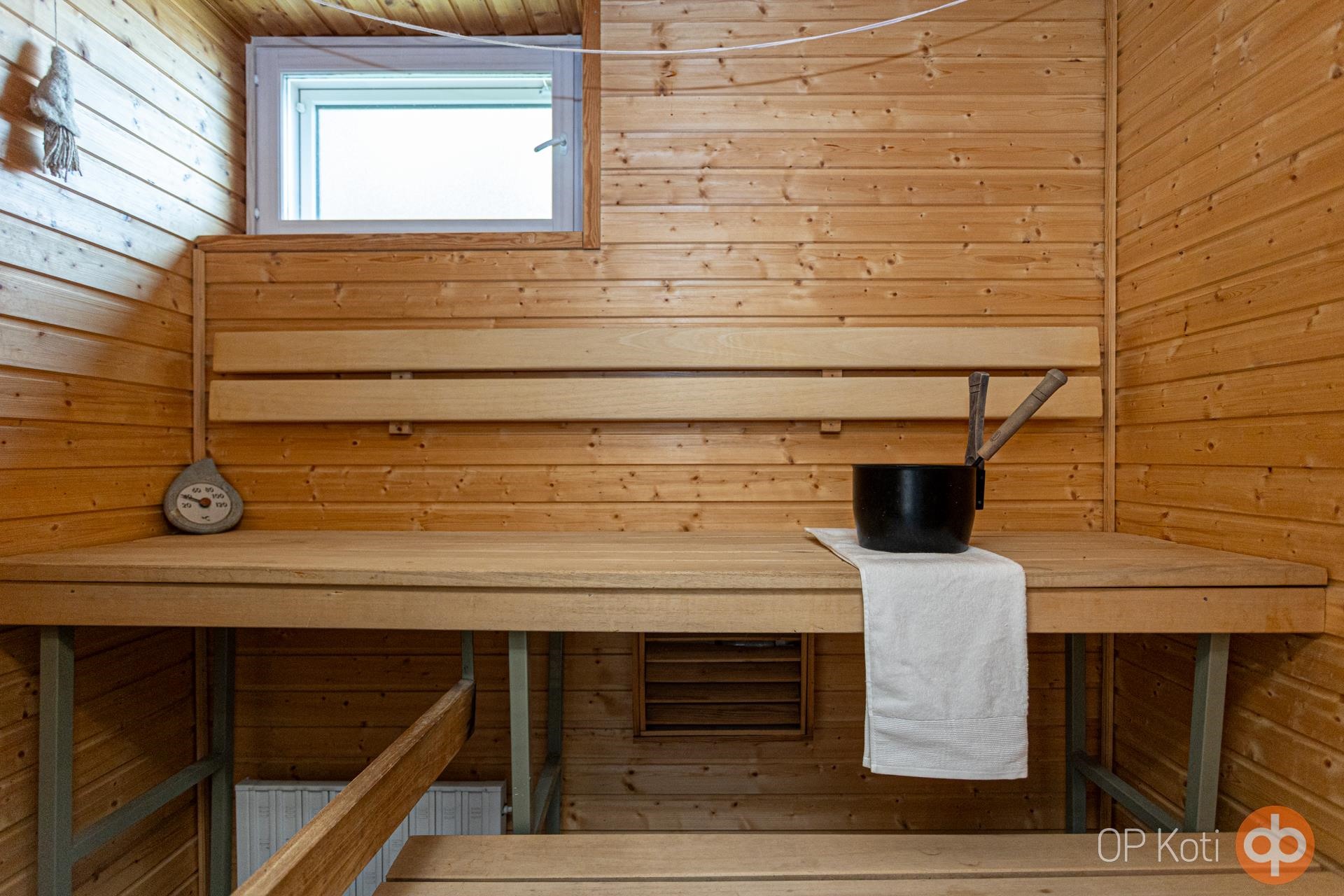 - Sauna, sähkökiuas, kylpyhuone, suihku, peilikaappi, pesukoneliitäntä, kiinteät valaisimet.