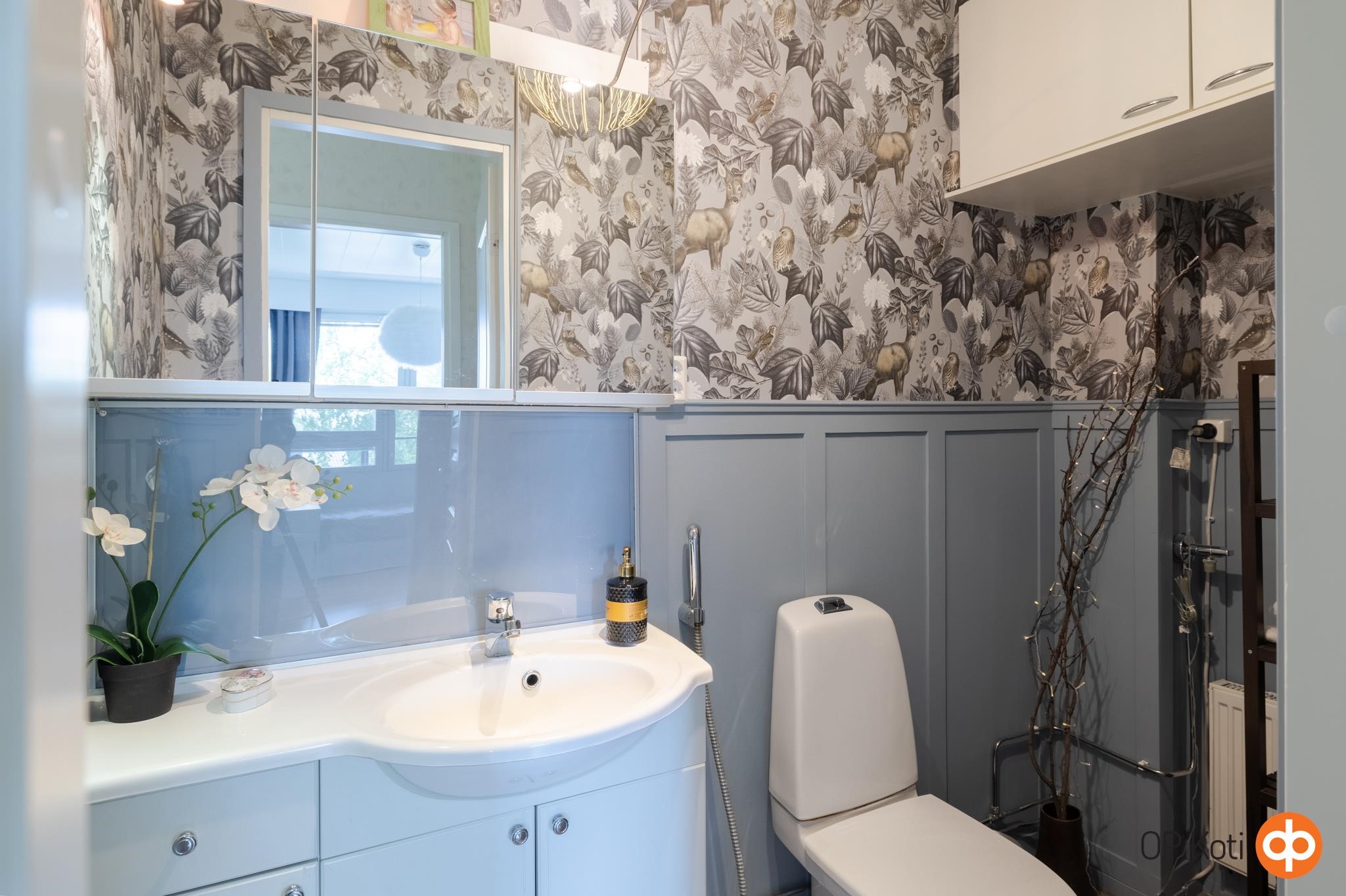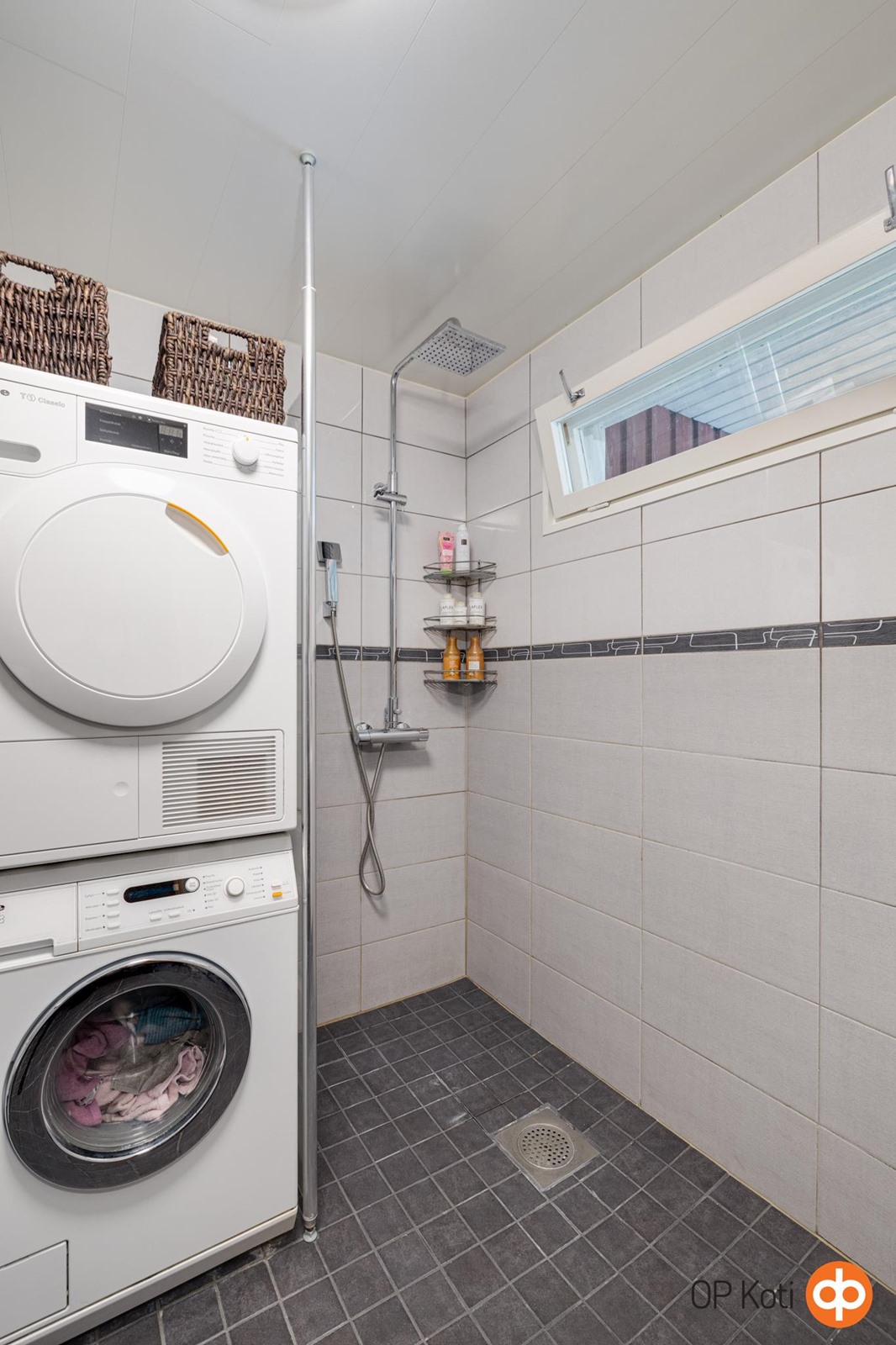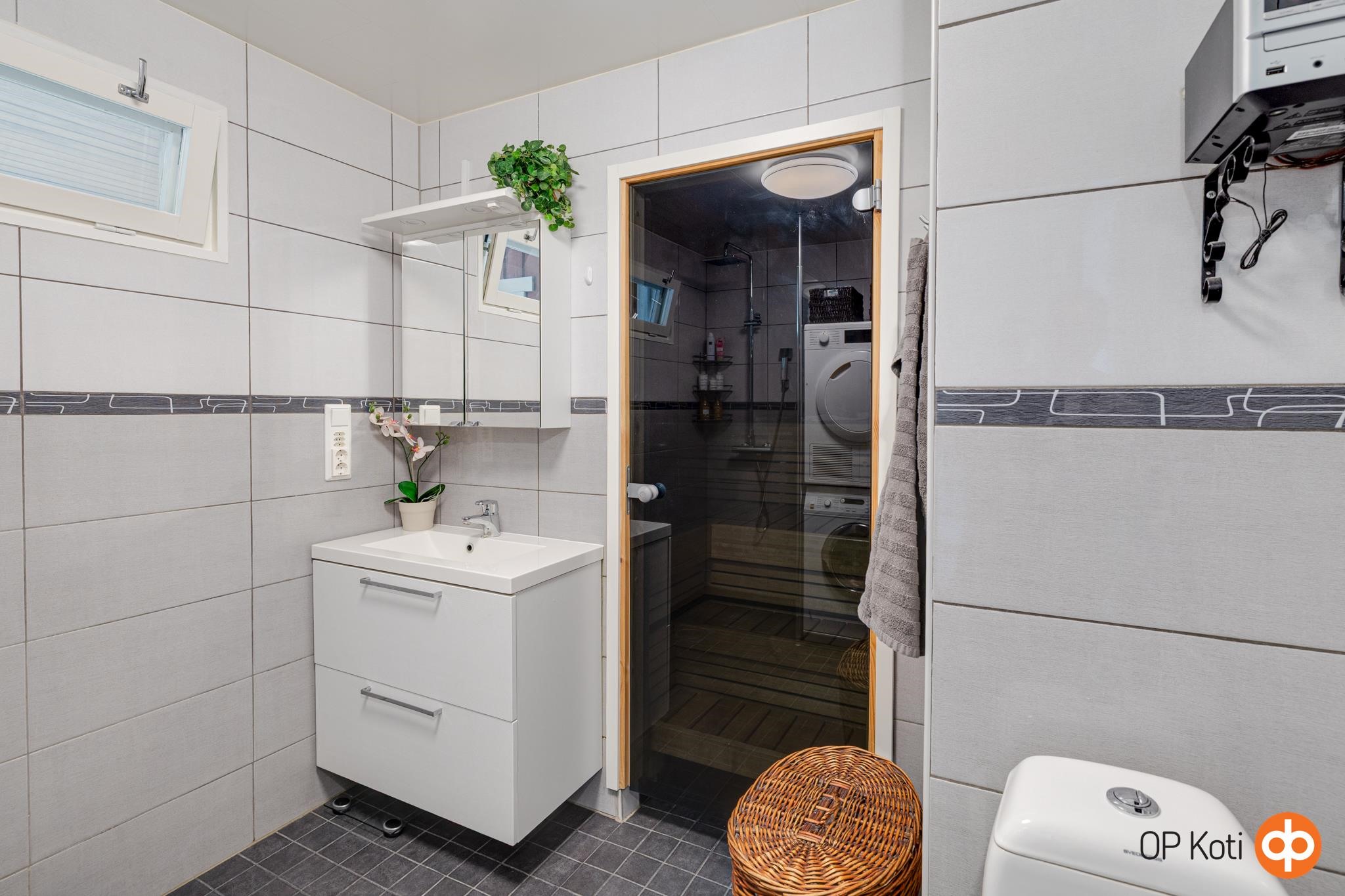 - Sauna, sähkökiuas, kylpyhuone, erillinen wc yläkerrassa, suihku, suihkuseinä, peilikaappi 2 kpl, kaapit yläkerrassa, allaskaappi ala- ja yläkerrassa, pesukoneliitäntä ala- ja yläkerrassa, lattialämmitys vesikiertoinen lattialämmitys kylpyhuoneessa, kiinteät valaisimet. Kylpyhuone ja sauna remontoitu / Bastu och badrum renoverats 2016