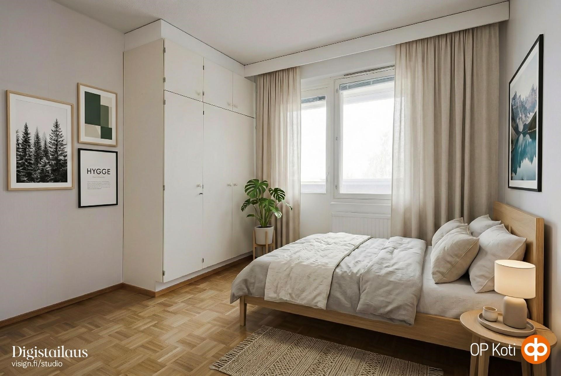 Asunnon olohuoneesta ja keittiöstä avautuvat kauniit puistomaiset näkymät. Makuuhuoneessa on reilusti säilytystilaa ja sieltä on kulku lasitetulle parvekkeelle. Tästä saat mainion mahdollisuuden remontoida kotin juuri omaan makuun sopivaksi.