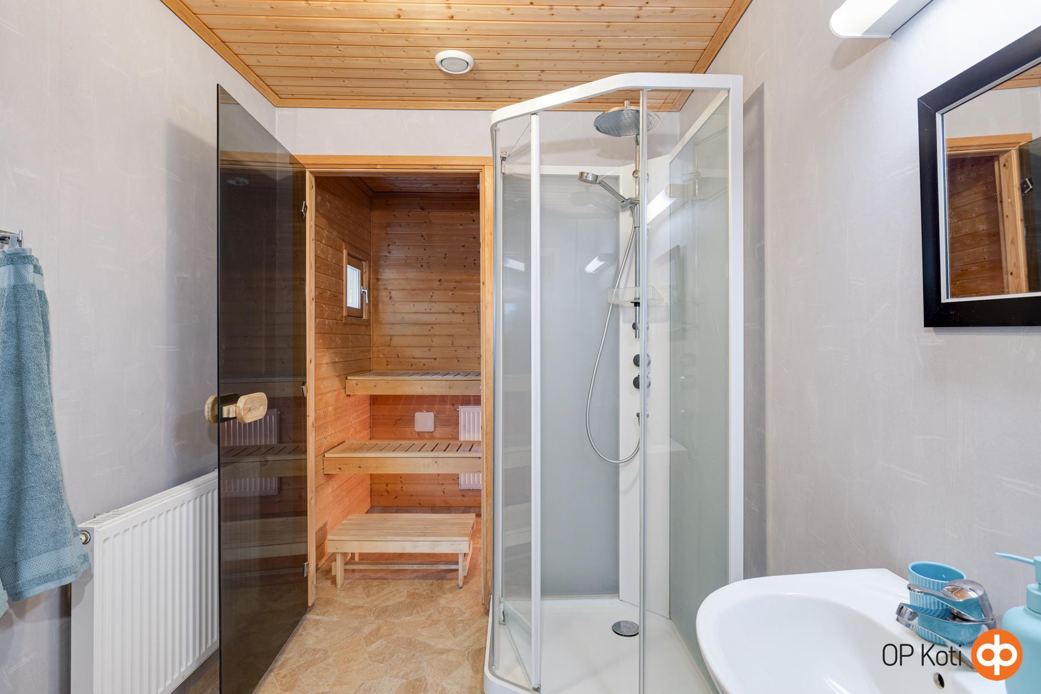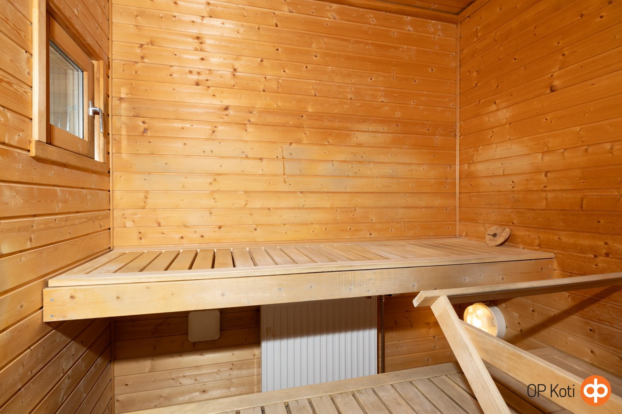 - Sauna, sähkökiuas, kylpyhuone, erillinen wc, suihku (IDO-sadesuihku), suihkukaappi, pesukoneliitäntä, lattialämmitys Pesuhuoneessa, kiinteät valaisimet. Saunassa ikkuna.