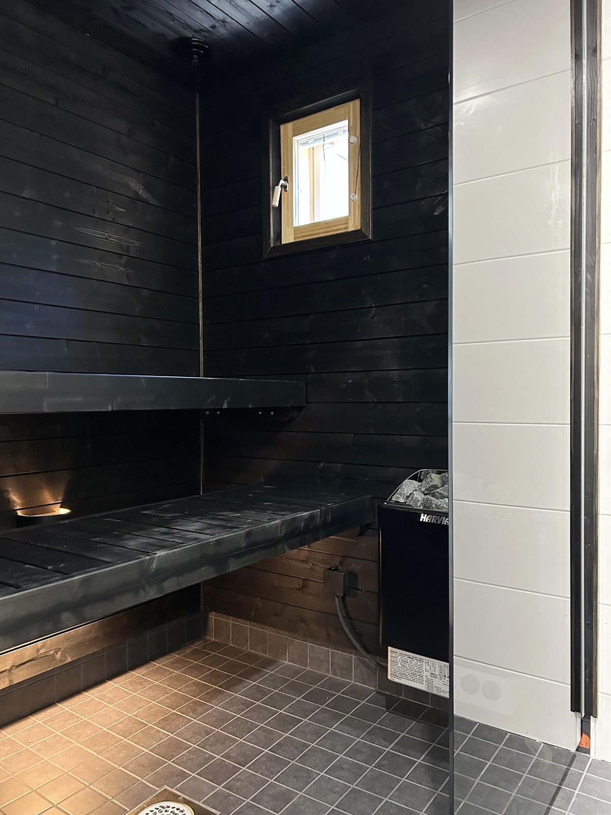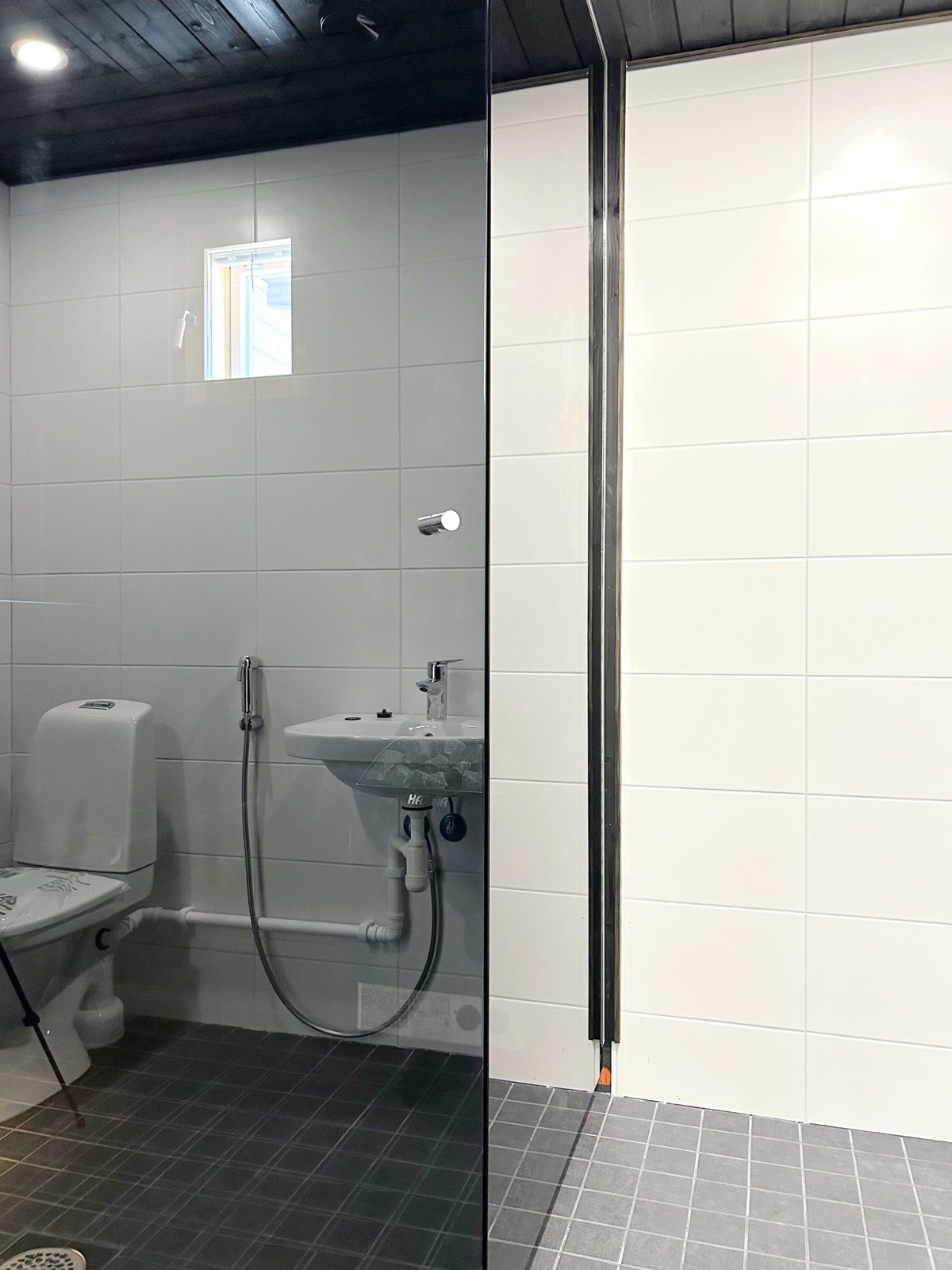 - Kylpyhuoneessa suihku, lasiseinäinen sauna, wc-istuin ja käsienpesuallas. Kodinhoitohuone ja erillinen wc.