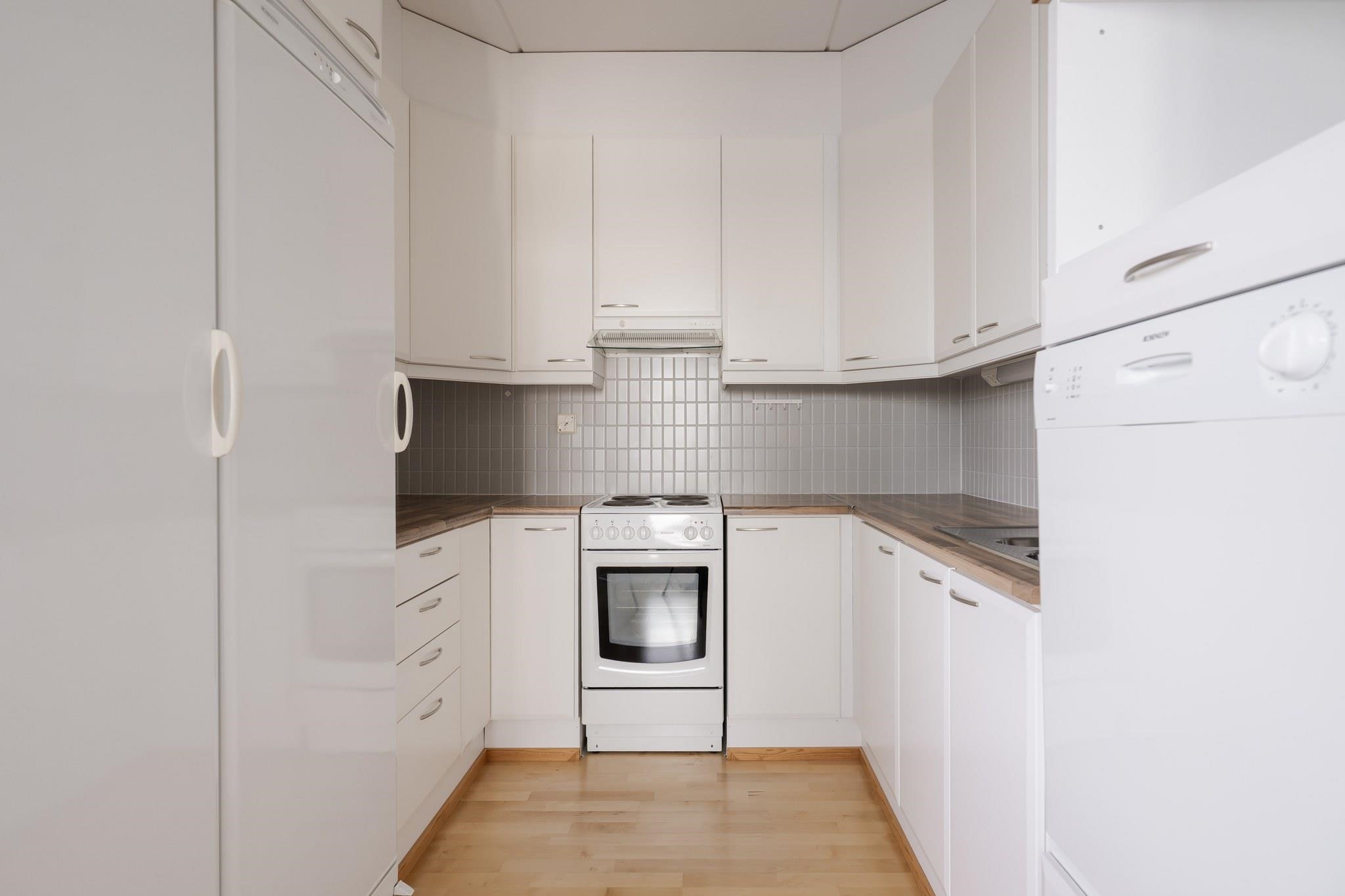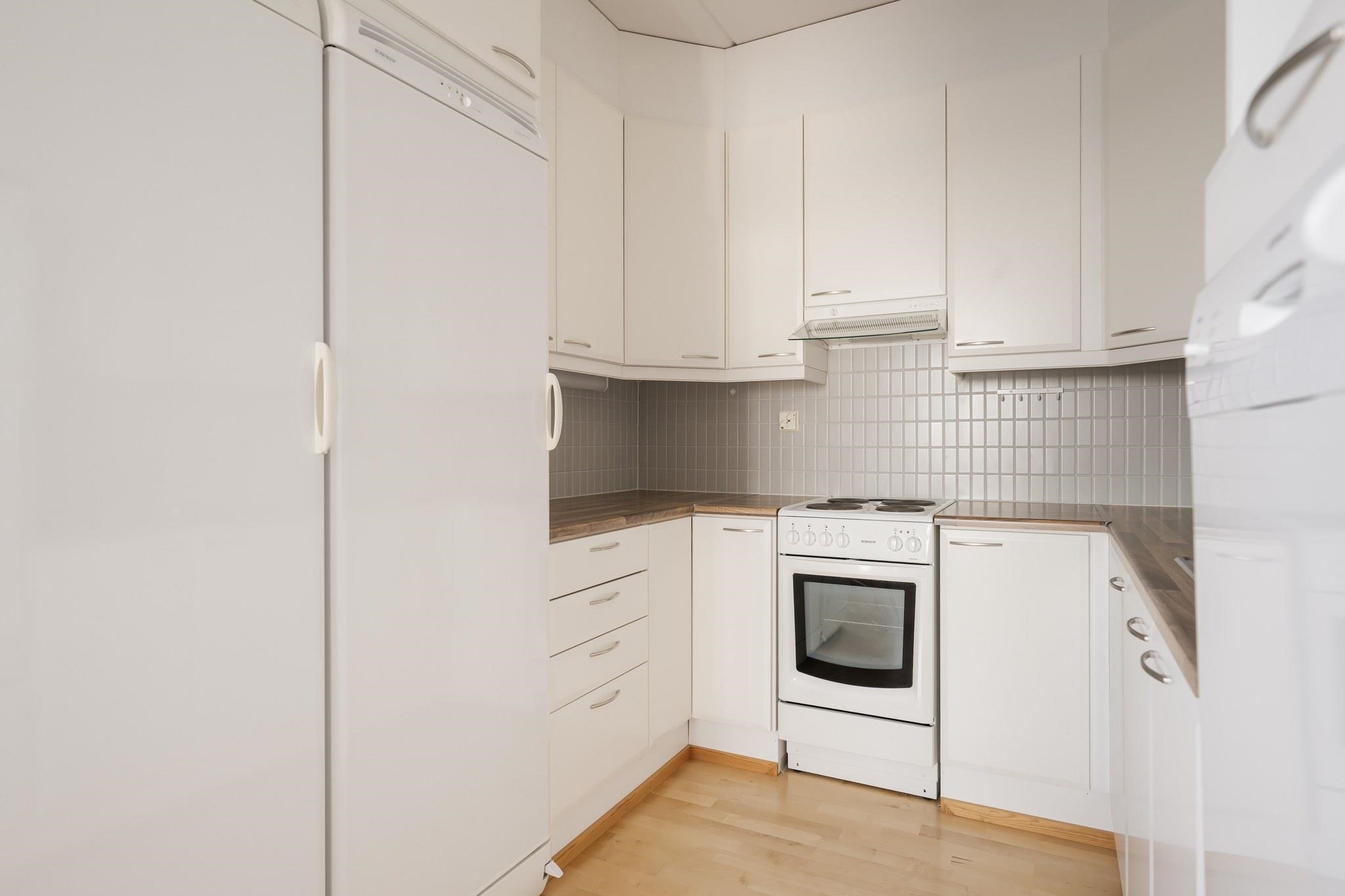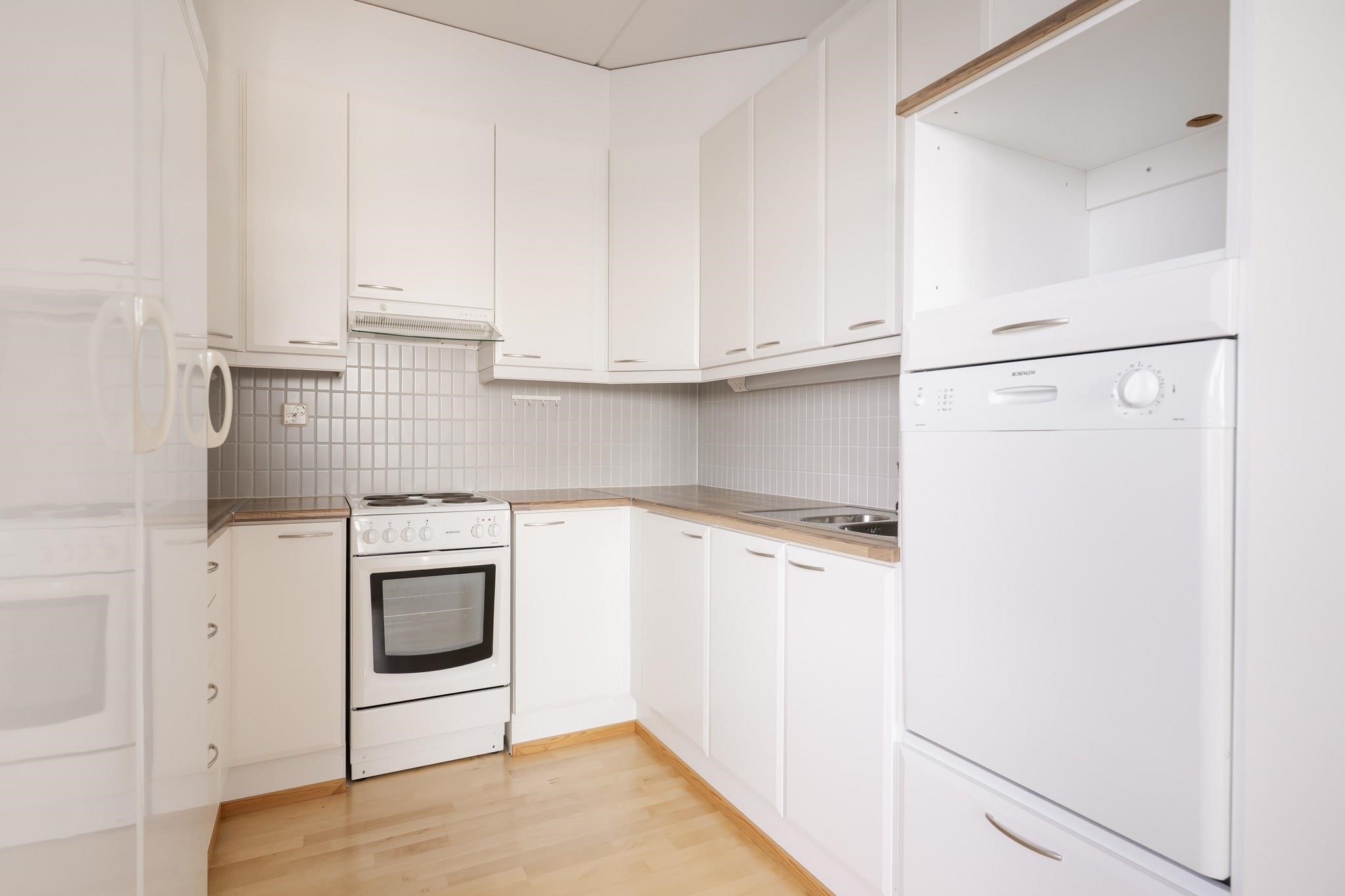- Jääkaappi, pakastekaappi, sähköliesi, liesituuletin, astianpesukone, kiinteät valaisimet.
