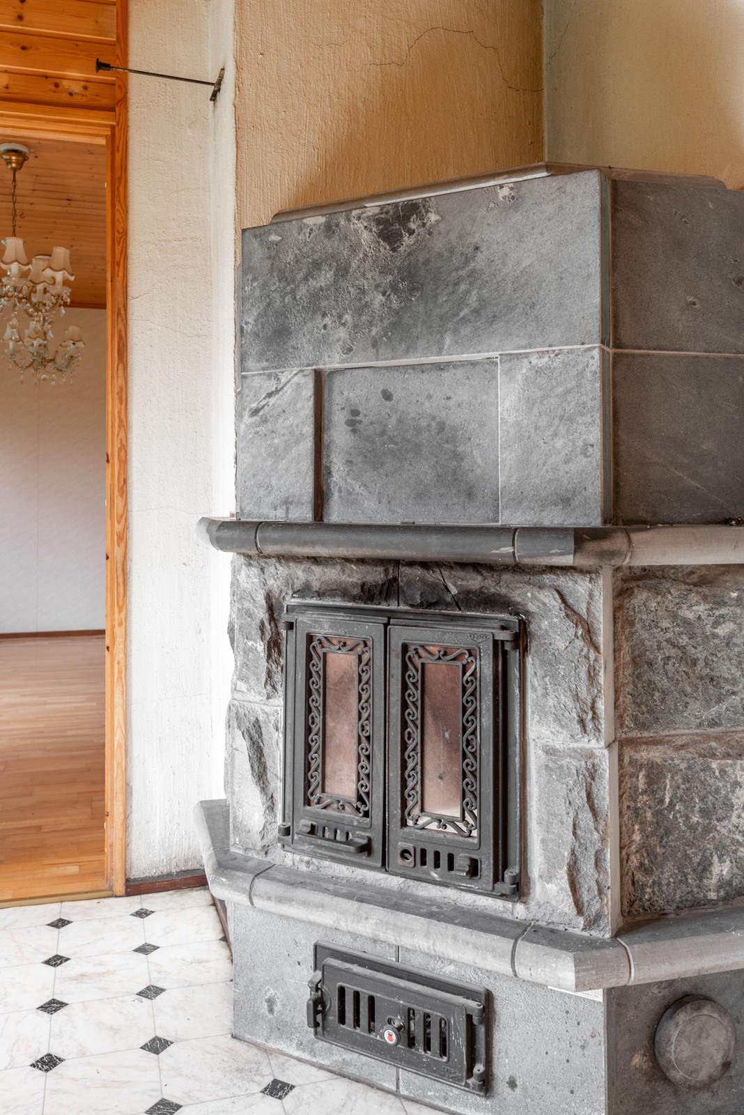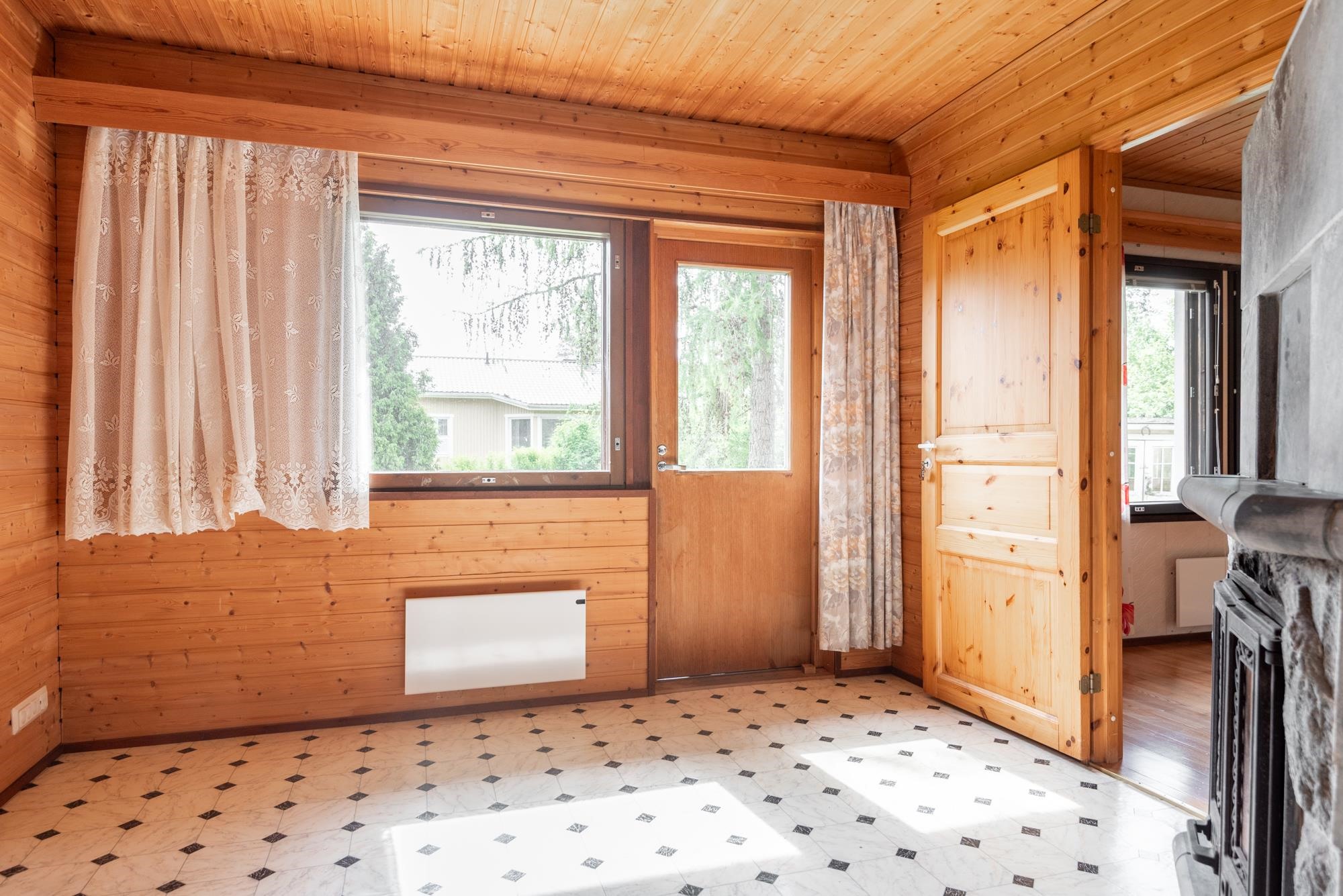 Sisätiloissa remonttia kaipaavat huoneet tarjoavat mahdollisuuden toteuttaa omia sisustusunelmia. Olohuoneen yhteyteen sijoittuva takkahuone kutsuu rentoutumaan takkatulen äärelle. Keittiöstä löytyy kaikki tarvittava kotikokkailuun ja sauna tarjoaa paikan rentoutumiselle. Autotallin yhteydessä oleva varasto tarjoaa runsaasti lisätilaa esimerkiksi harrastusvälineille tai työkaluille.