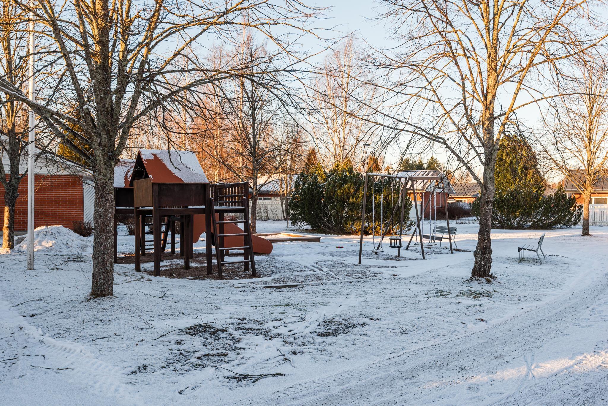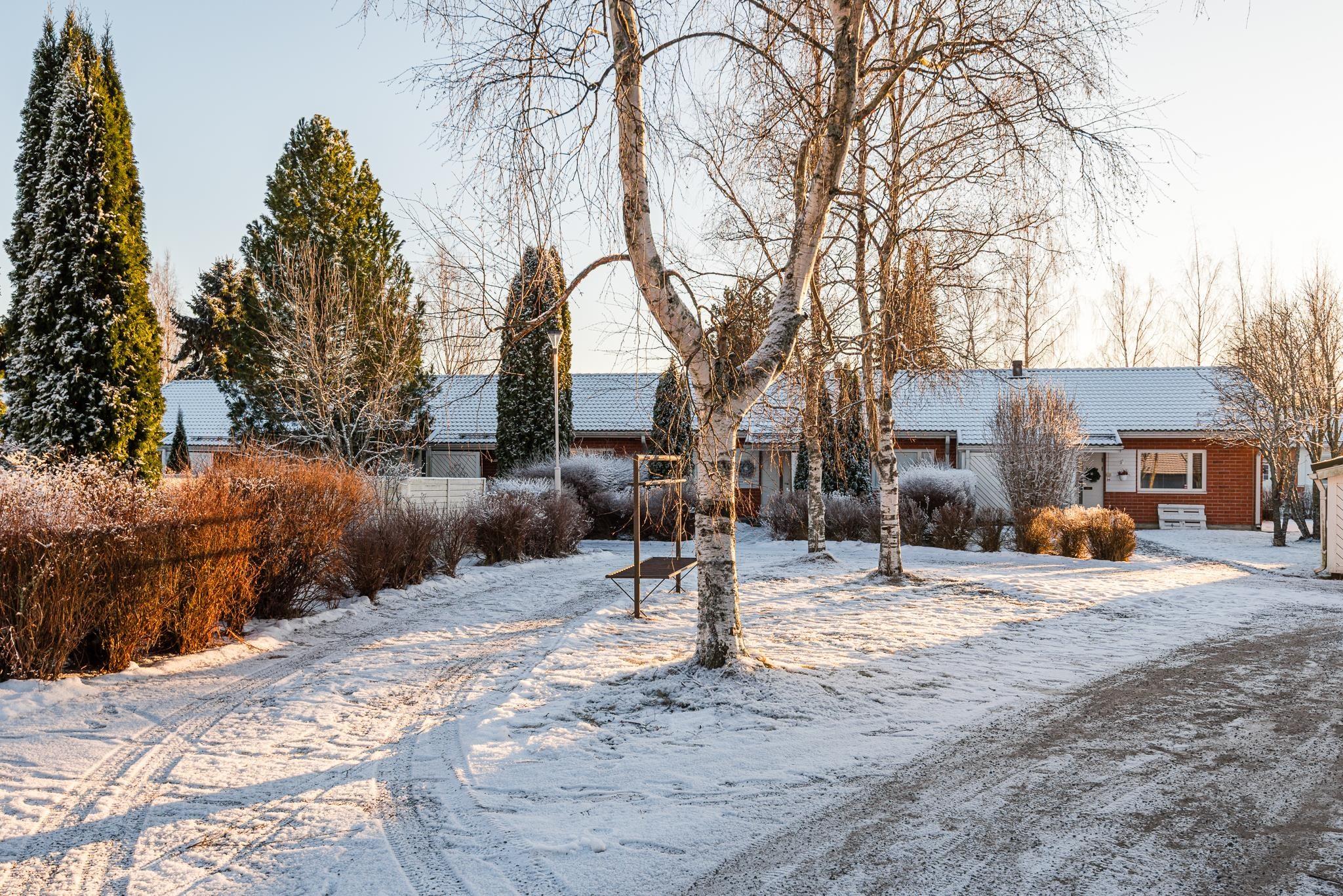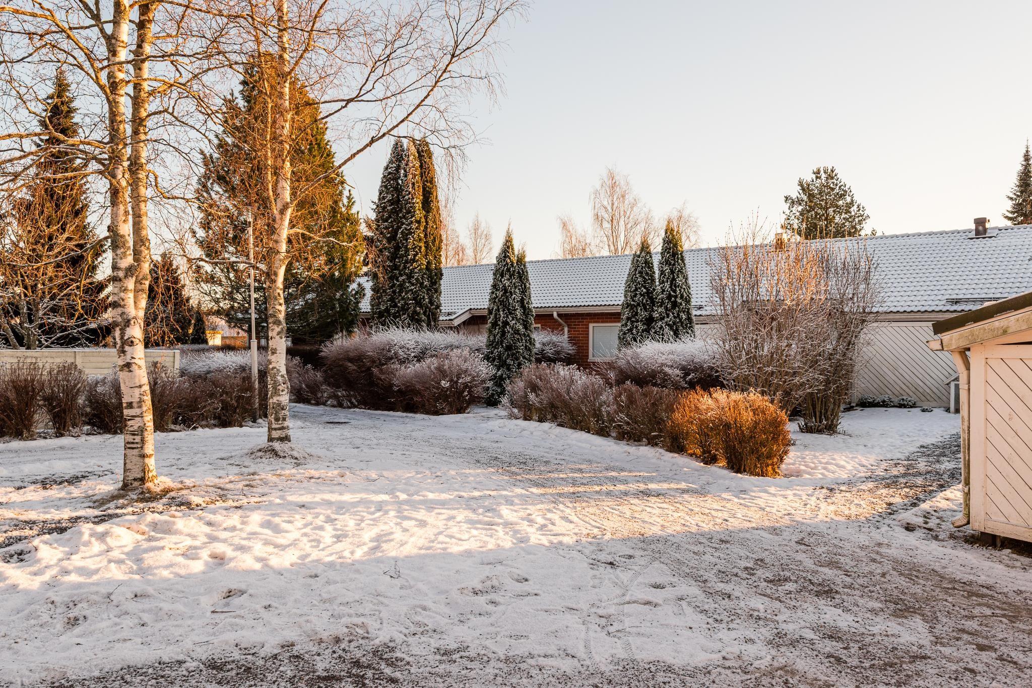 Viehättävä, suuri piha-alue rauhallisesti talon päädyssä, vieressä puistoalue. Autolle katospaikka.
