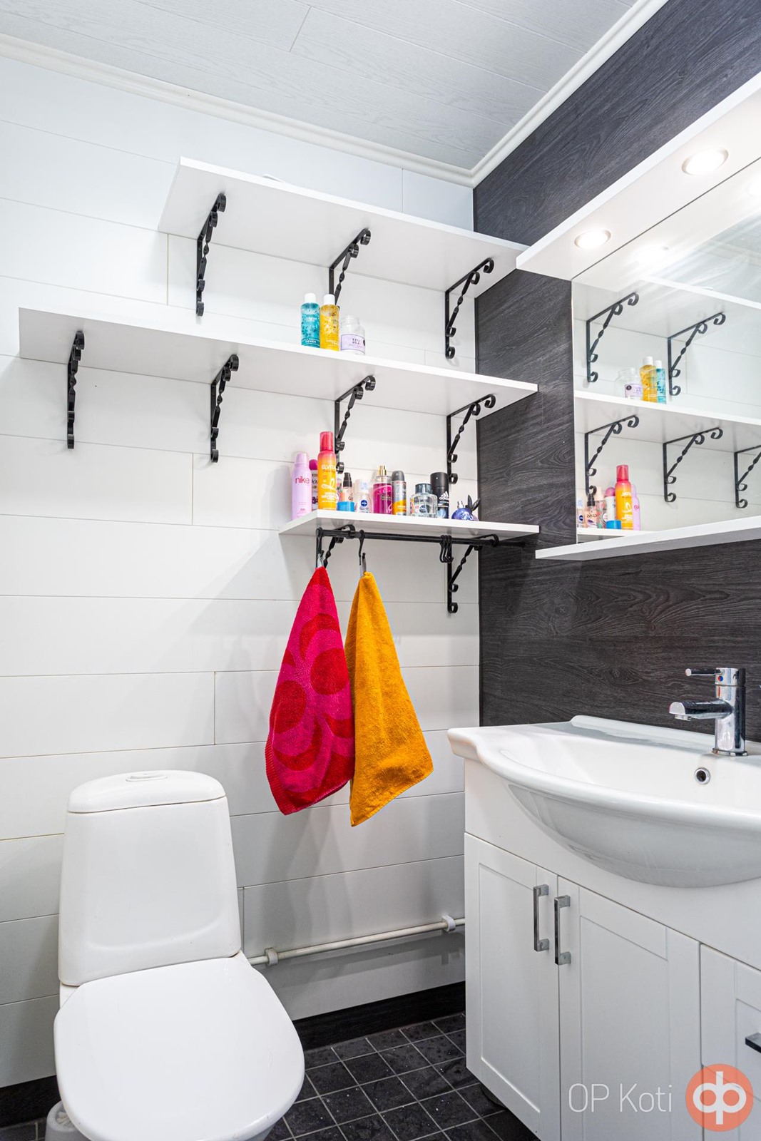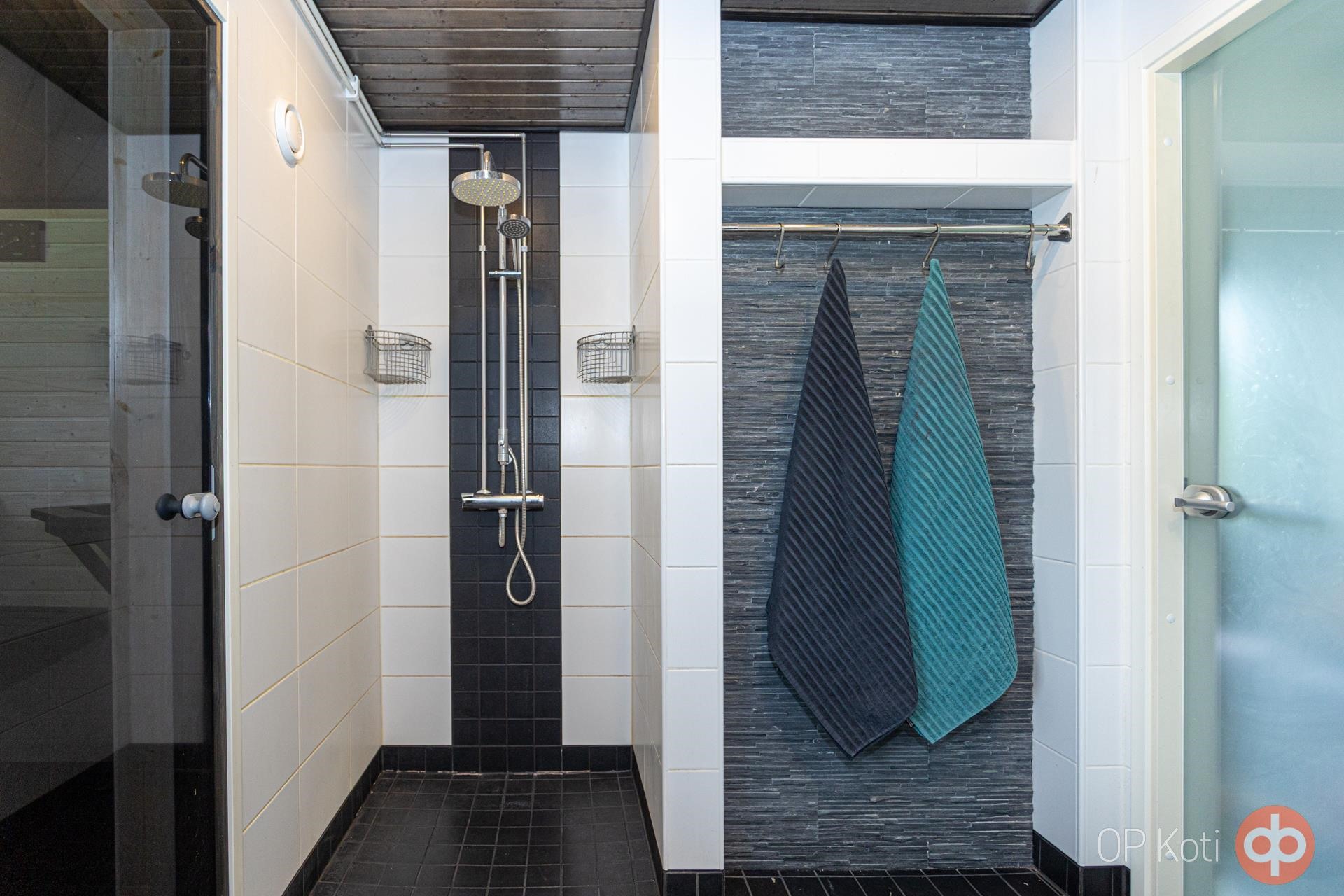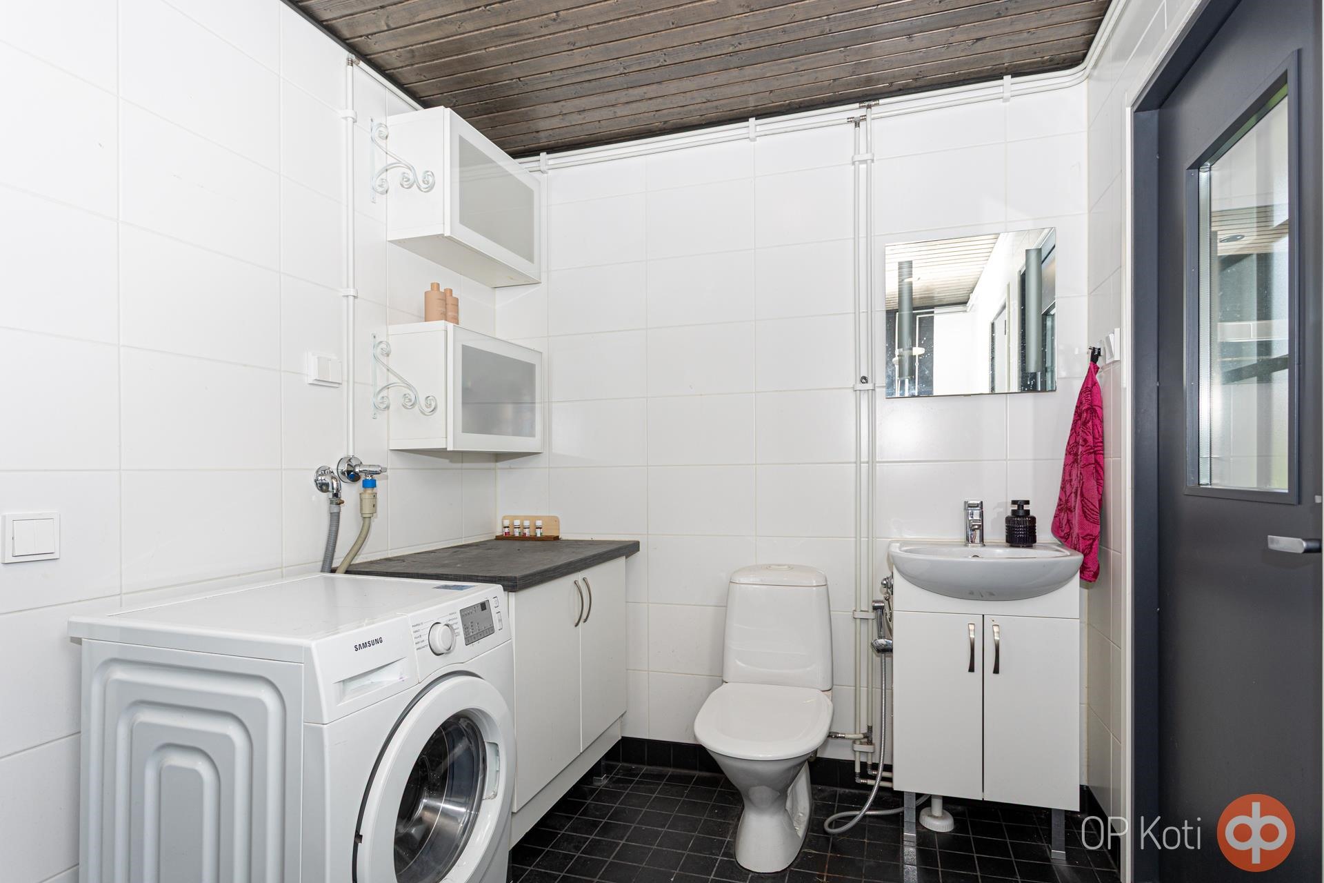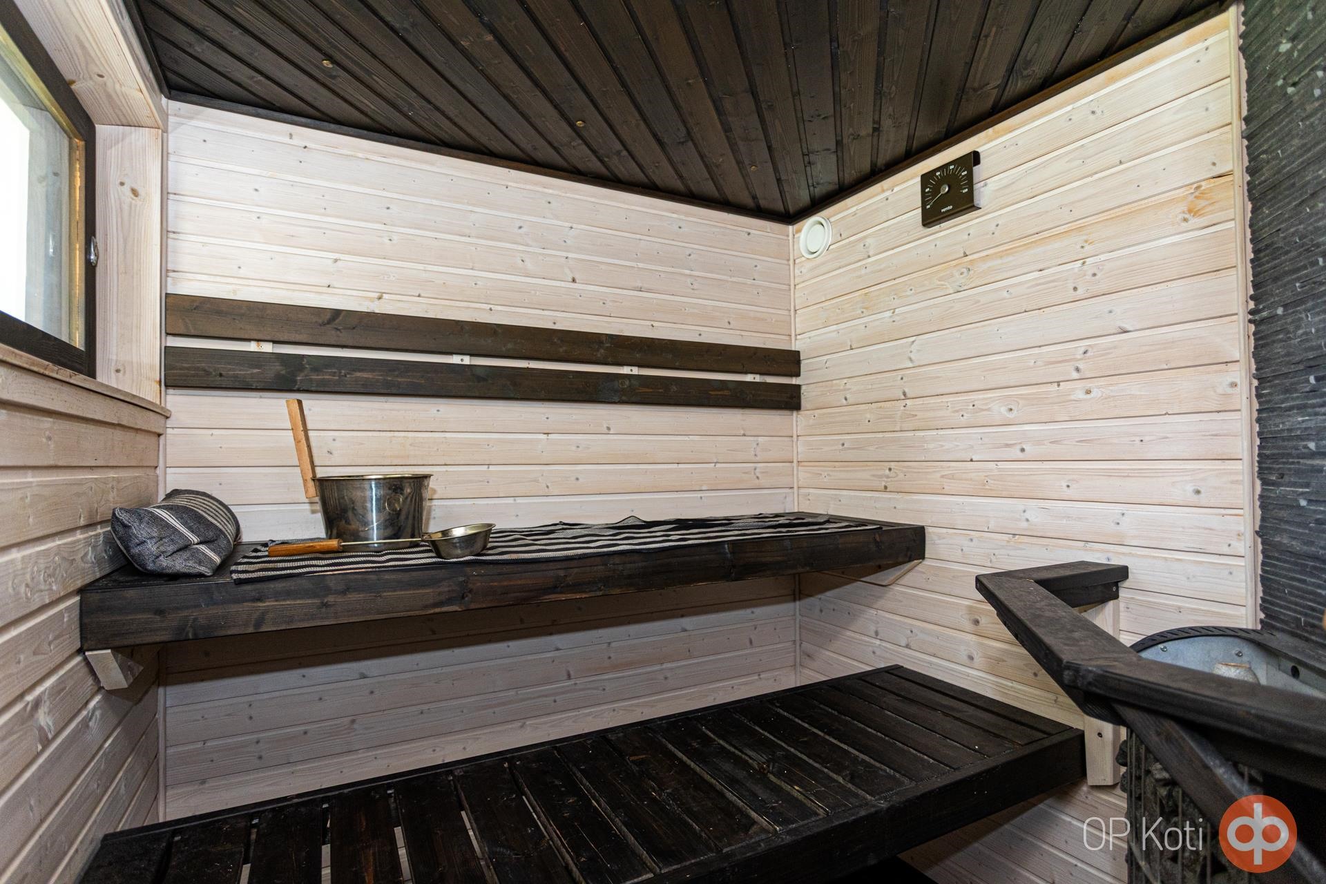 - Sauna, sähkökiuas, kylpyhuone, erillinen wc, suihku, peilikaappi, pesukoneliitäntä, kiinteät valaisimet, Seinähyllyt.