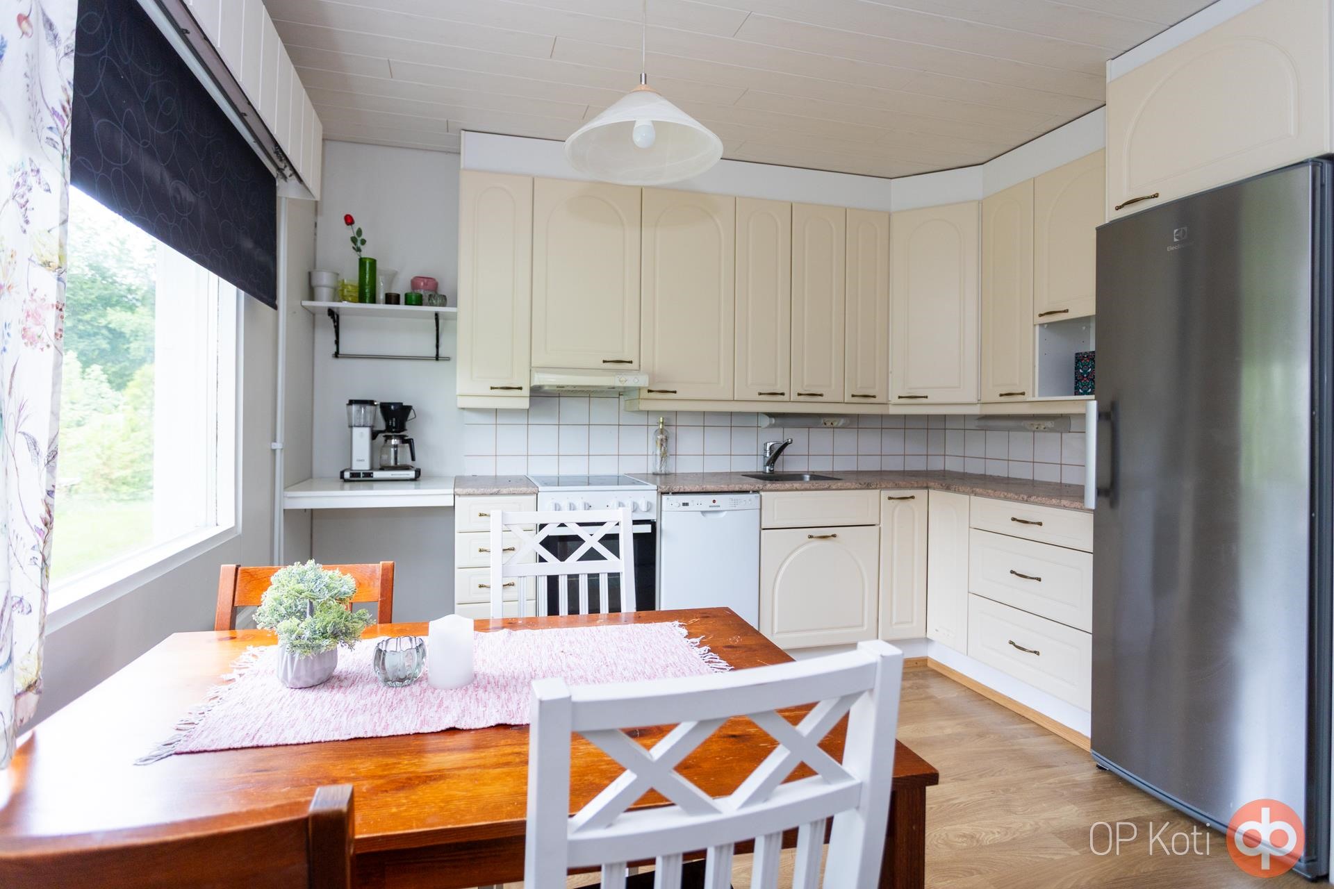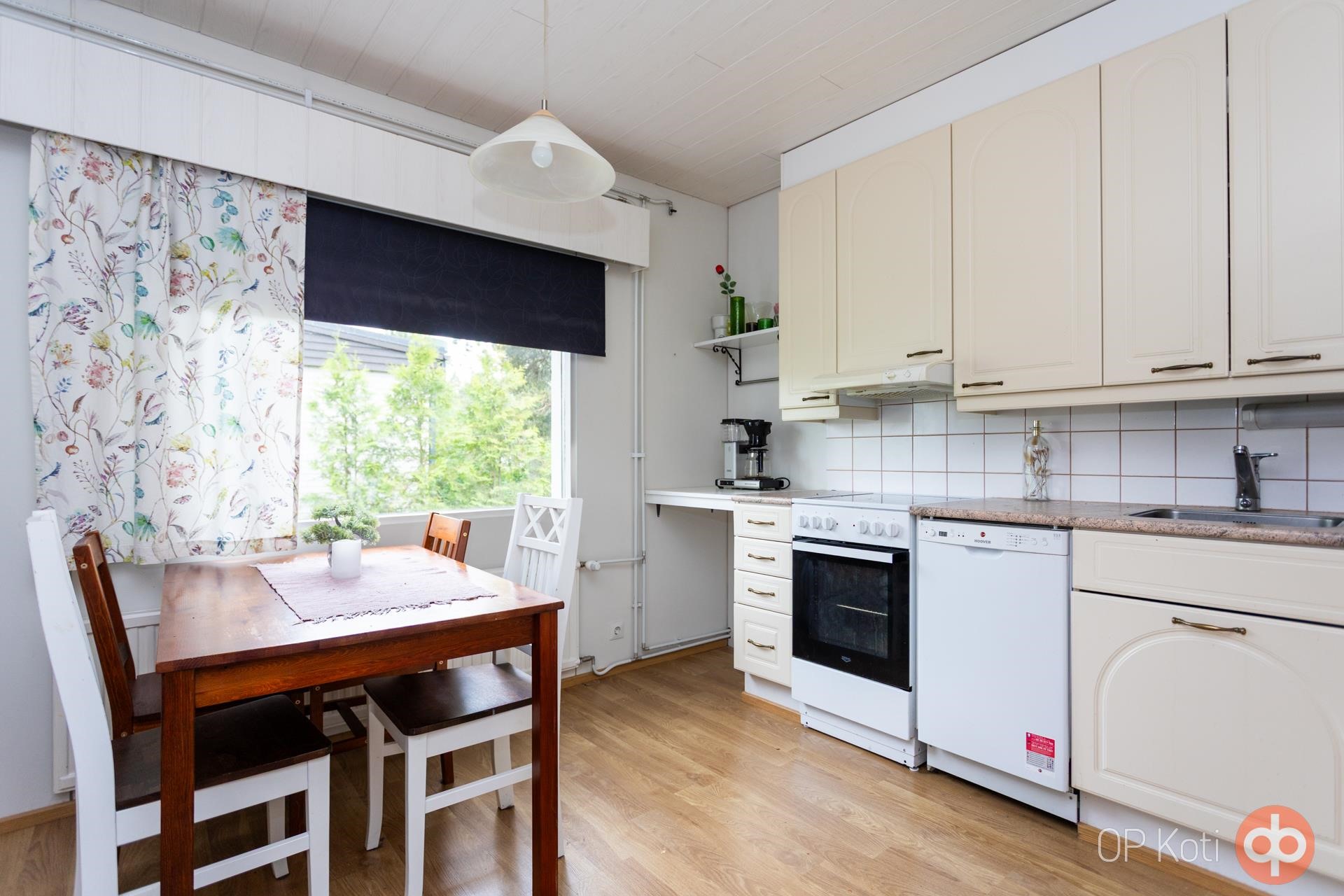 - Jääkaappi, sähköliesi, liesituuletin, astianpesukone, pöytätasojen materiaali laminaatti.