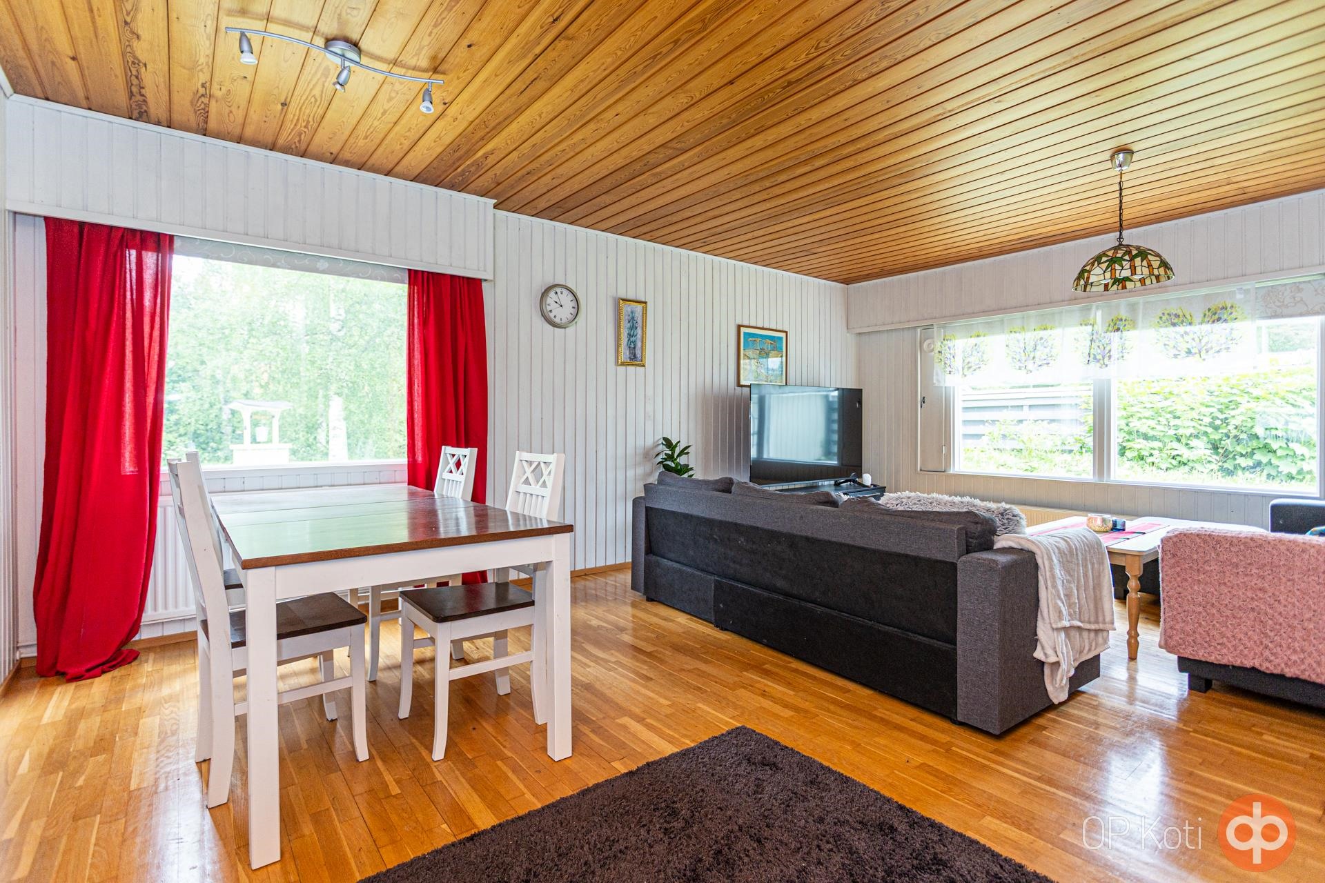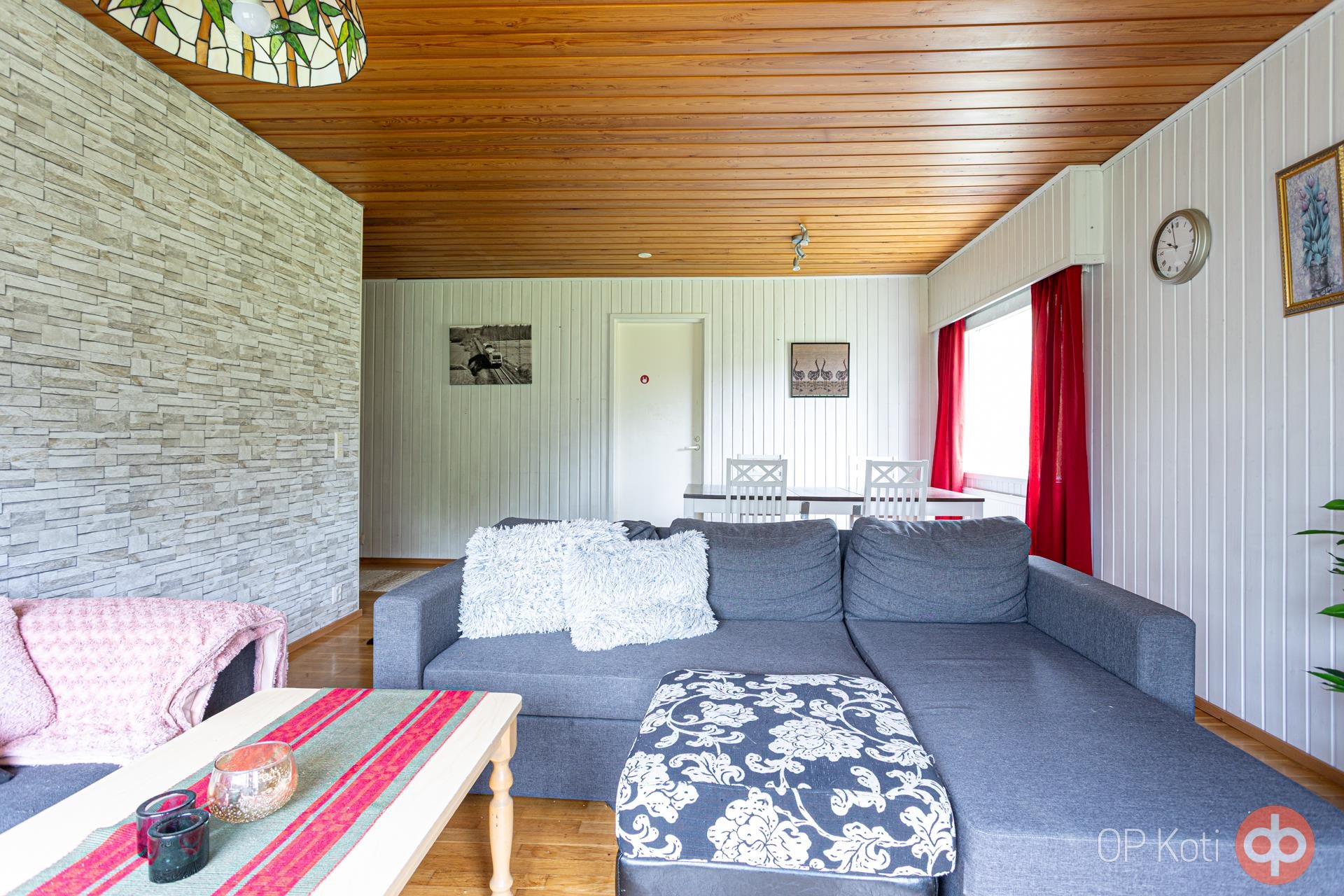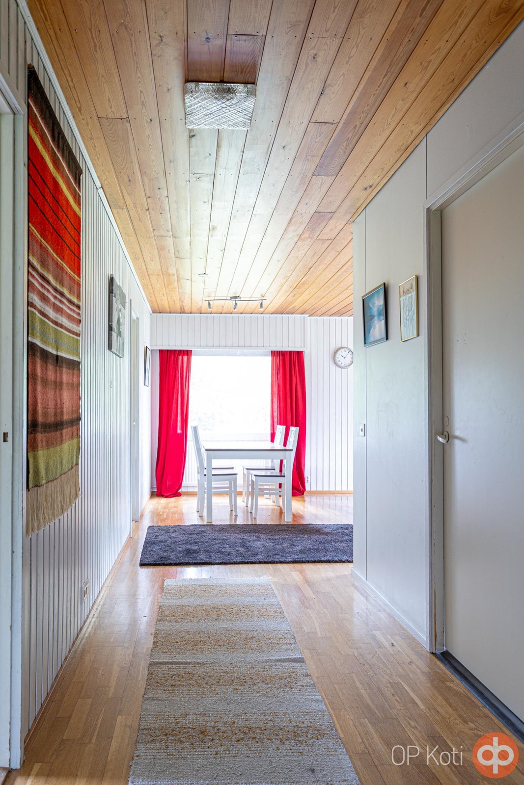 - Keittiö: Lattia laminaatti, seinät maali, katto mdf-levy. Olohuone: Lattia parketti, seinät tapetti/paneeli, katto paneeli. Makuuhuone 1: Lattia muovi, seinät tapetti/paneeli, katto paneeli. Makuuhuone 2: Lattia laminaatti, seinät puolipaneeli, katto paneeli. Makuuhuone 3: Lattia laminaatti, seinät tapetti/paneeli, katto mdf-levy. Sauna: Lattia kaakeli, seinät paneeli, katto puupaneeli. Kylpyhuone: Lattia kaakeli, seinät kaakeli, katto puupaneeli. Eteinen: Lattia parketti, seinät ja katto paneeli. Wc: Lattia kaakeli, seinät mdf-levy, katto mdf-levy.
