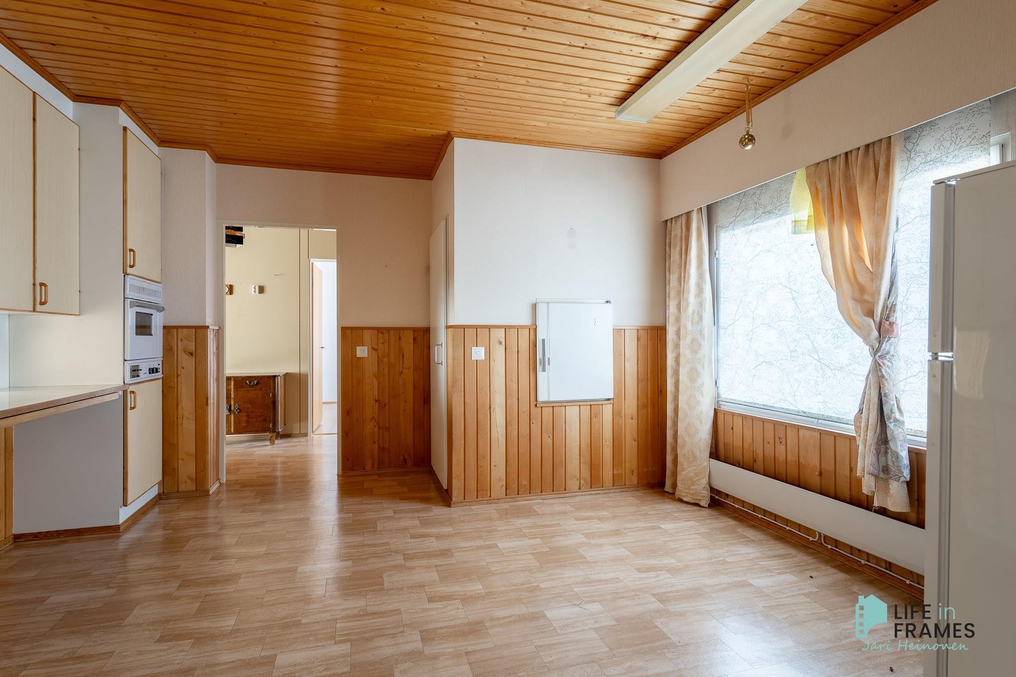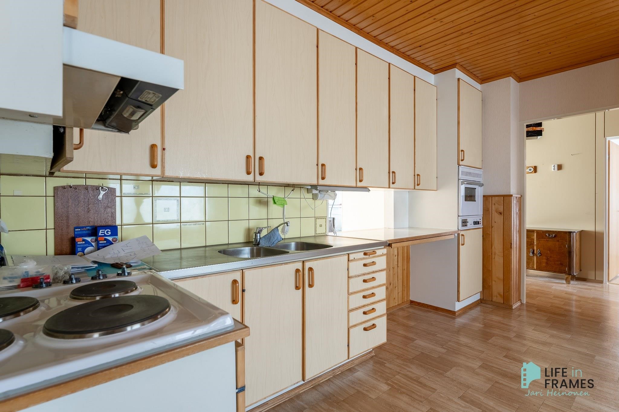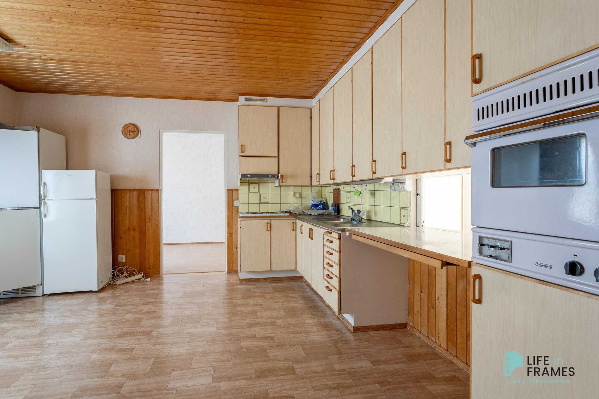 - Jääkaappipakastin, kylmiö (ei toimintakunnossa), jenkkikaappi, liesitaso, sähköliesi, liesituuletin, kaapistot, kiinteät valaisimet.