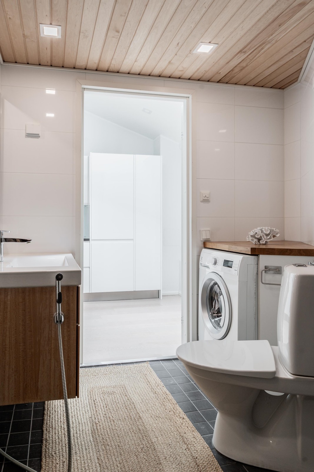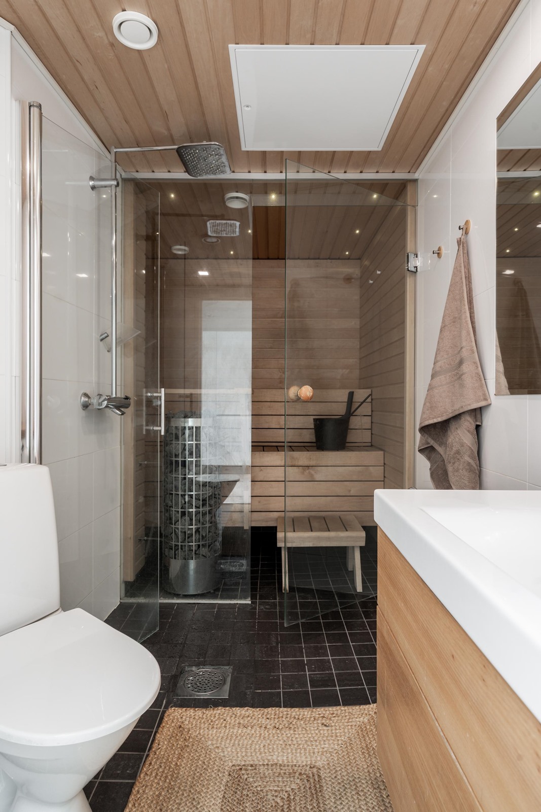 - Sauna, sähkökiuas, kylpyhuone, suihku, suihkuseinä, peilikaappi, allaskaappi, pesukoneliitäntä, lattialämmitys, kiinteät valaisimet.
