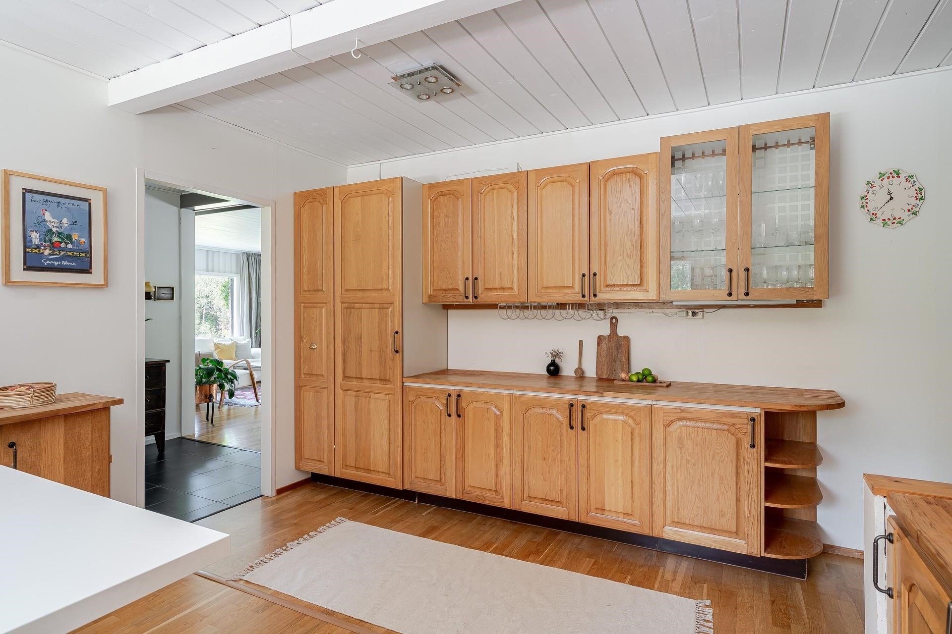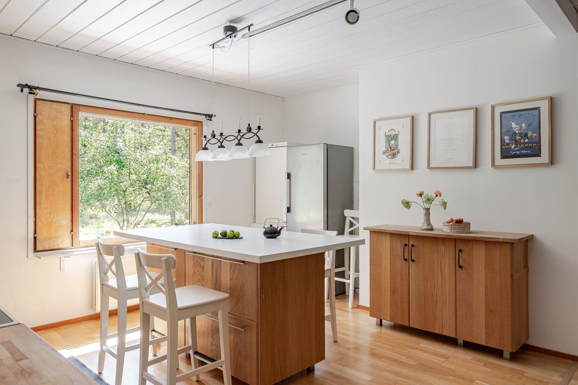 - Jääkaappi, Pakastekaappi, Keraaminen liesi, jossa uuni, Liesikupu, Liesituuletin hormi, Mikroaaltouuni, Astianpesukone, Saareke: Pinta laminaattia (L 1000 x P 1850 x K 910 mm), Kiinteät valaisimet, Pöytätasojen materiaali puu