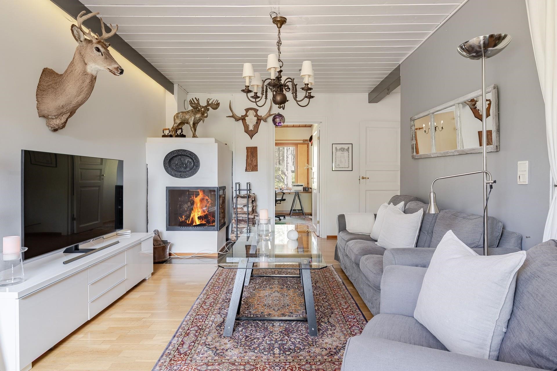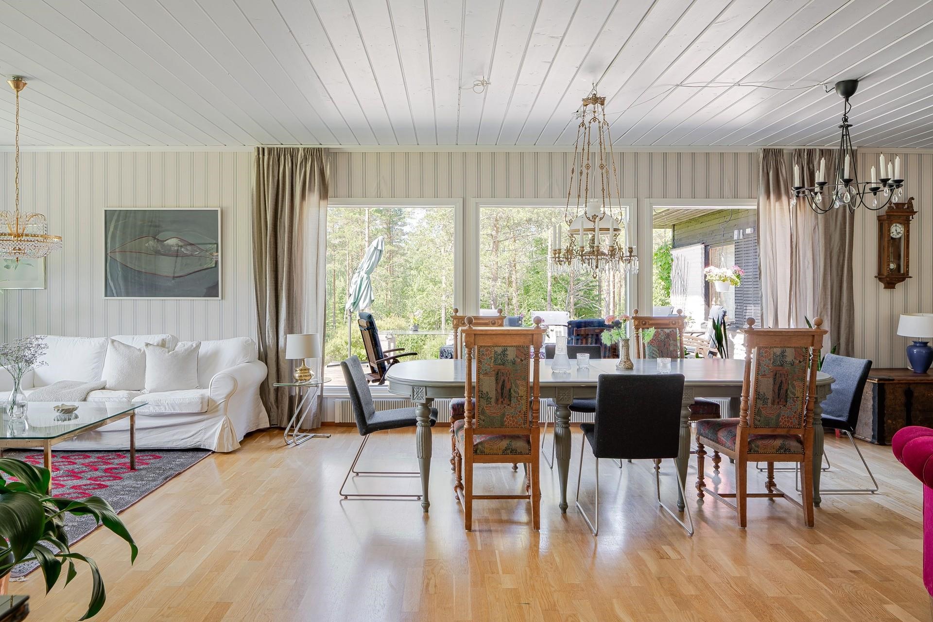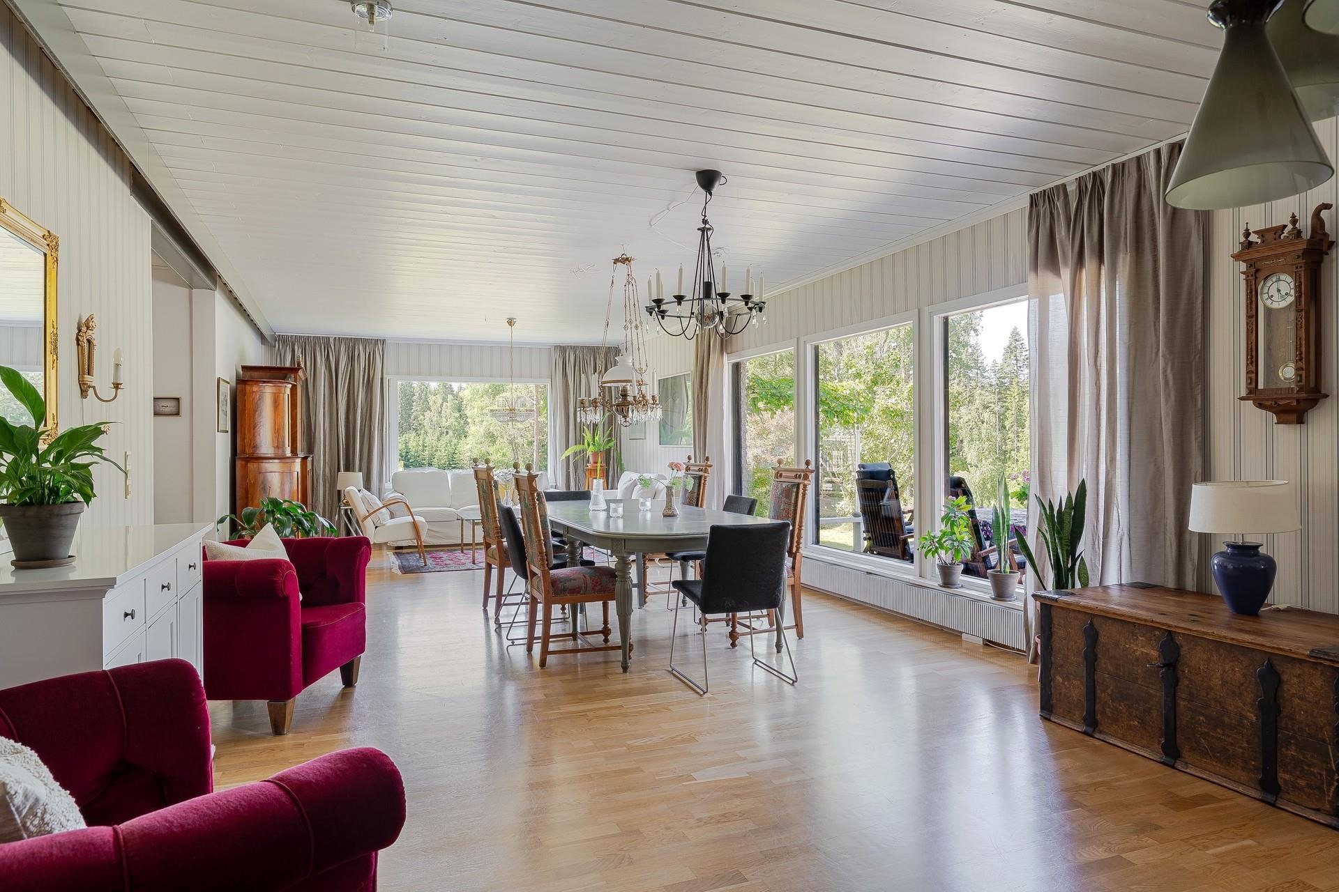Tämän valloittavan yksitasoisen talon sydän on avara ja valoisa n. 52 m2 olohuone, joka soveltuu isommankin perheen ja ystävien kestitsemiseen Sen lumoava tunnelma syntyy väreistä, laadukkaista materiaaleista ja suuresta ruokailuryhmästä, jonka ääreen on ihana kerääntyä. Olohuoneen yhteydessä on viihtyisä takkahuone, jossa voit nauttia tulen rauhoittavasta loimusta kylminä talvi-iltoina. Normaalia korkeampi huonekorkeus tuo lisää tilantuntua.