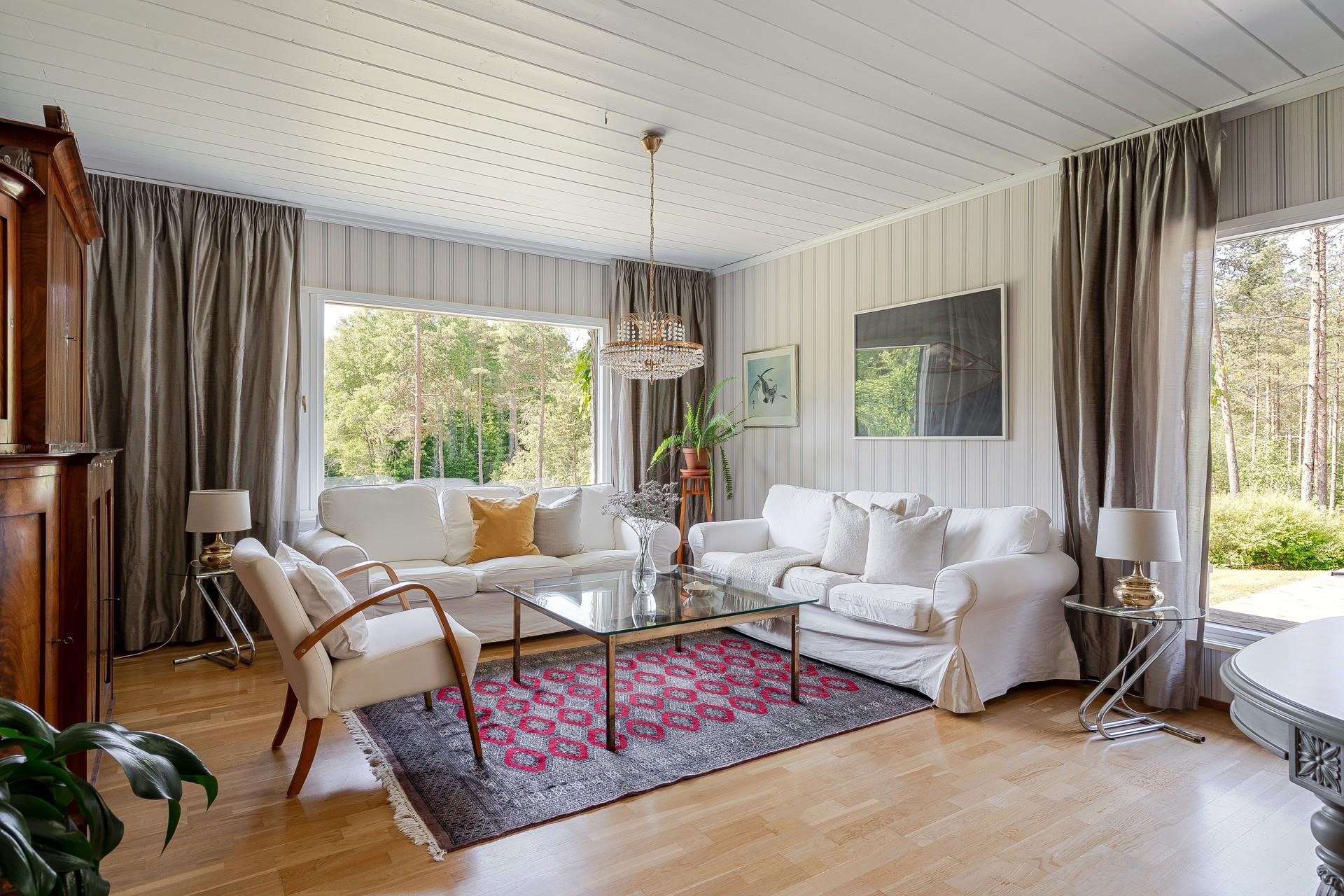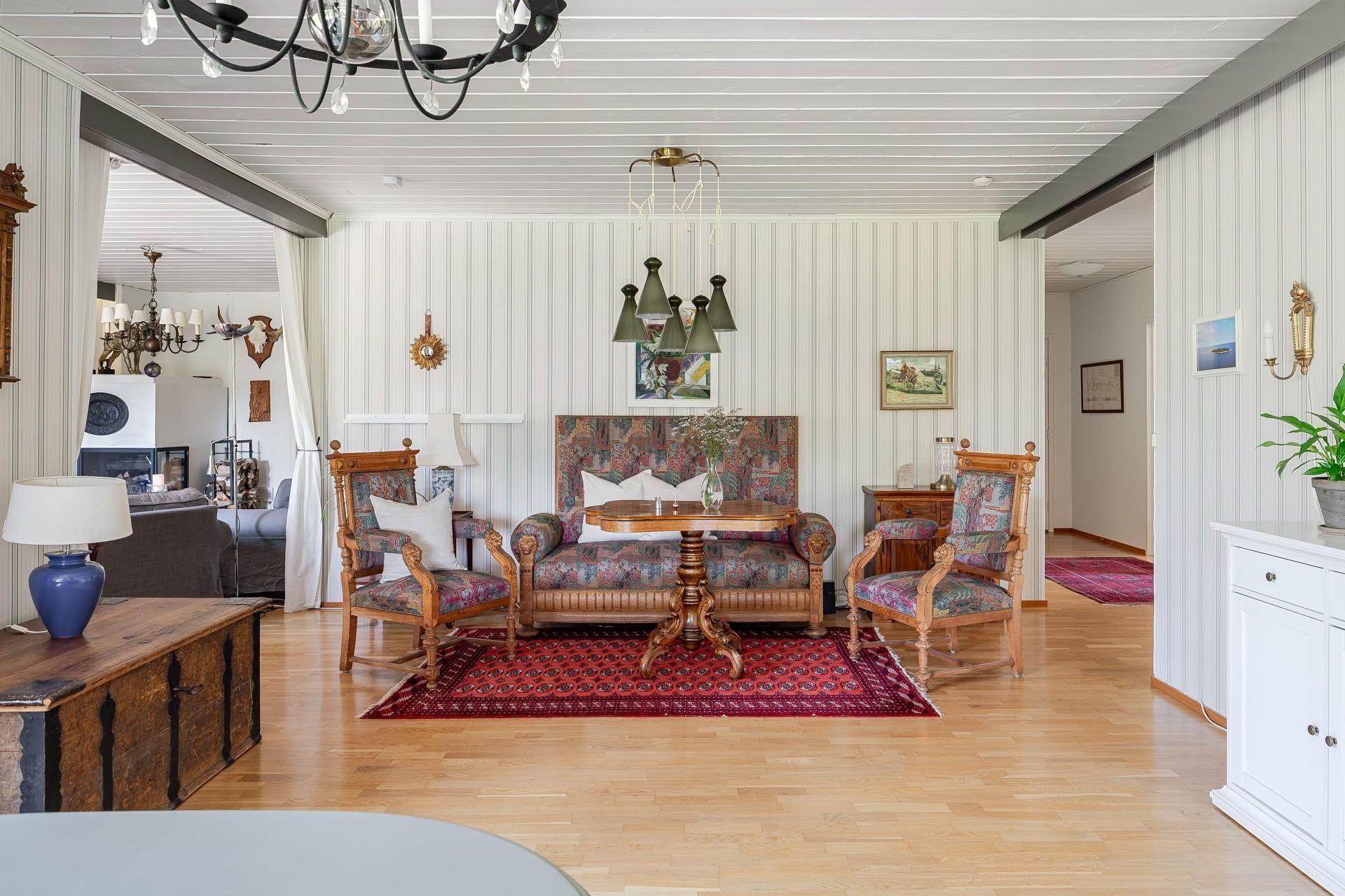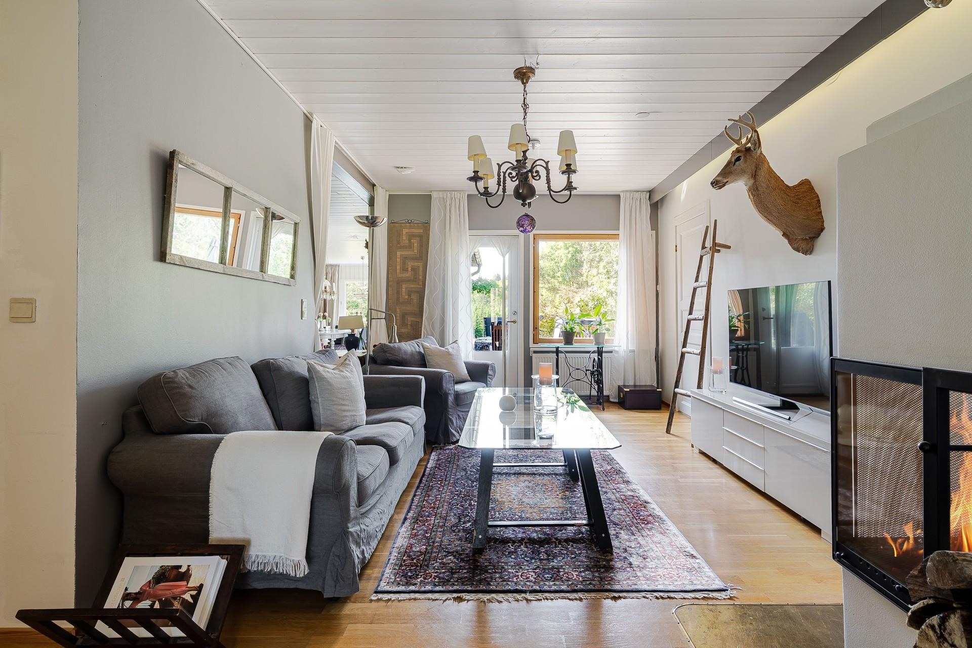 Tämän valloittavan yksitasoisen talon sydän on avara ja valoisa n. 52 m2 olohuone, joka soveltuu isommankin perheen ja ystävien kestitsemiseen Sen lumoava tunnelma syntyy väreistä, laadukkaista materiaaleista ja suuresta ruokailuryhmästä, jonka ääreen on ihana kerääntyä. Olohuoneen yhteydessä on viihtyisä takkahuone, jossa voit nauttia tulen rauhoittavasta loimusta kylminä talvi-iltoina. Normaalia korkeampi huonekorkeus tuo lisää tilantuntua.