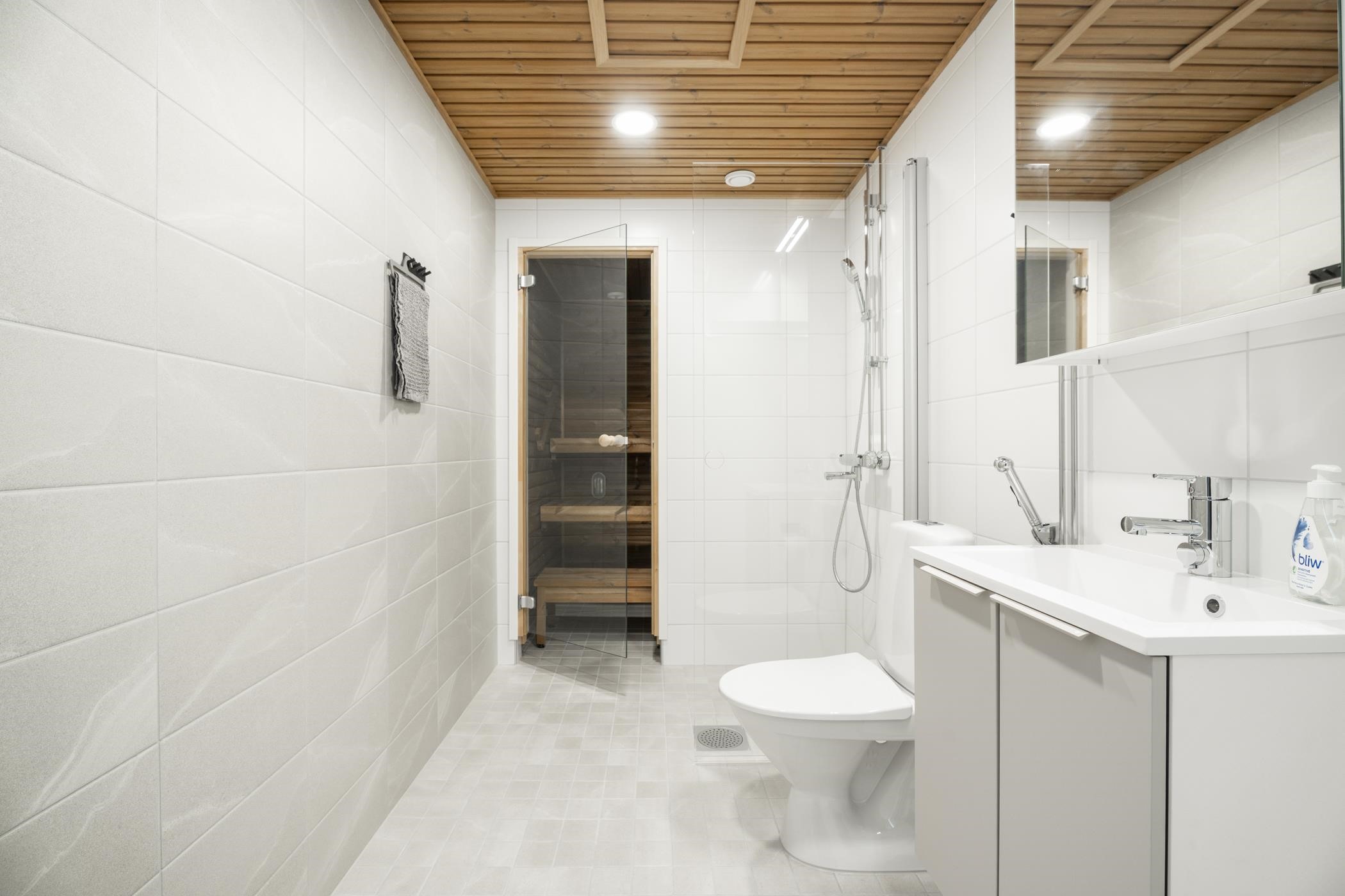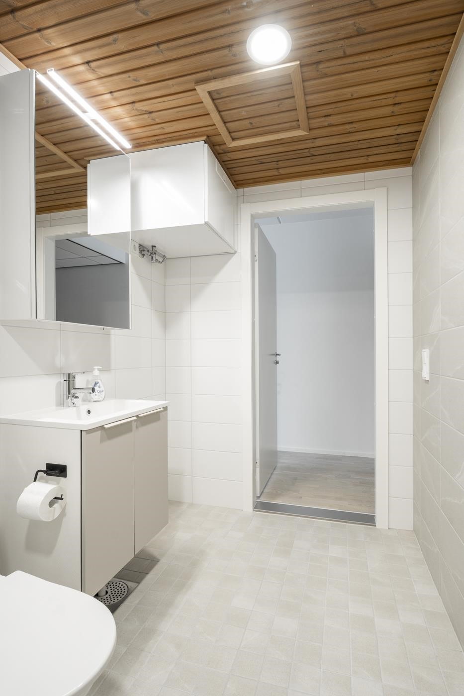 - Kylpyhuoneen lattiat ja seinät ovat laatoitettuja, katto paneloitu. Kylpyhuoneessa on tasoallas ja pesuallaskaappi sekä sen yläpuolella peilikaappi. Kylpyhuoneessa on pyykinpesukoneliitäntä ja varaus päällekkäiselle kuivausrummulle. Saunan lattia on laatoitettu, seinät ja katto paneloituja. Laudetasot ja askelmat ovat mäntyä, tukirakenteena on höylätty havupuu. Saunan ovi on kokolasinen.