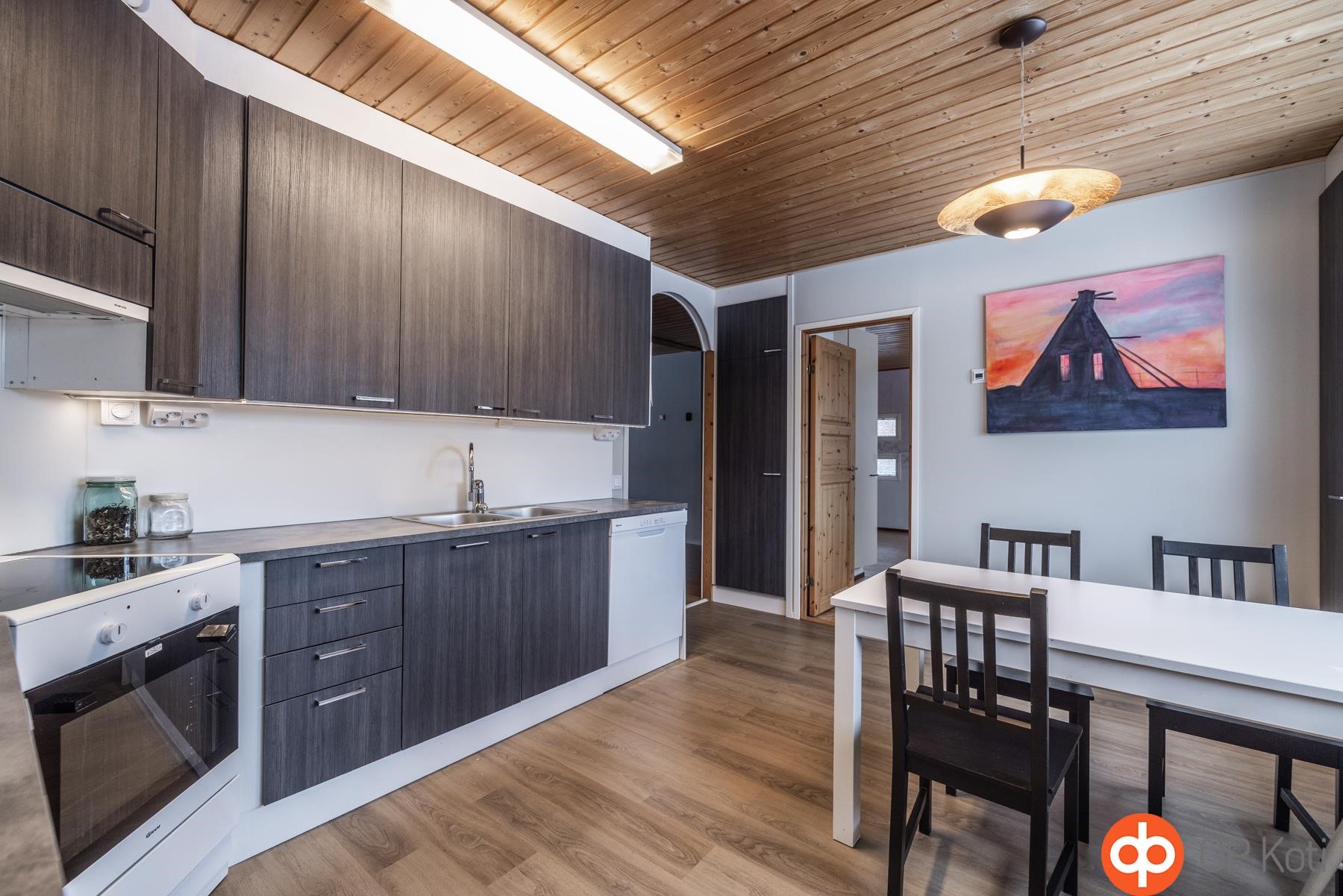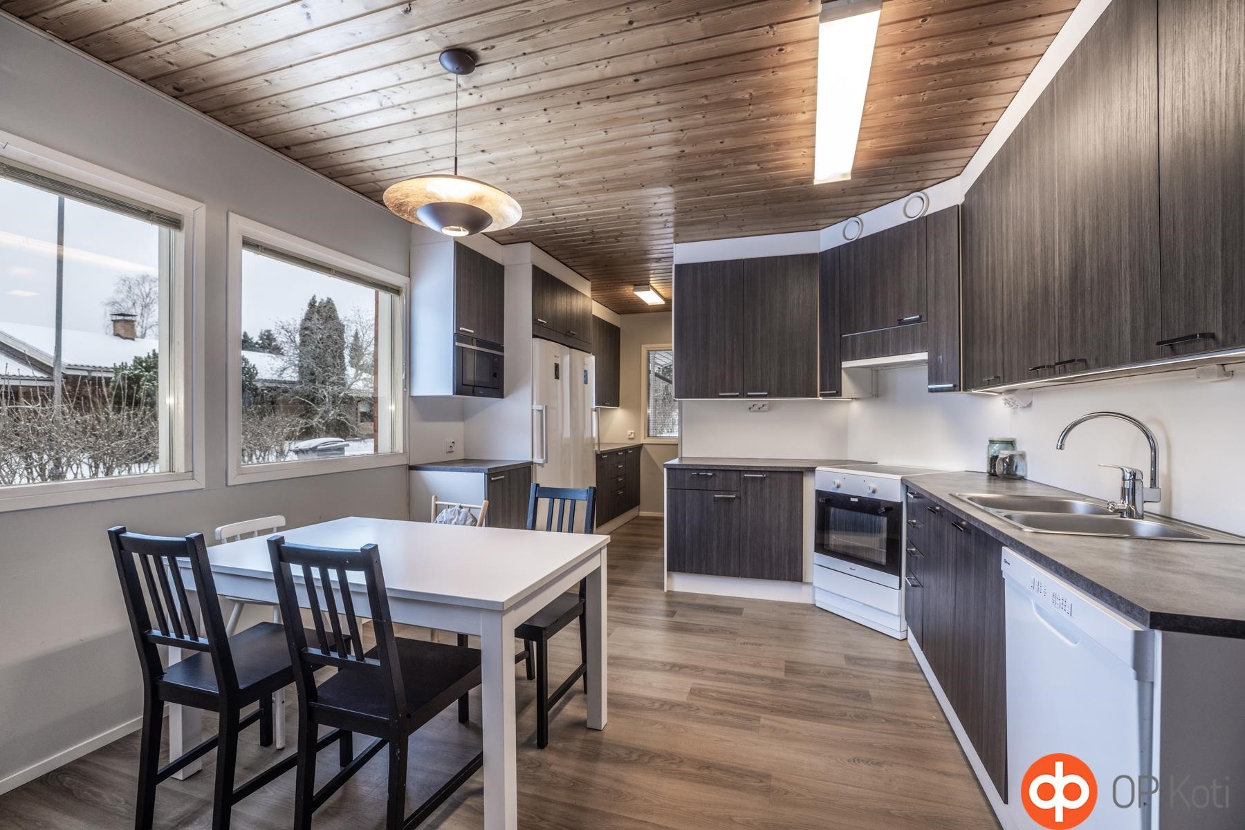 - Jääkaappi, pakastekaappi, keraaminen liesi, liesituuletin, astianpesukone, kaapistot, kiinteät valaisimet, pöytätasojen materiaali Laminaatti.