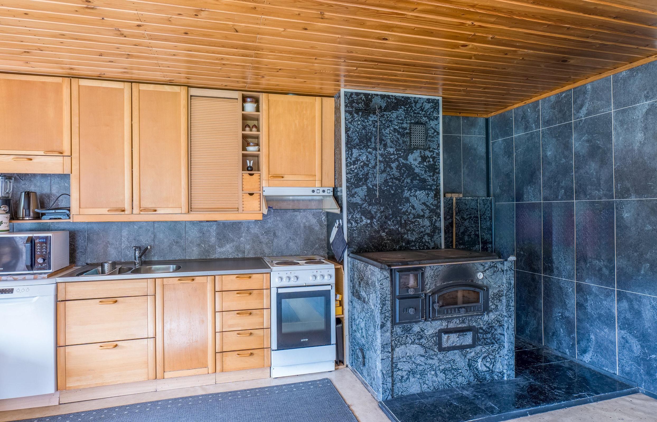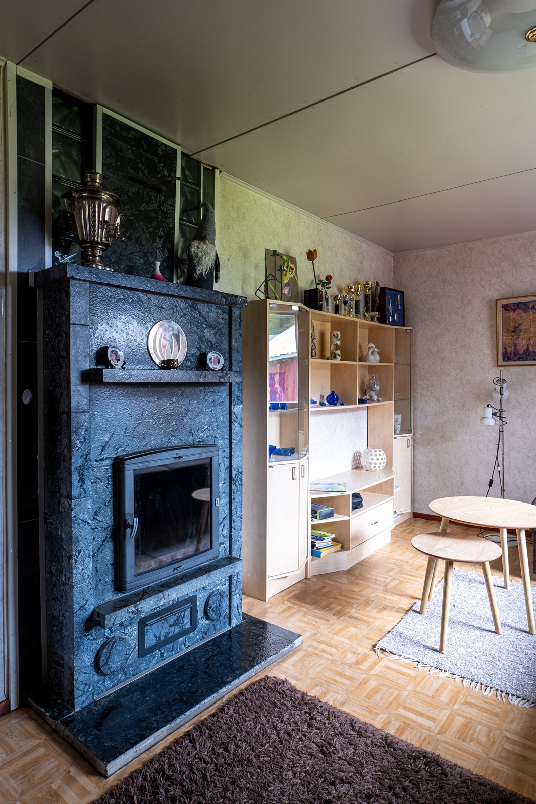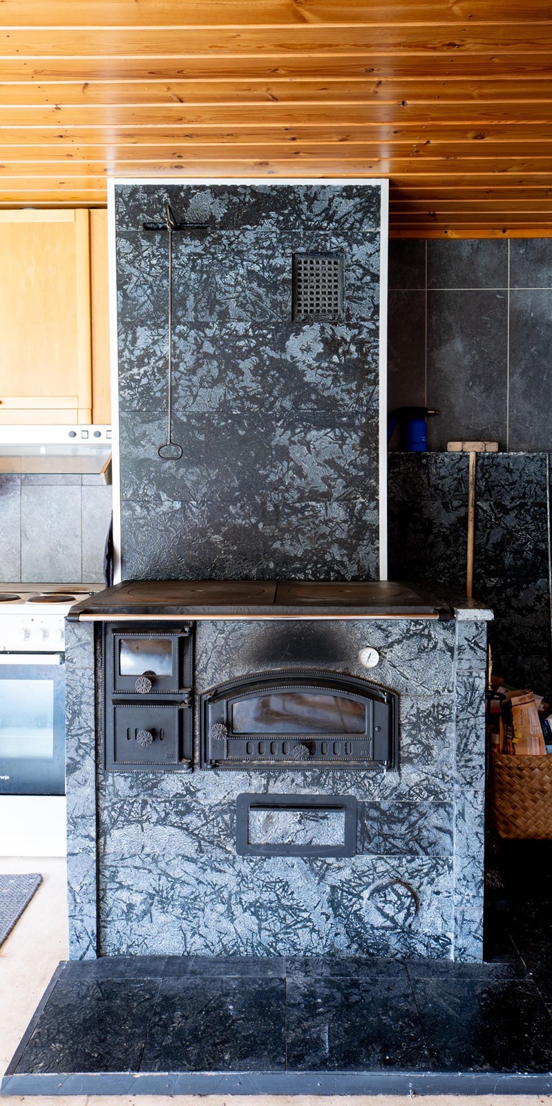 Lämmityksessä yhdistyvät perinteet ja nykyaika. Pattereiden lisäksi kodissa on varaava vuolukivinen takka-leivinuuni, joka pitää tuvan lämpimänä talviaikoina. Makuuhuoneita lämmittää tunnelmallinen takka, joka sijaitsee huoneita erottavan seinän keskellä ja jakaa lämpöä molempiin suuntiin. Etäohjattava ilmalämpöpumppu takkatoiminnolla on tälläiseen tilaan juurioikea valinta.