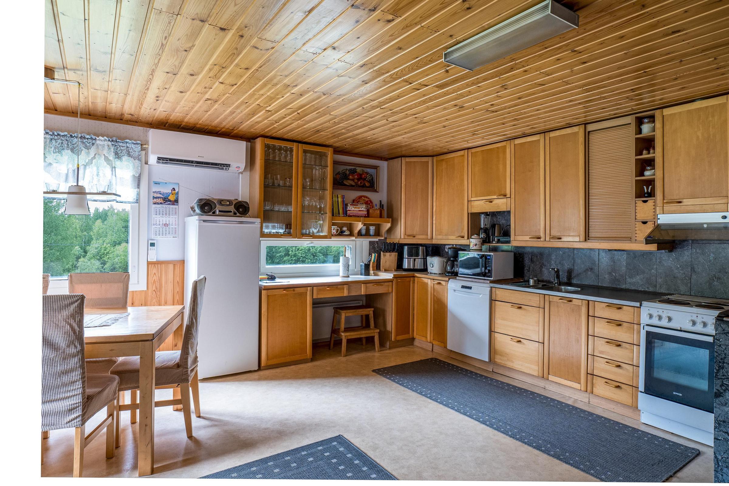 - Jääkaappi, pakastekaappi Eteisessä, sähköliesi, liesituuletin, leivinuuni, astianpesukone, kaapistot, kiinteät valaisimet välitilavalaiset/Laitettu tänä keväänä.